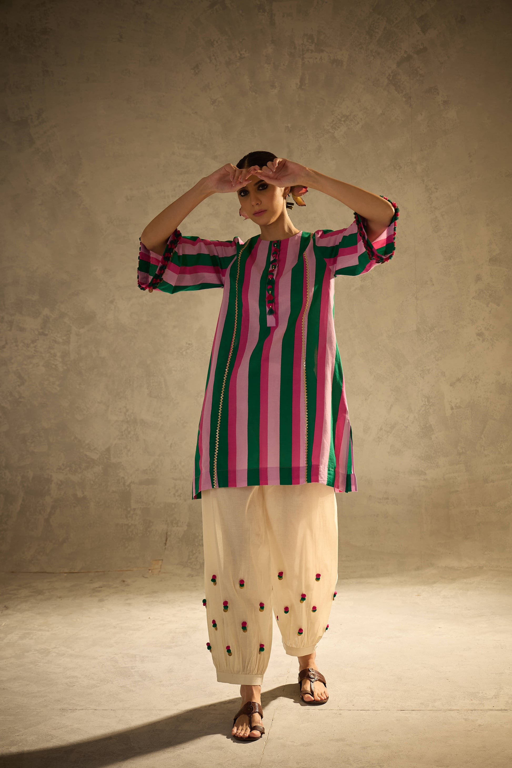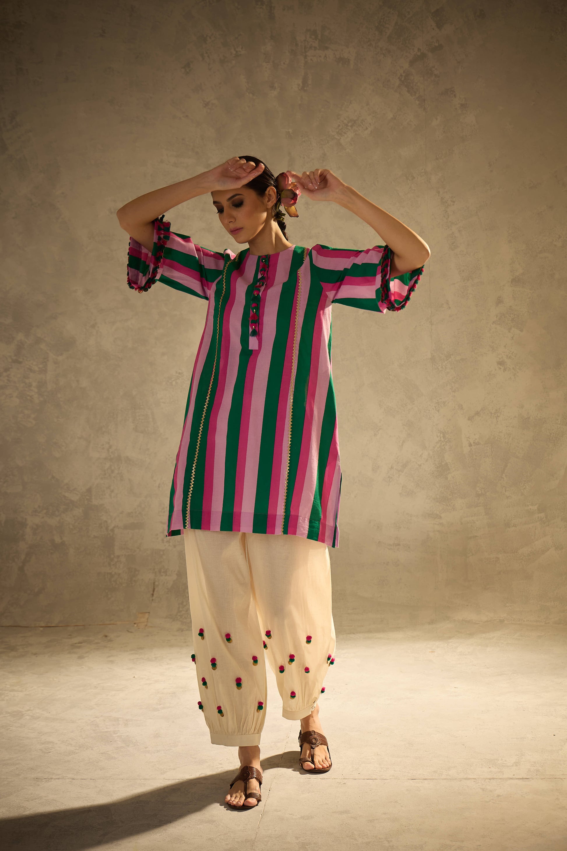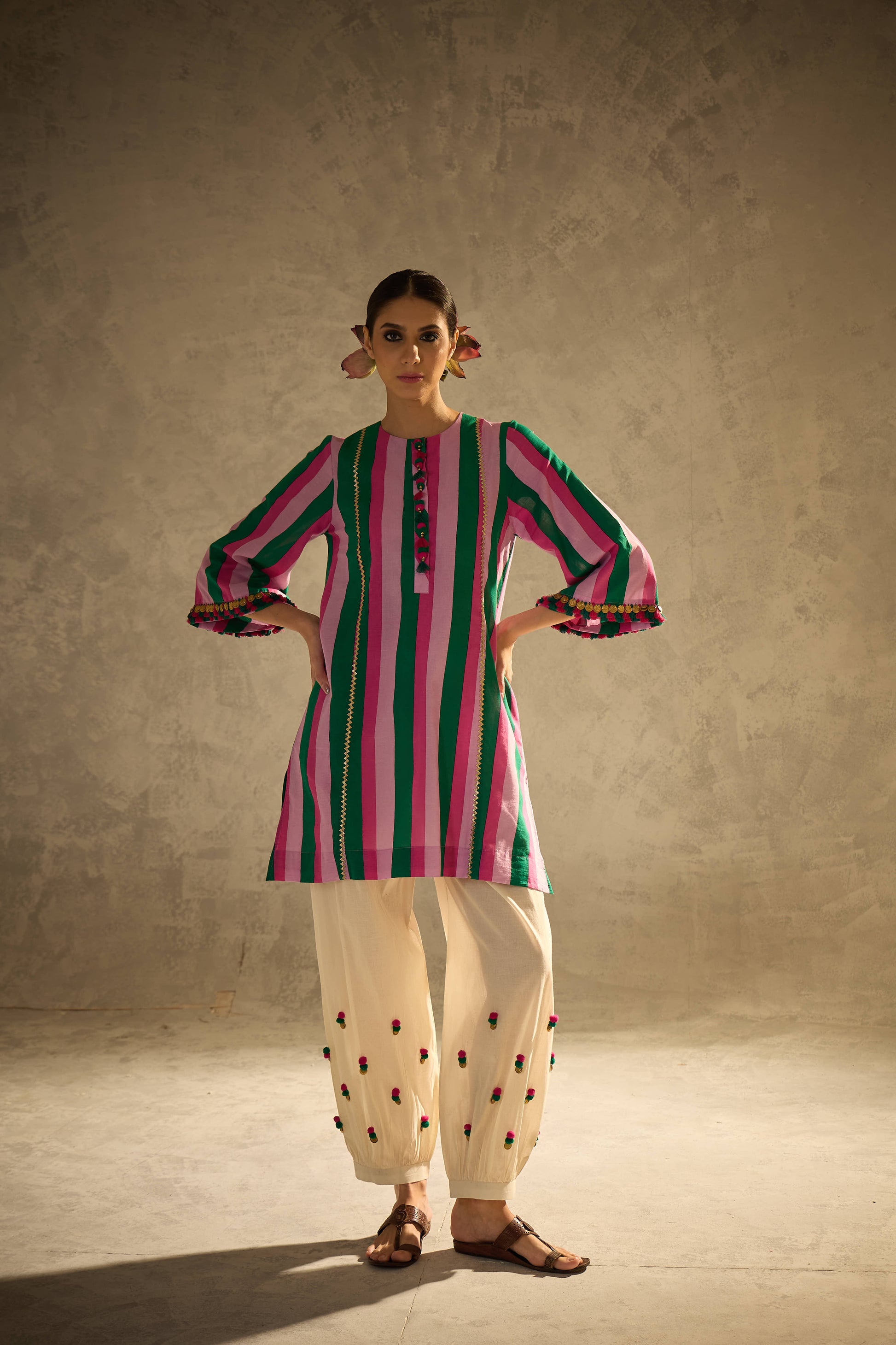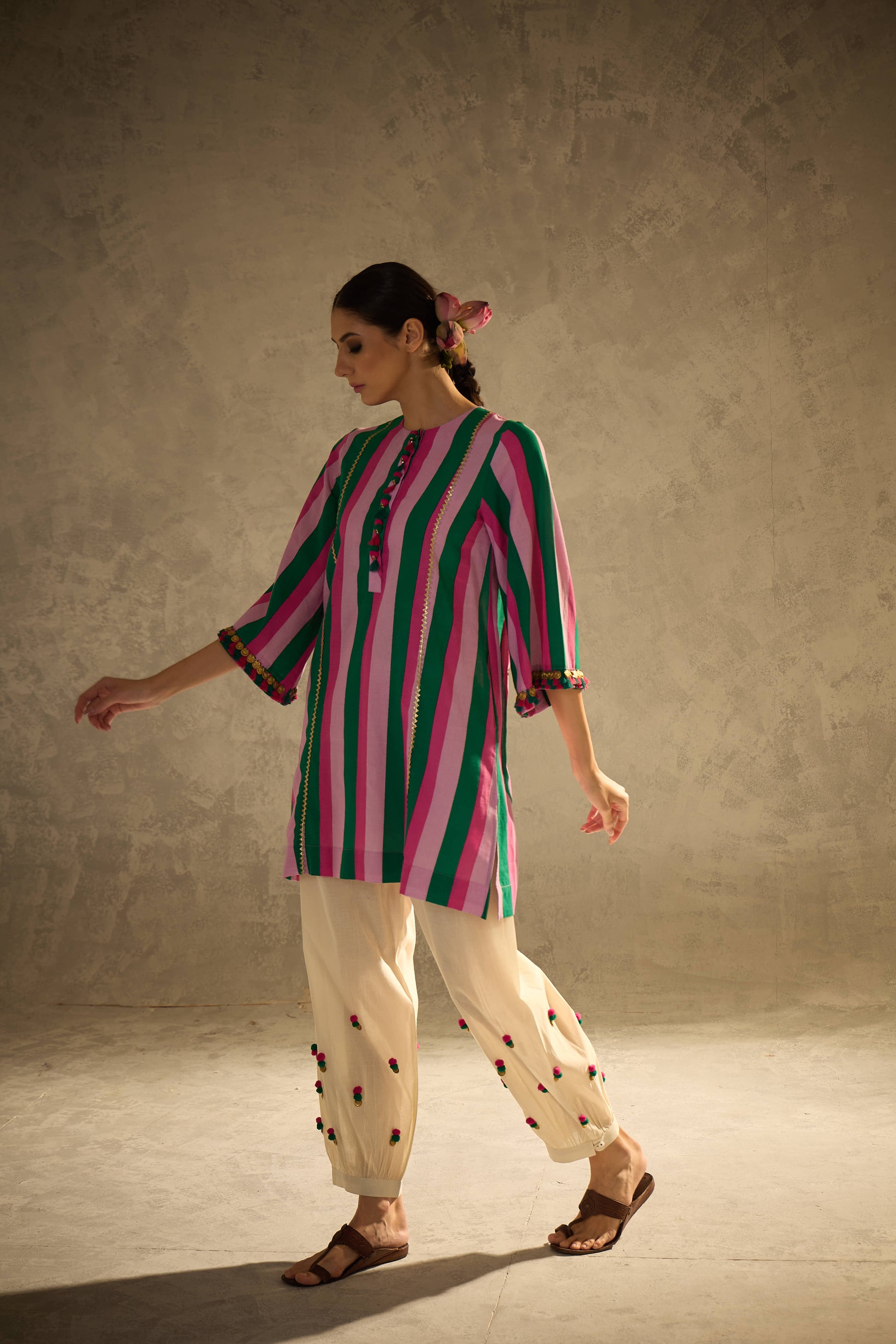 Crafted from breathable cotton-cambric, this kurta set features bold, playful stripes. The kurta is detailed with tassels on the sleeves, while the pants are accented with vibrant pom-pom trims.