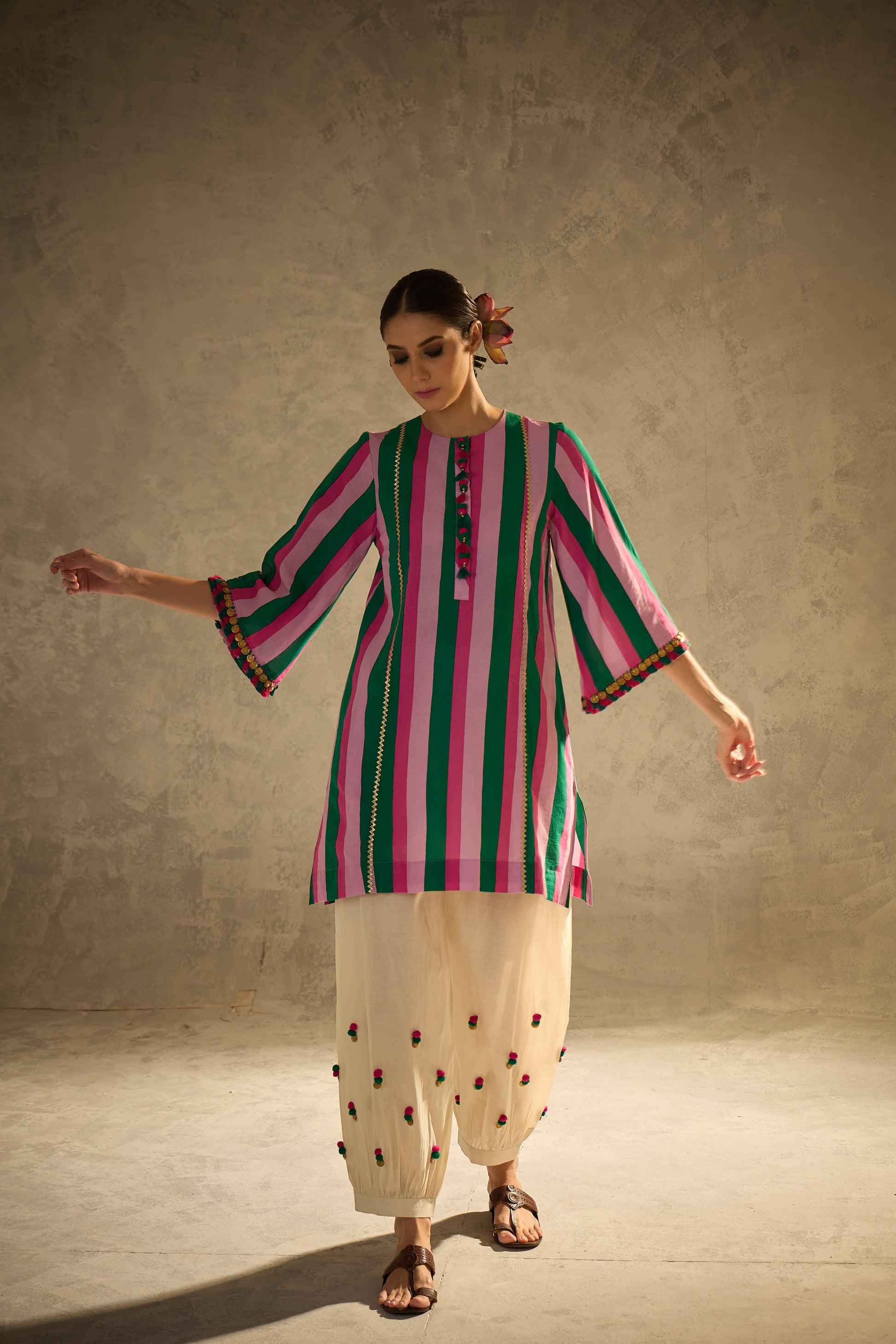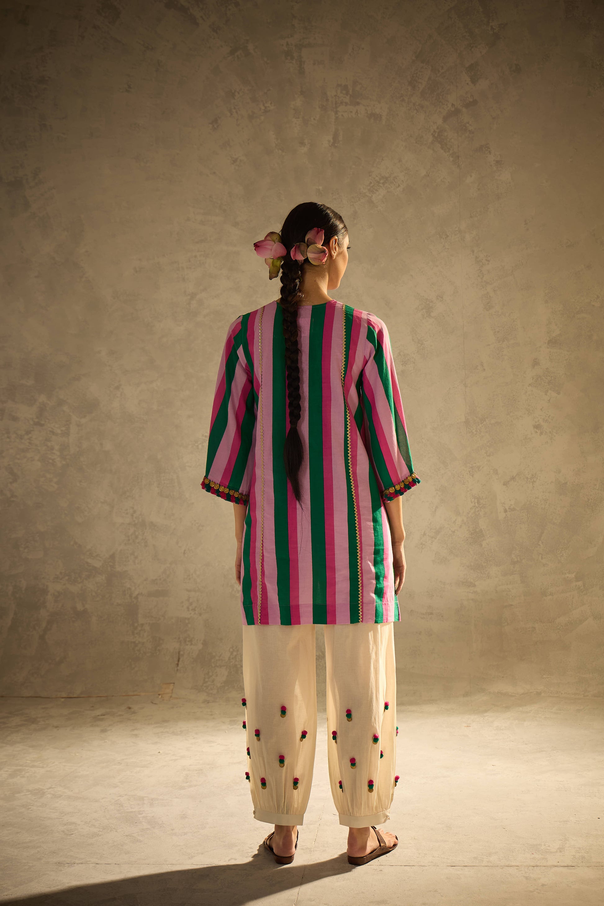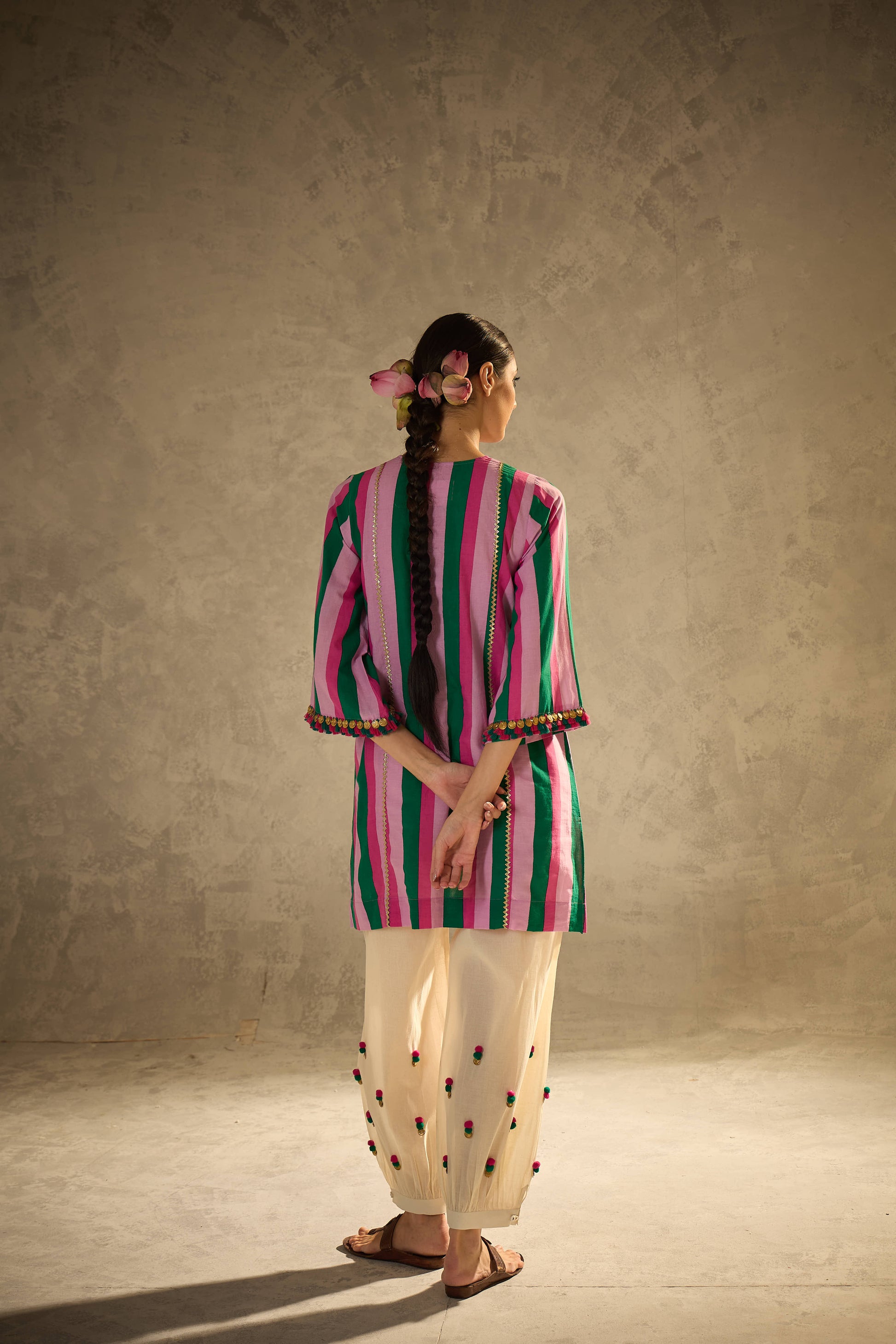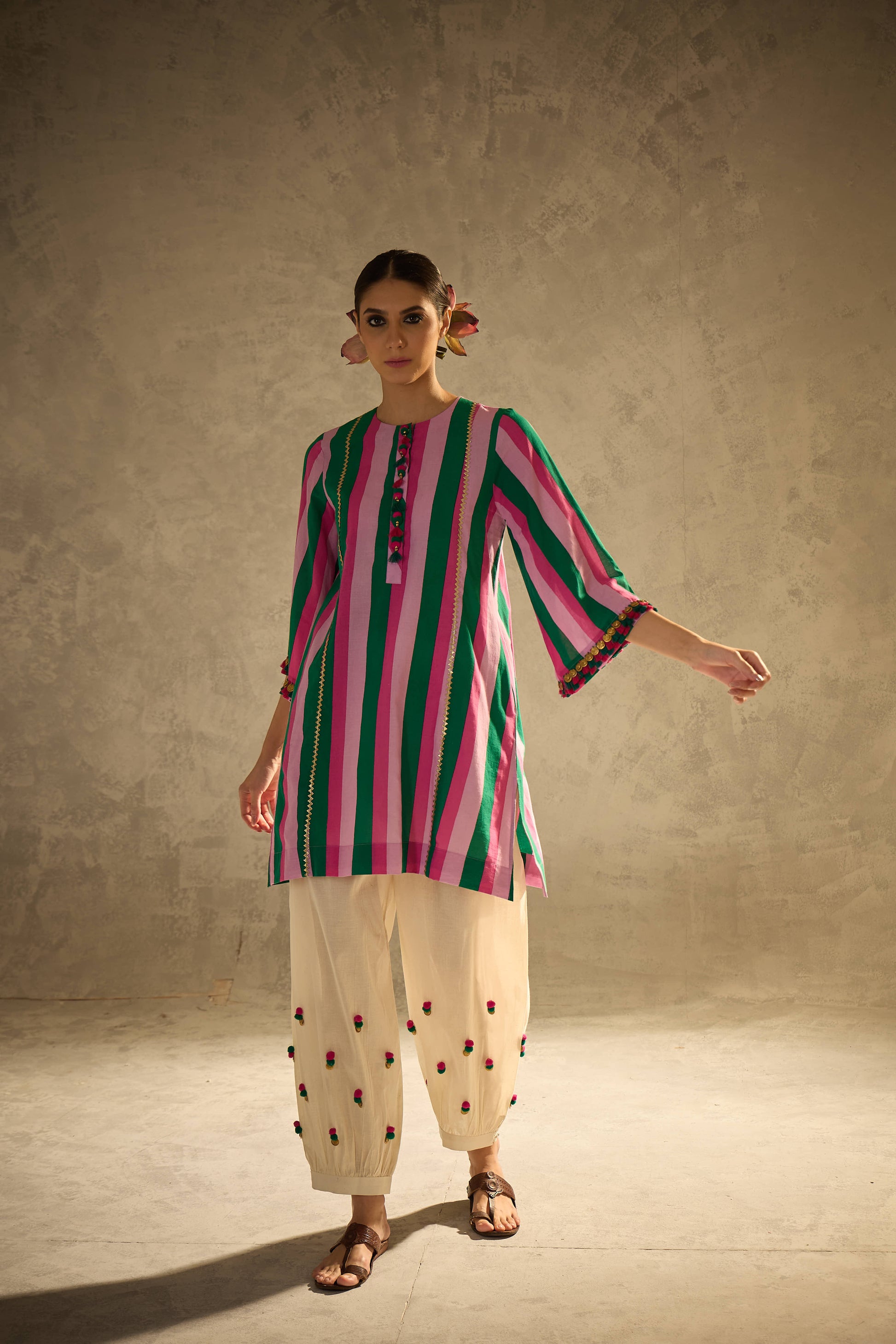 Crafted from breathable cotton-cambric, this kurta set features bold, playful stripes. The kurta is detailed with tassels on the sleeves, while the pants are accented with vibrant pom-pom trims.