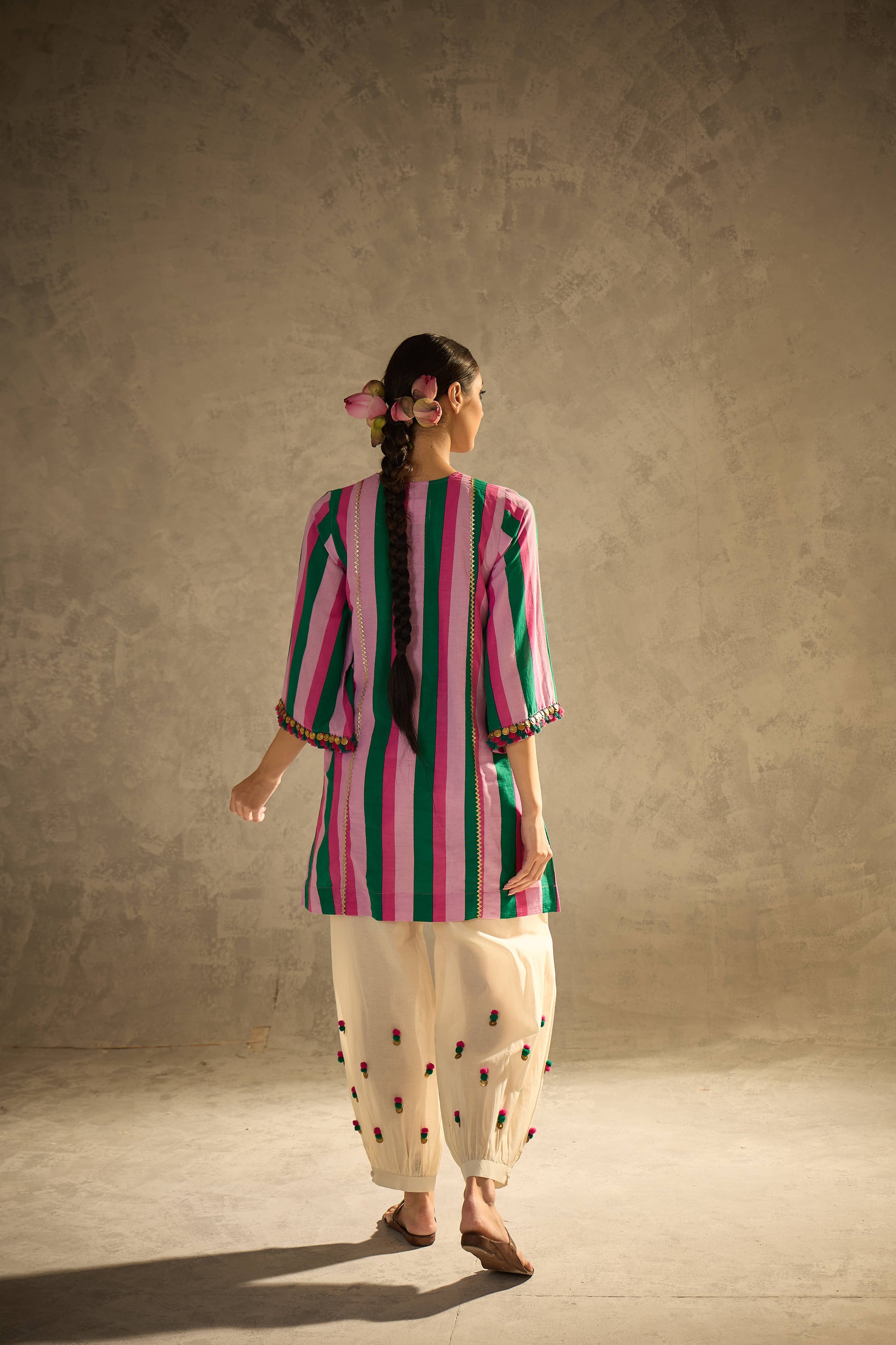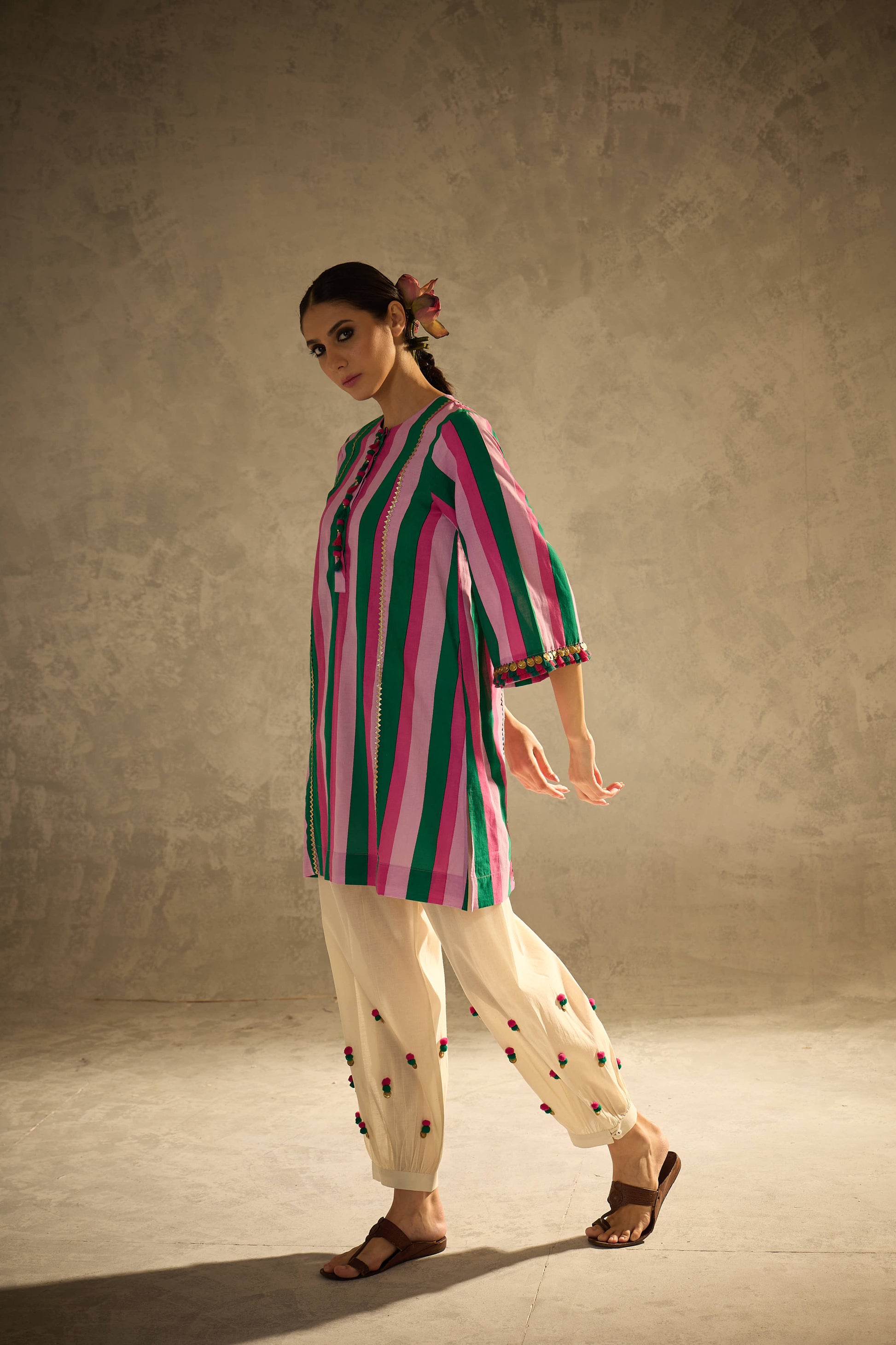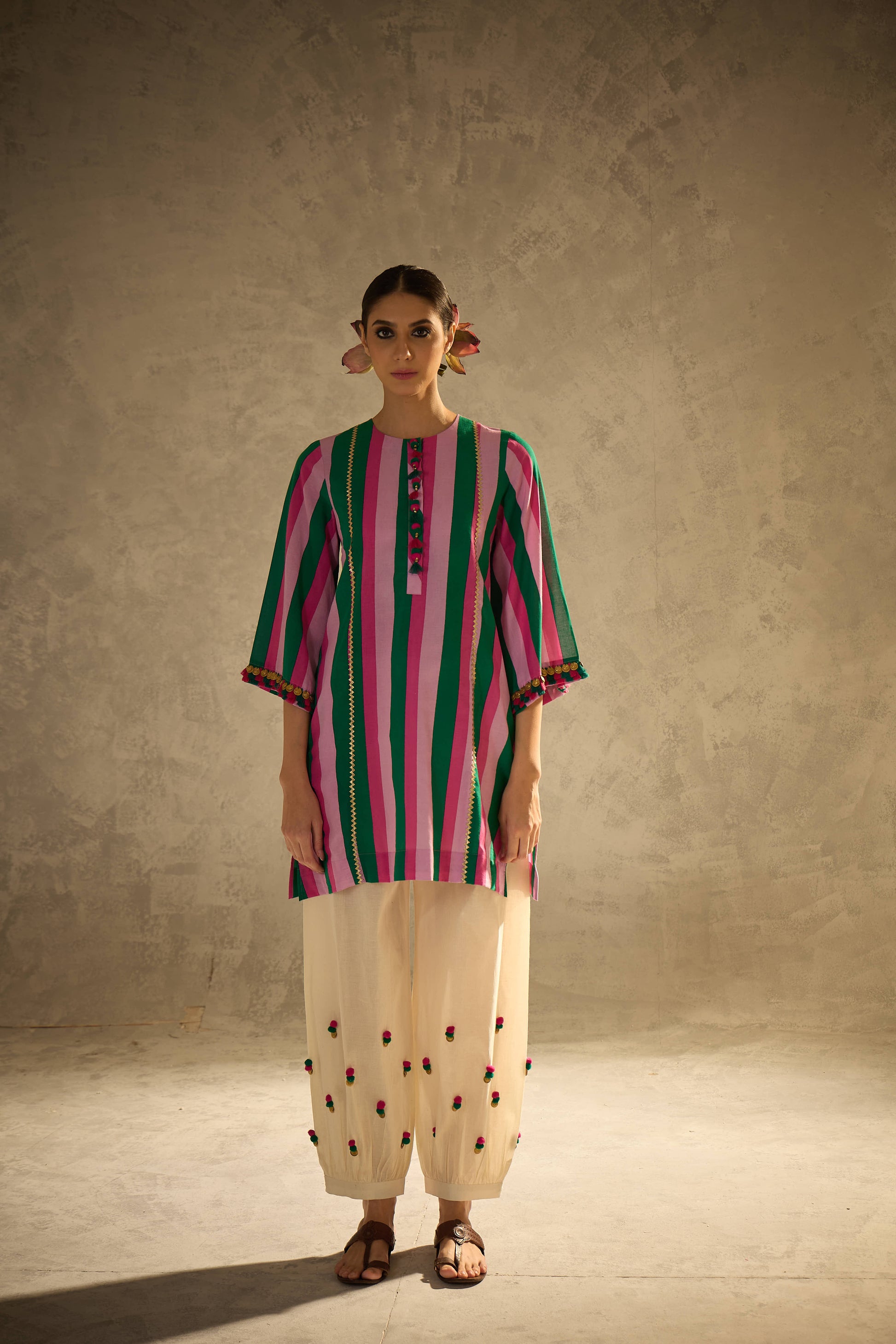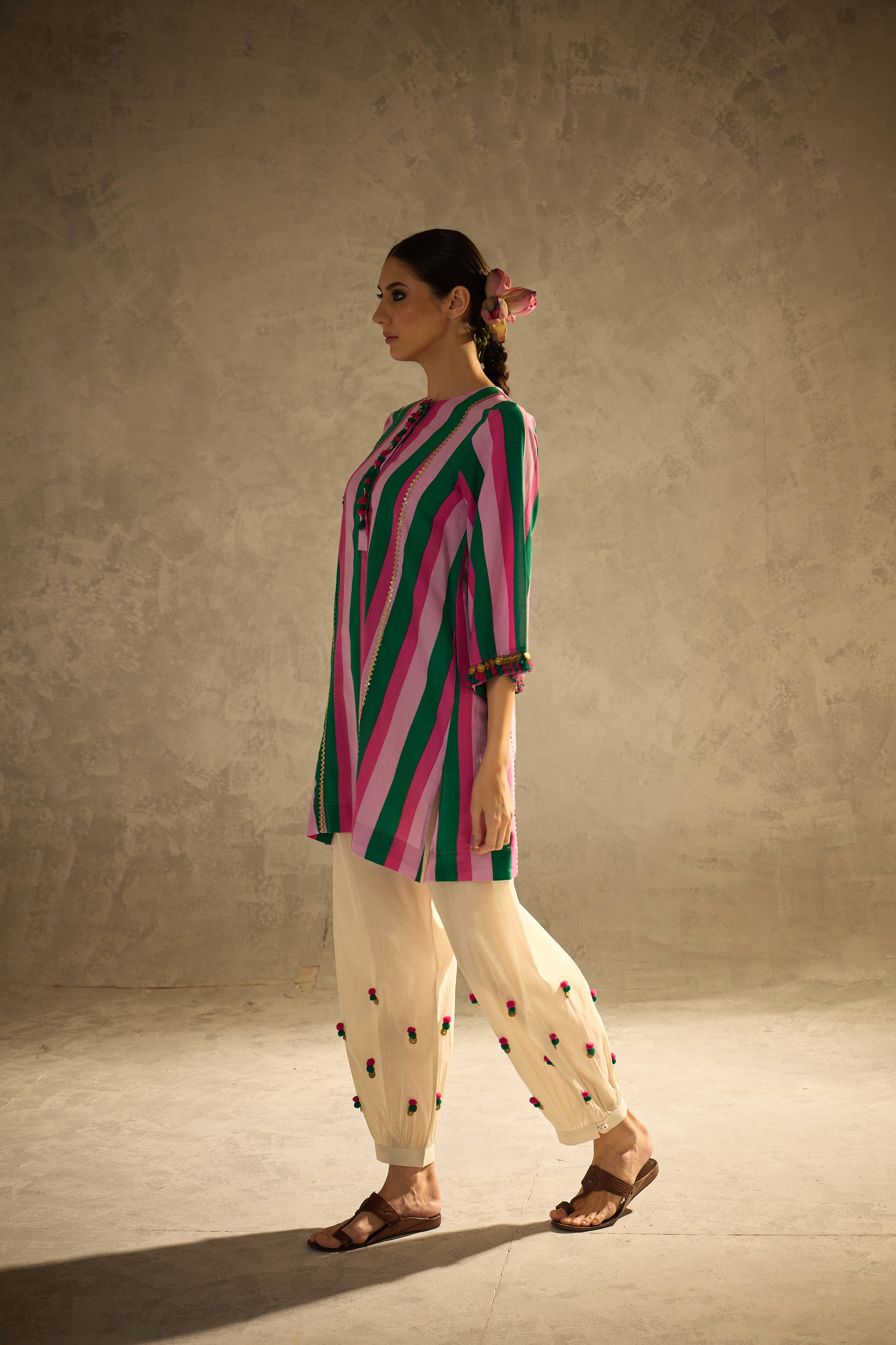 Crafted from breathable cotton-cambric, this kurta set features bold, playful stripes. The kurta is detailed with tassels on the sleeves, while the pants are accented with vibrant pom-pom trims.