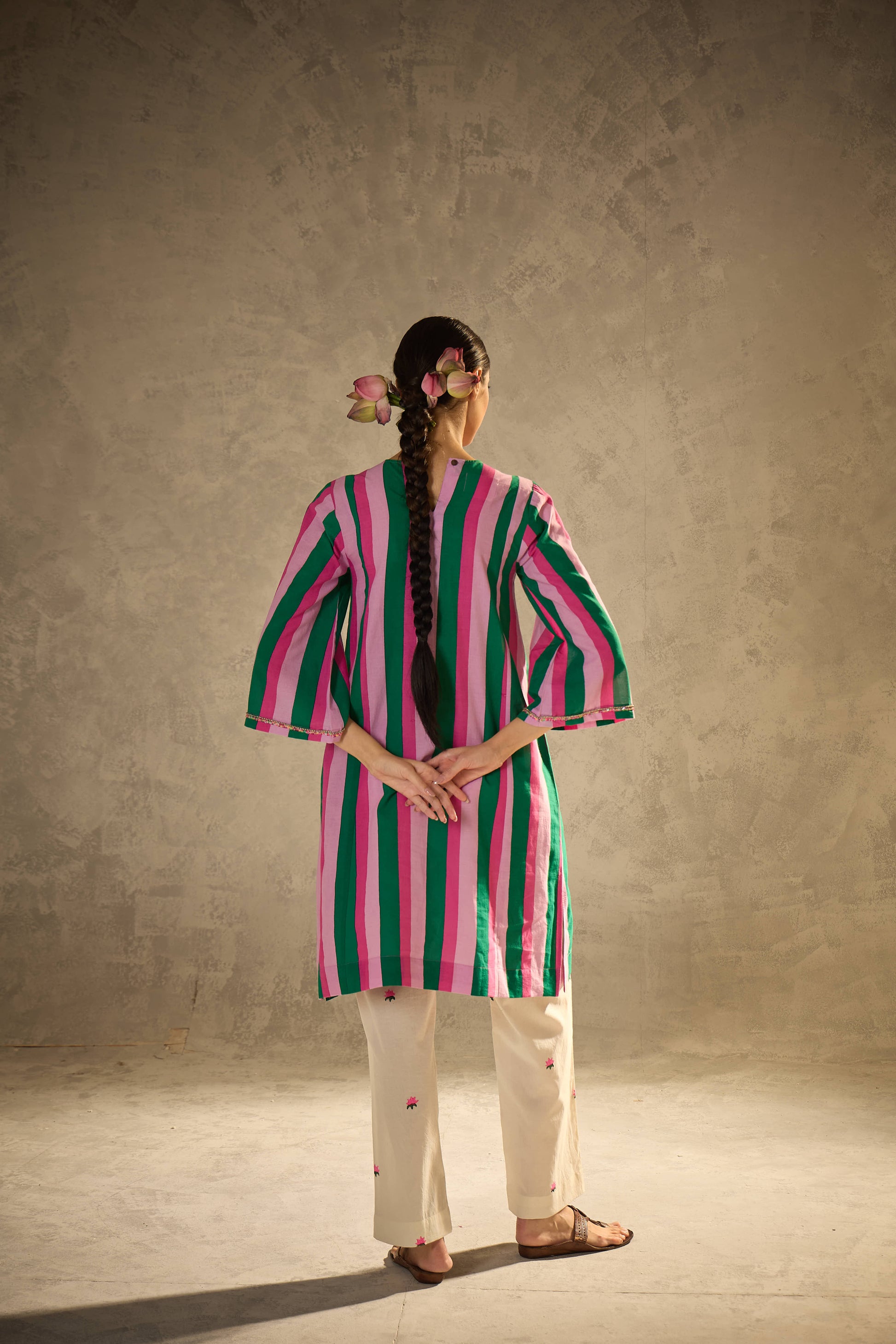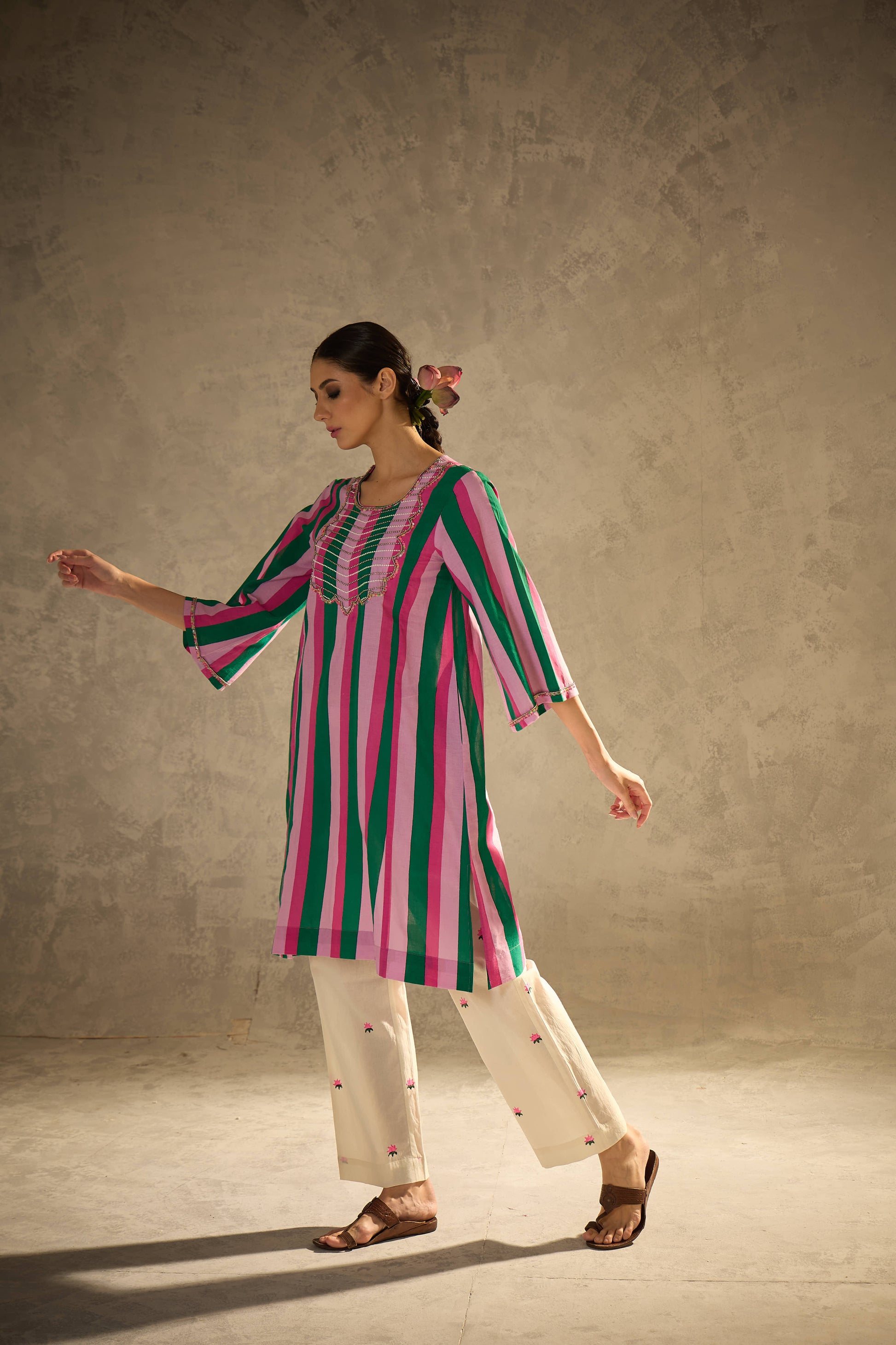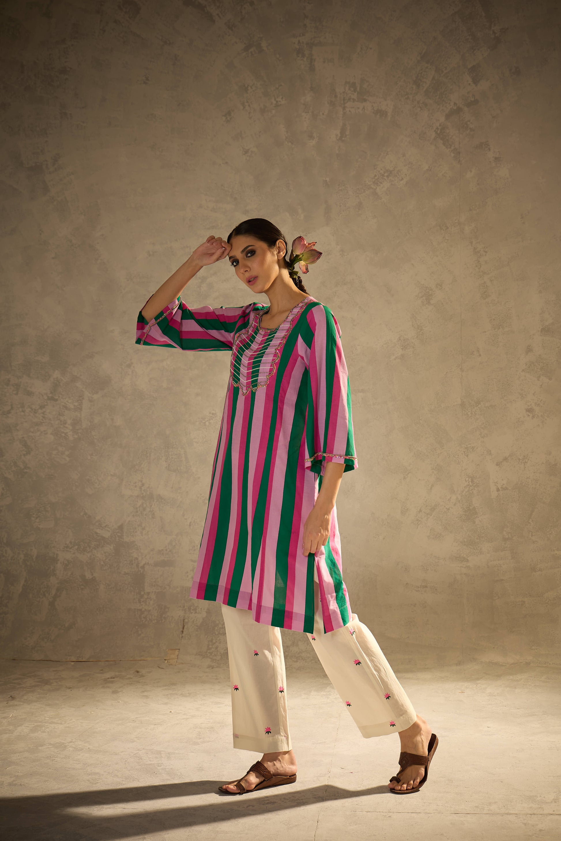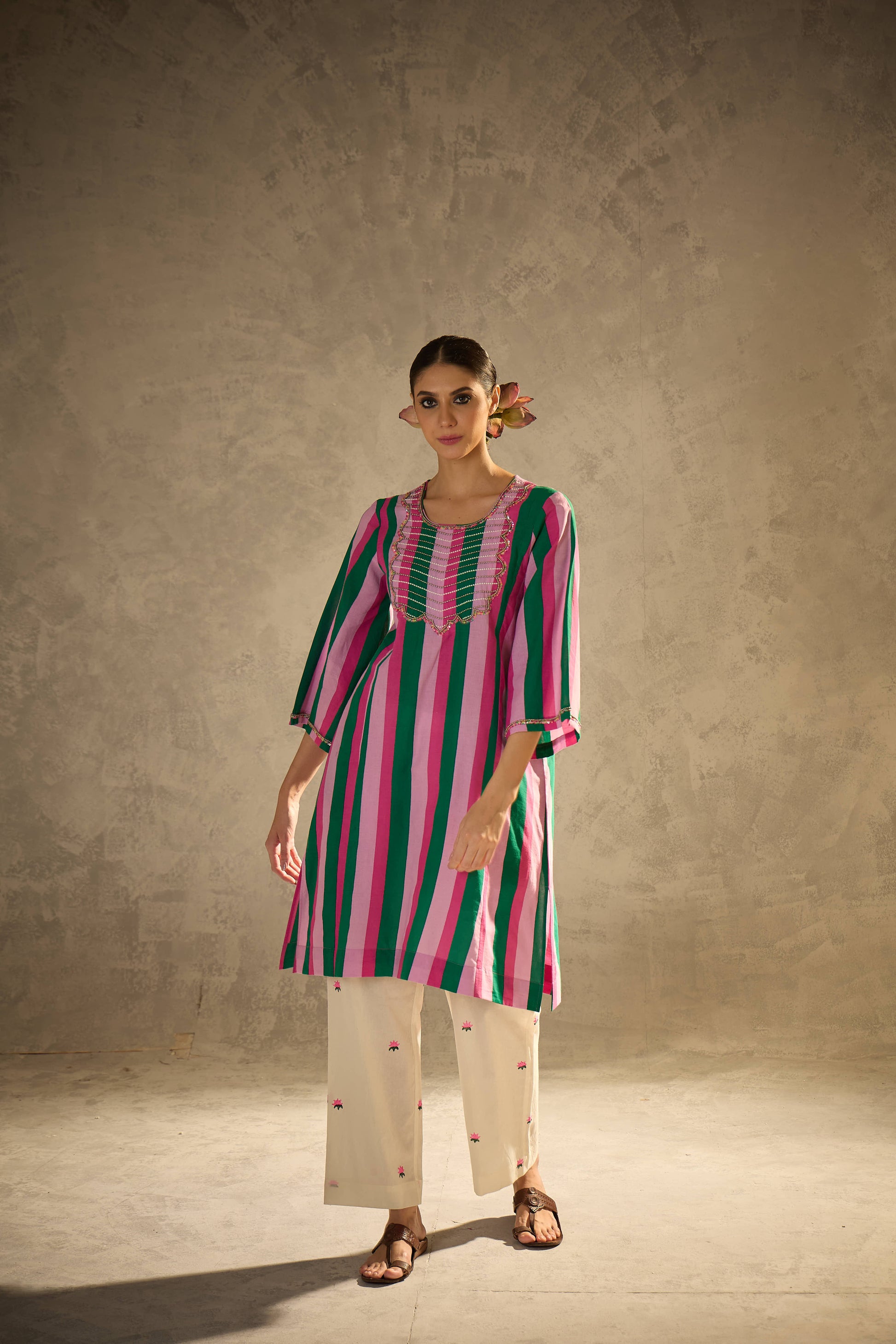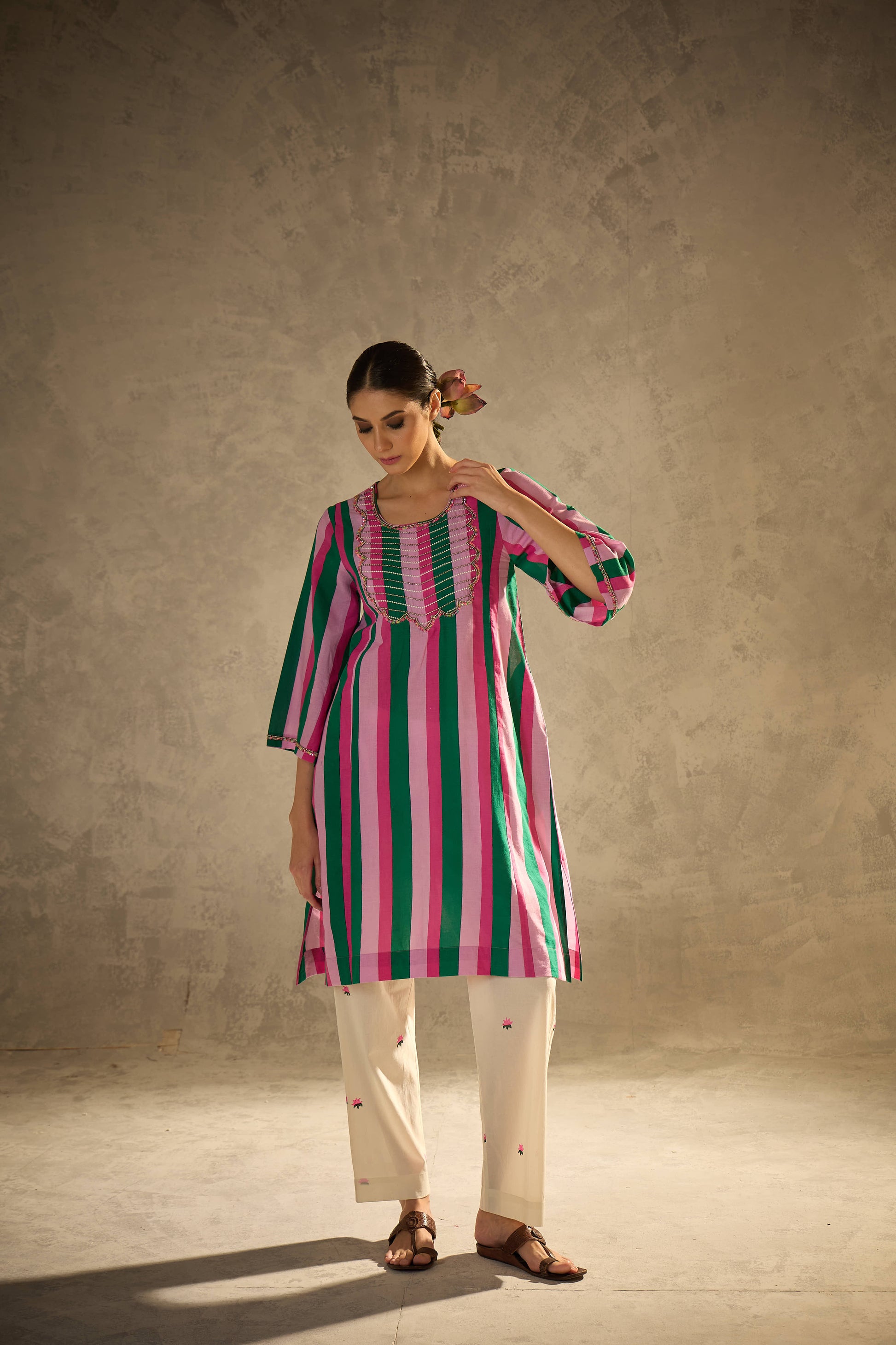 Crafted in soft, breathable cotton-cambric, this kurta set features playful stripes and rich embellishment. The kurta boasts intricate sequin and bead work on the yoke and sleeves. The pants are straight-cut with delicate lotus block prints.