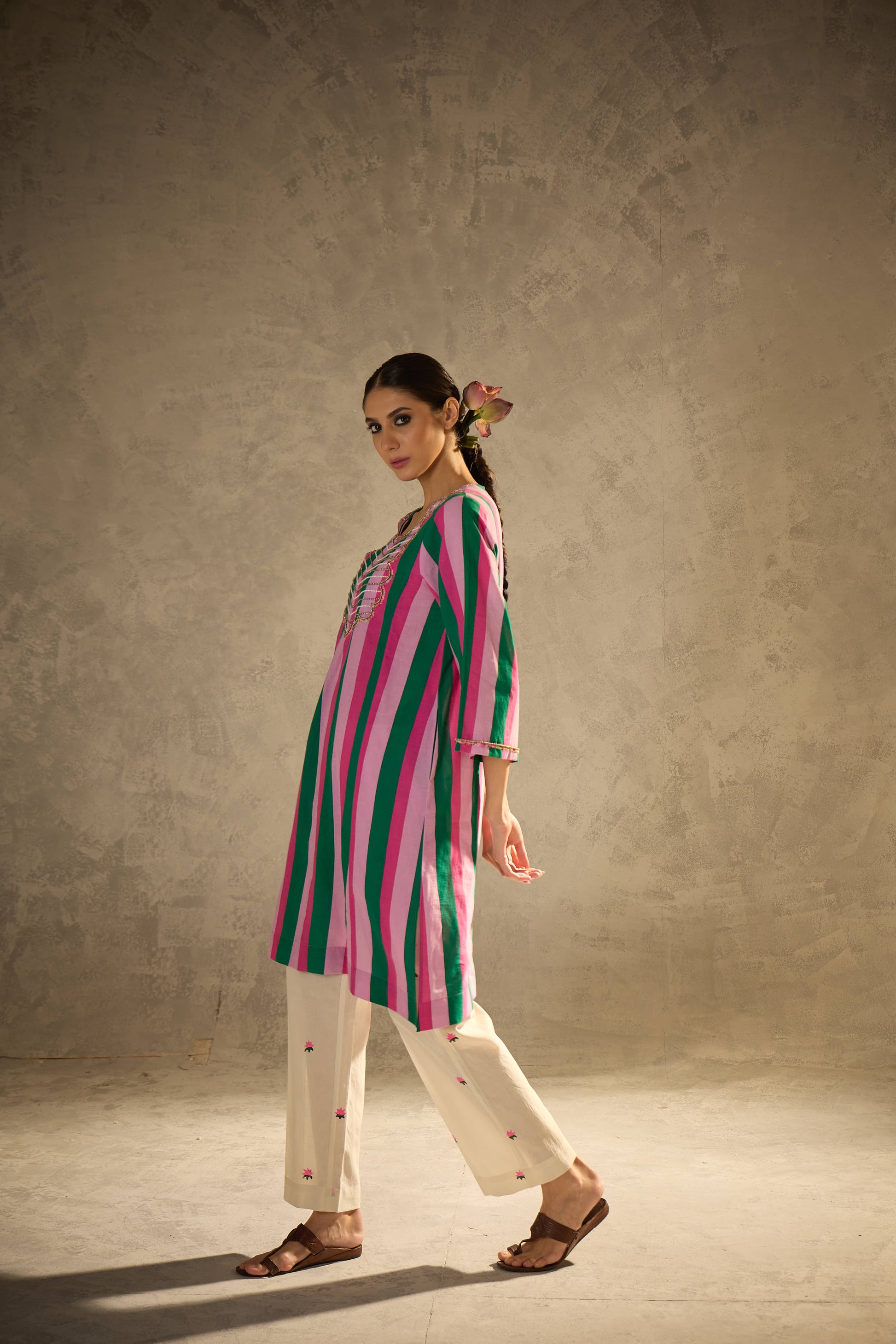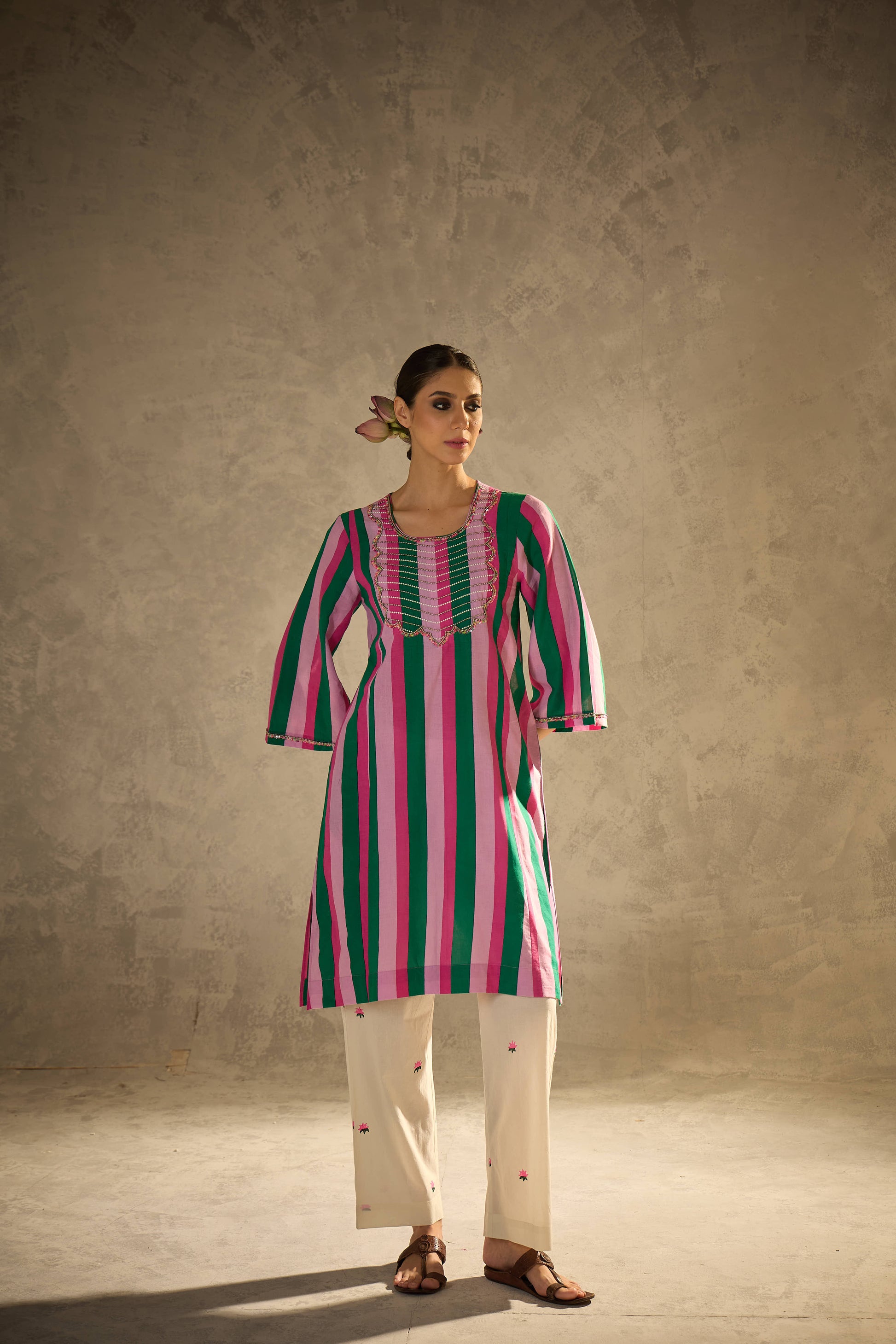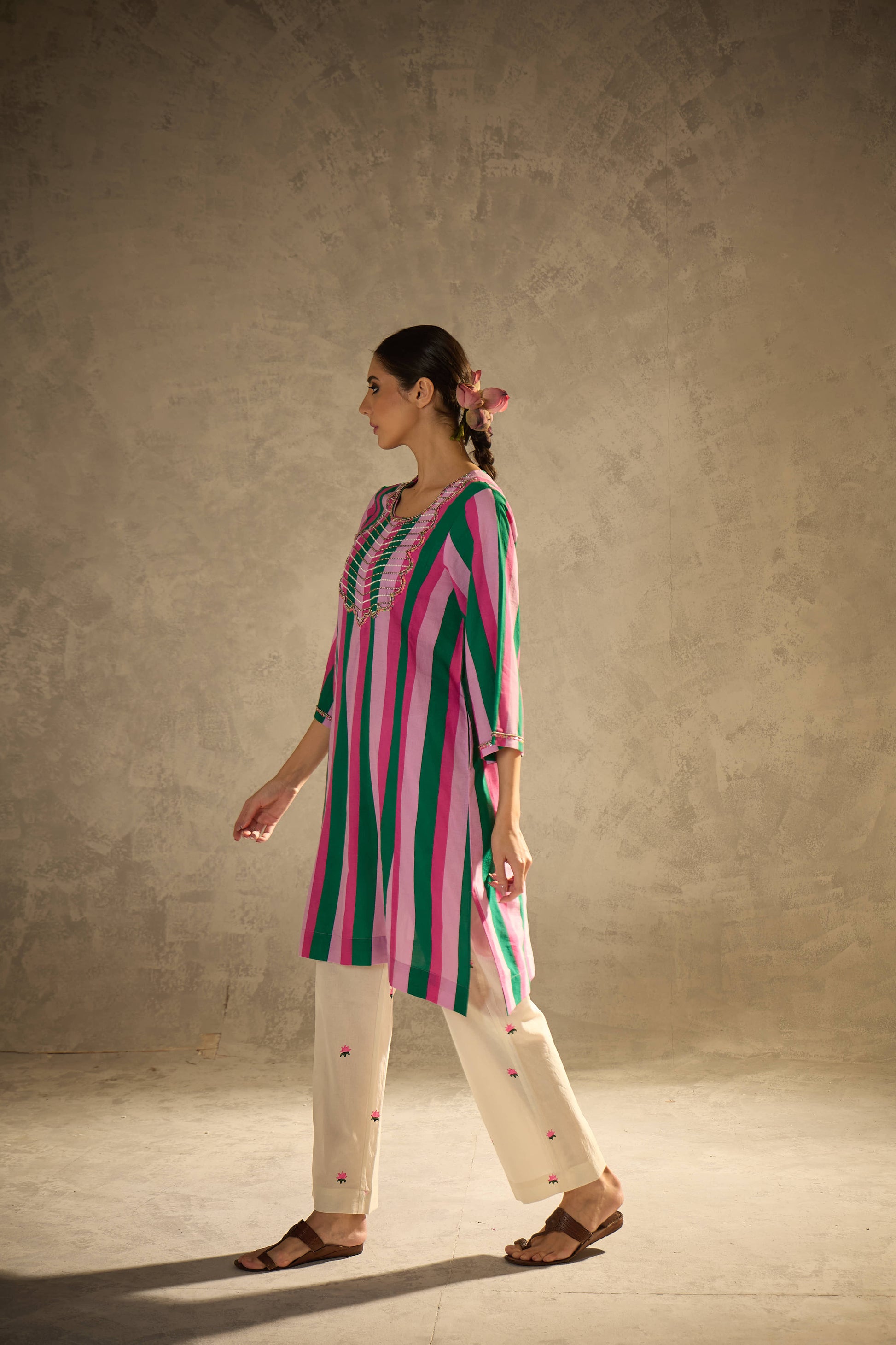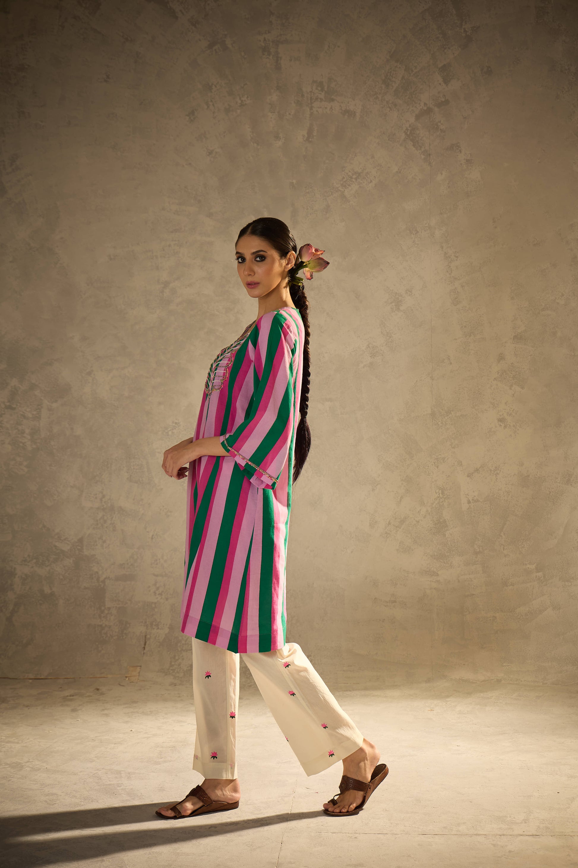 Crafted in soft, breathable cotton-cambric, this kurta set features playful stripes and rich embellishment. The kurta boasts intricate sequin and bead work on the yoke and sleeves. The pants are straight-cut with delicate lotus block prints.