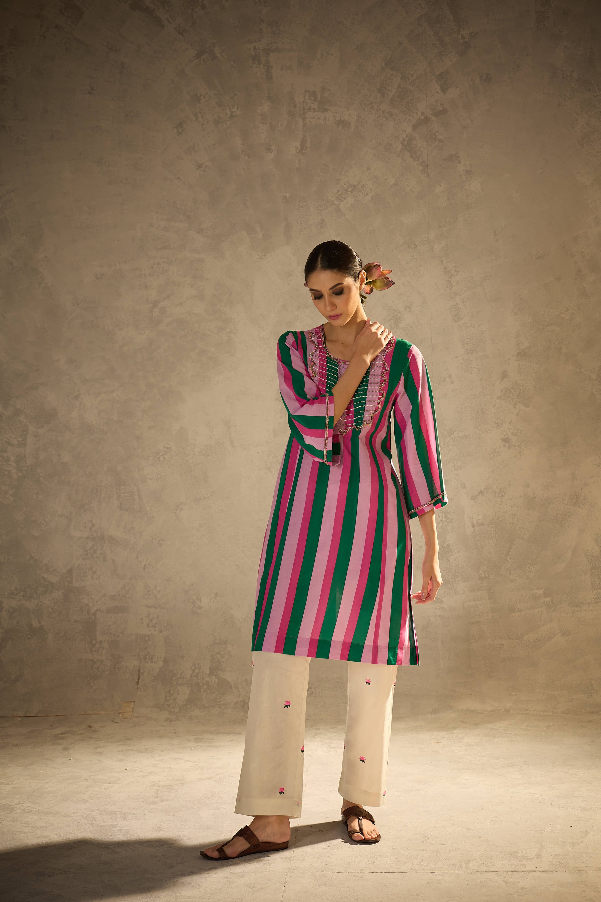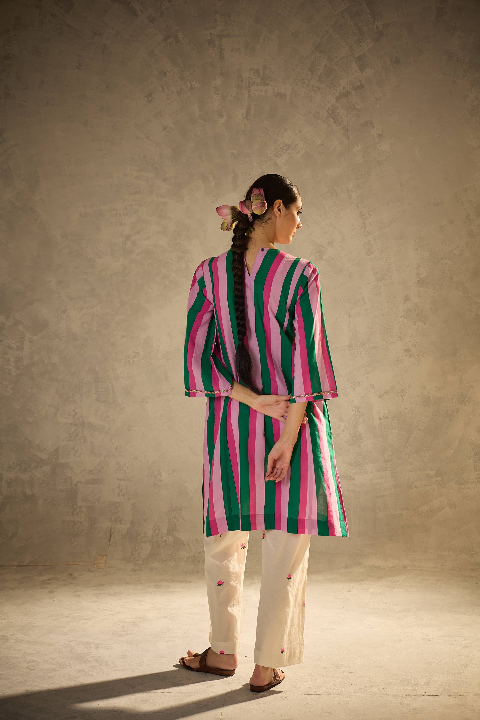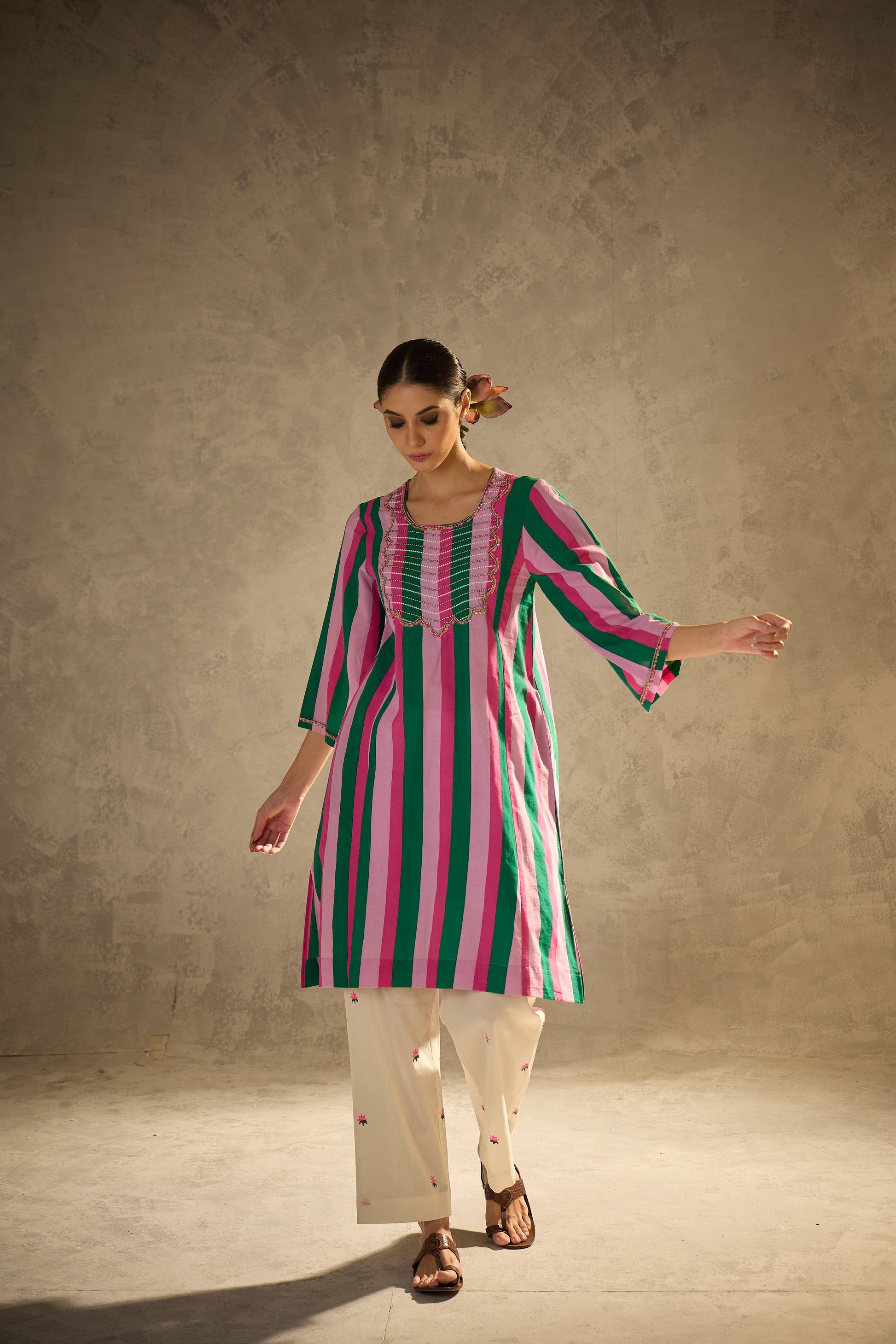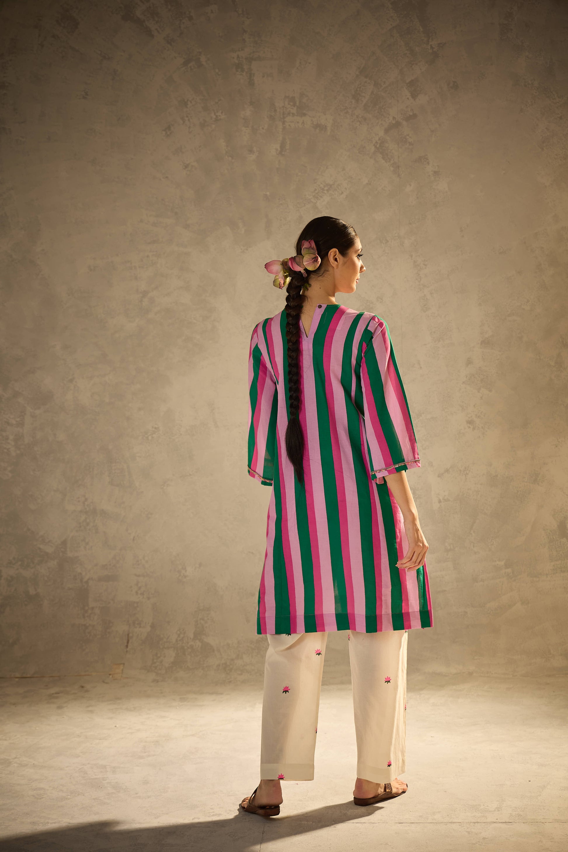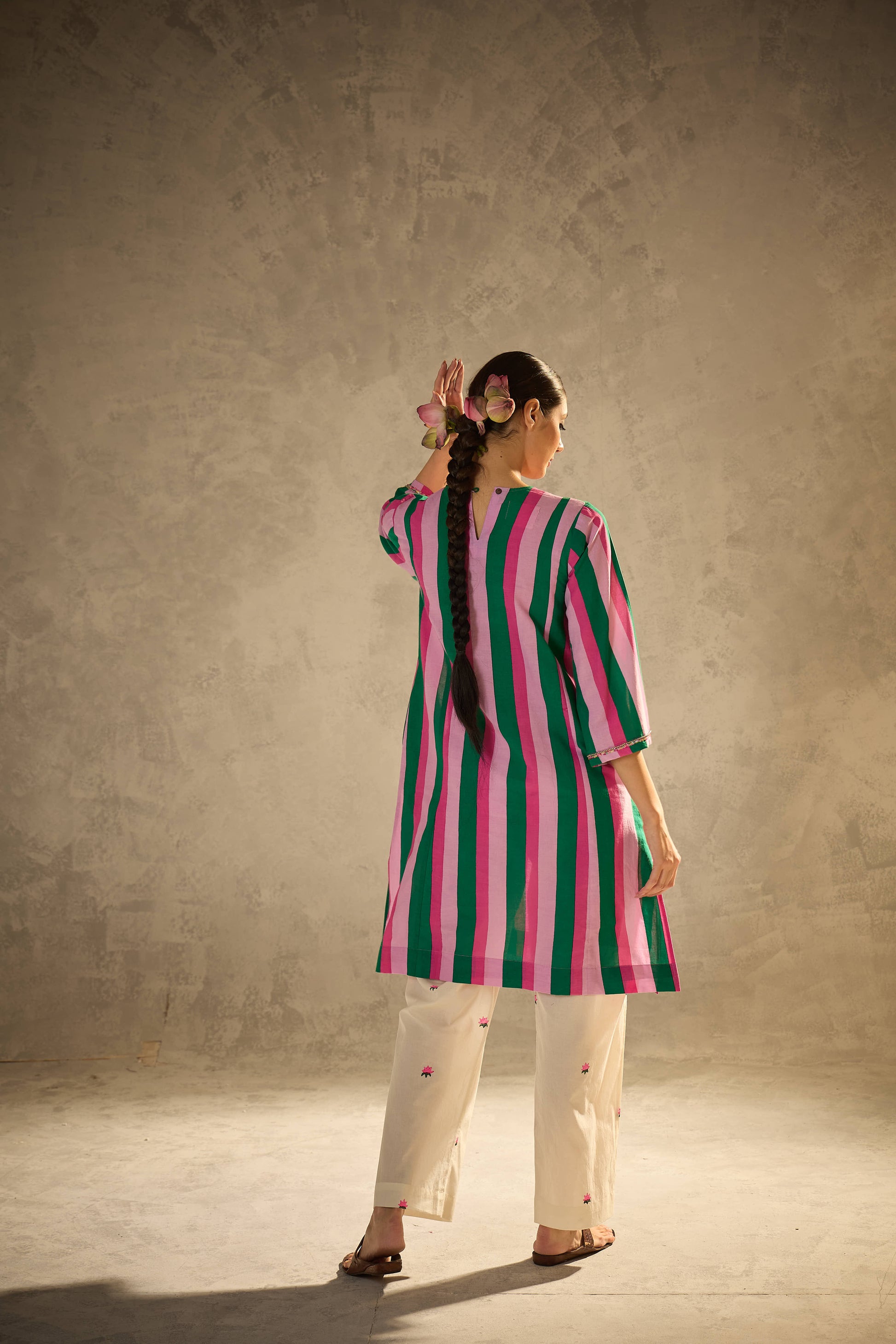 Crafted in soft, breathable cotton-cambric, this kurta set features playful stripes and rich embellishment. The kurta boasts intricate sequin and bead work on the yoke and sleeves. The pants are straight-cut with delicate lotus block prints.