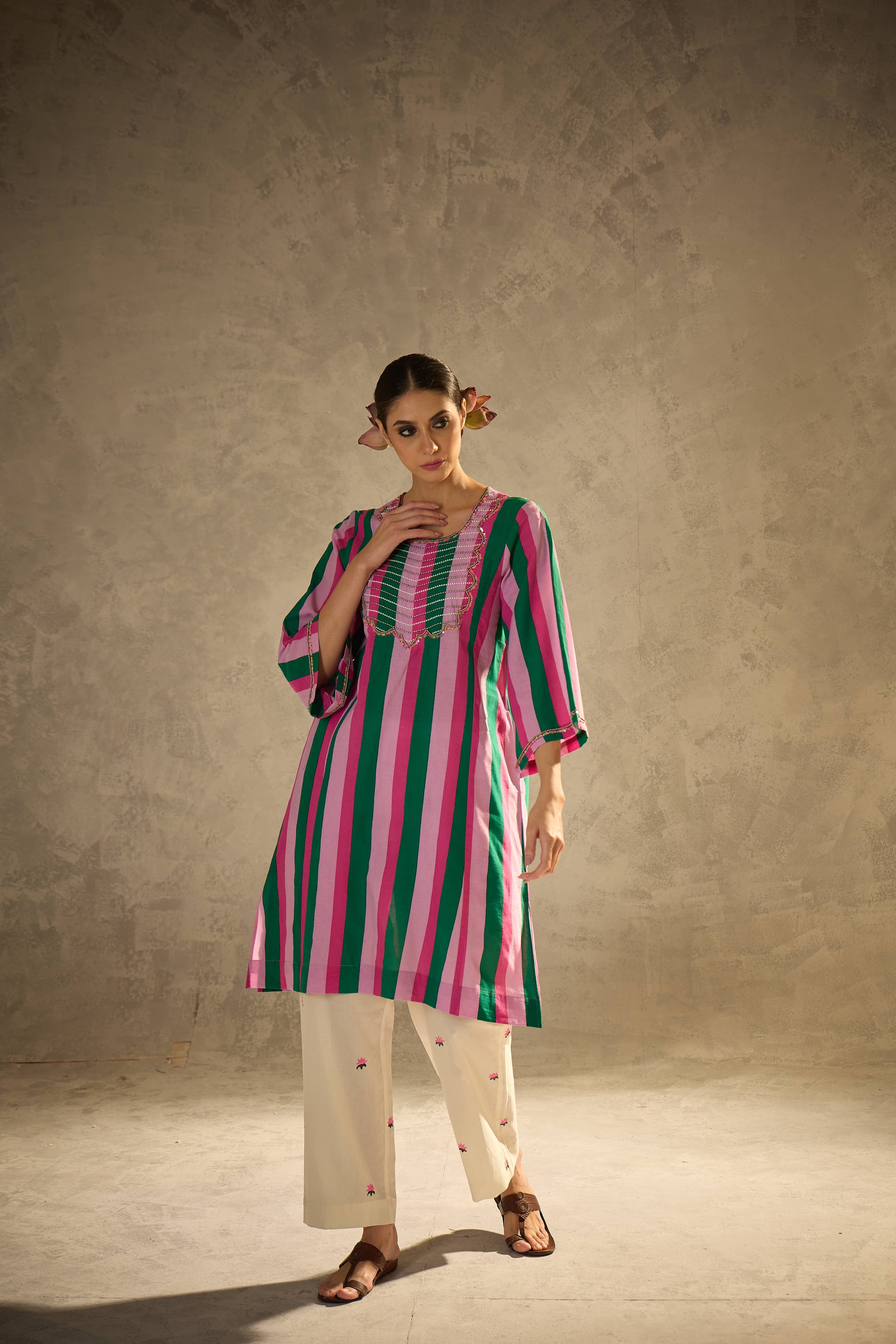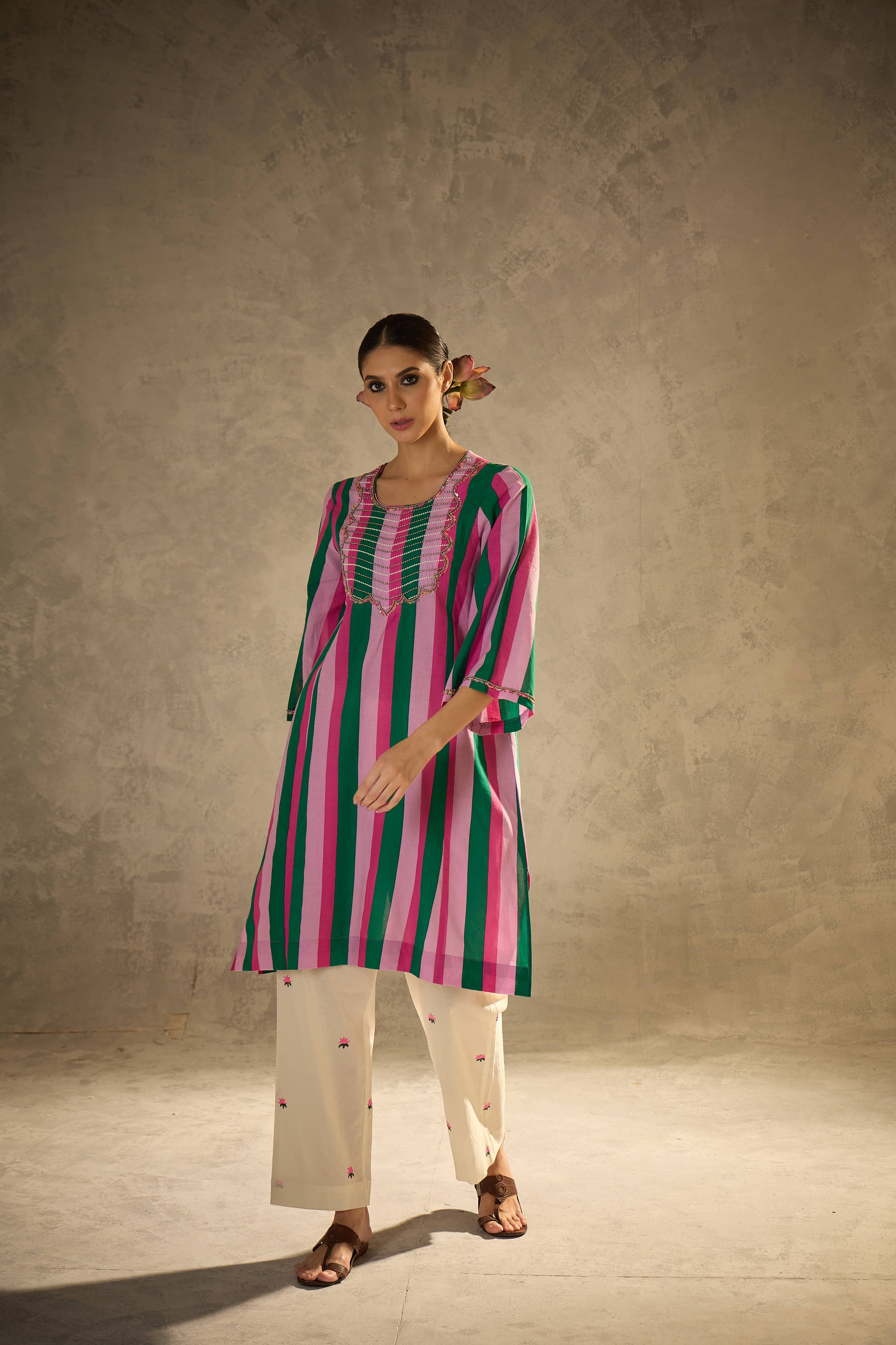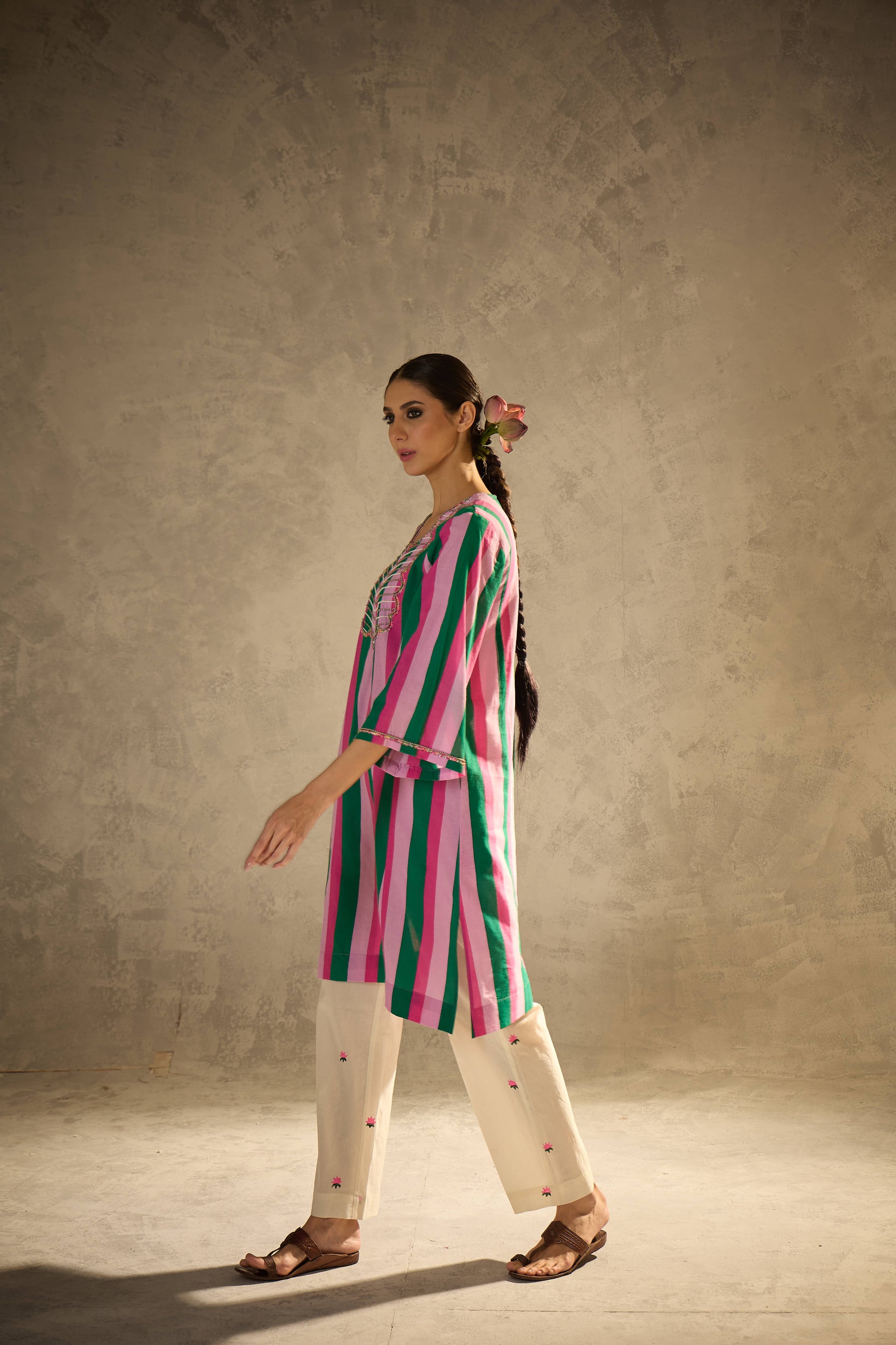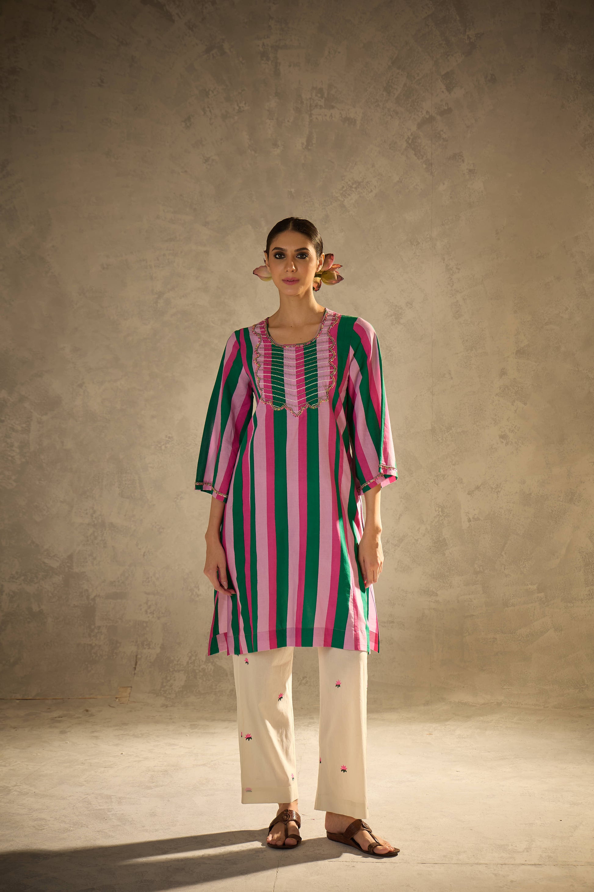 Crafted in soft, breathable cotton-cambric, this kurta set features playful stripes and rich embellishment. The kurta boasts intricate sequin and bead work on the yoke and sleeves. The pants are straight-cut with delicate lotus block prints.