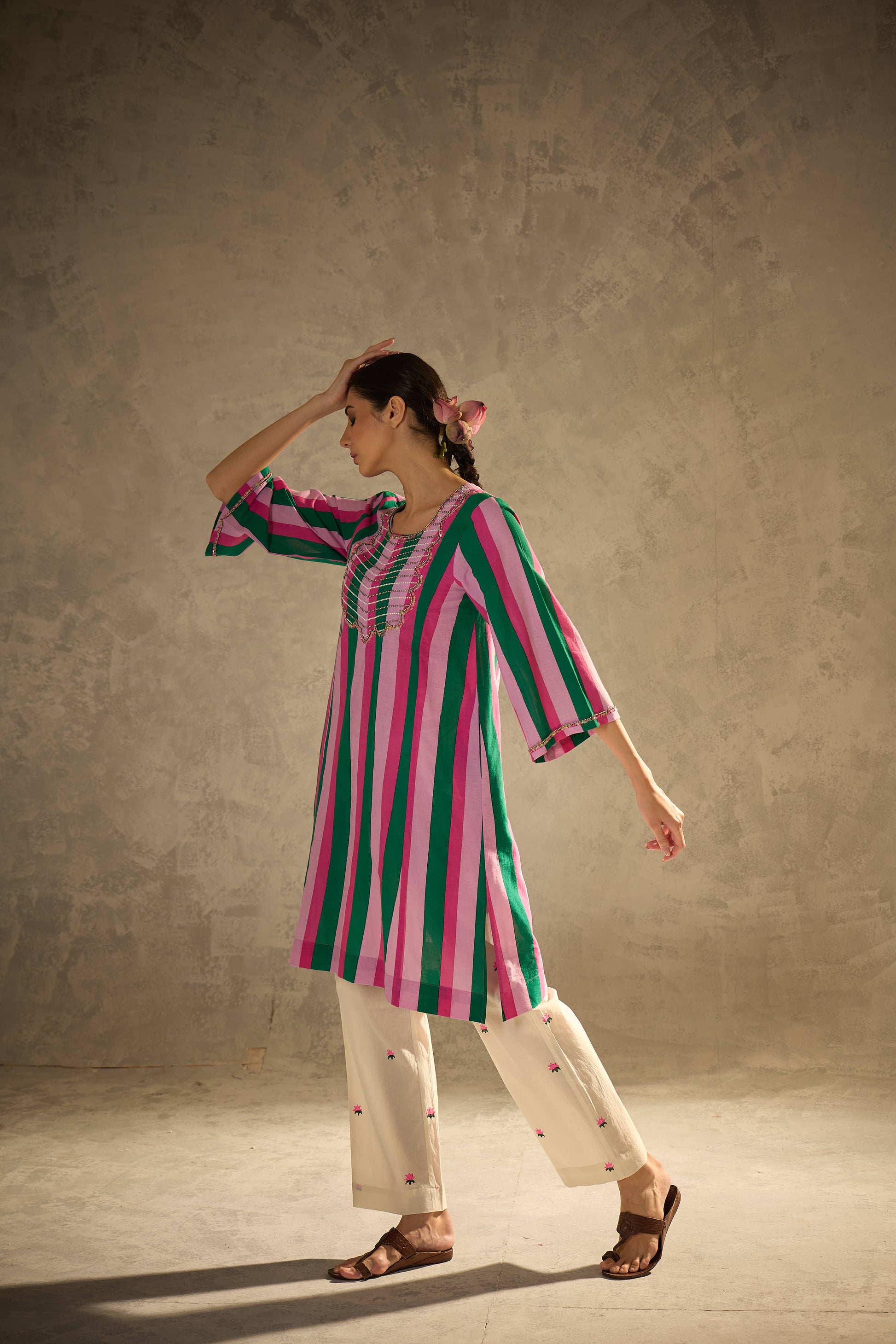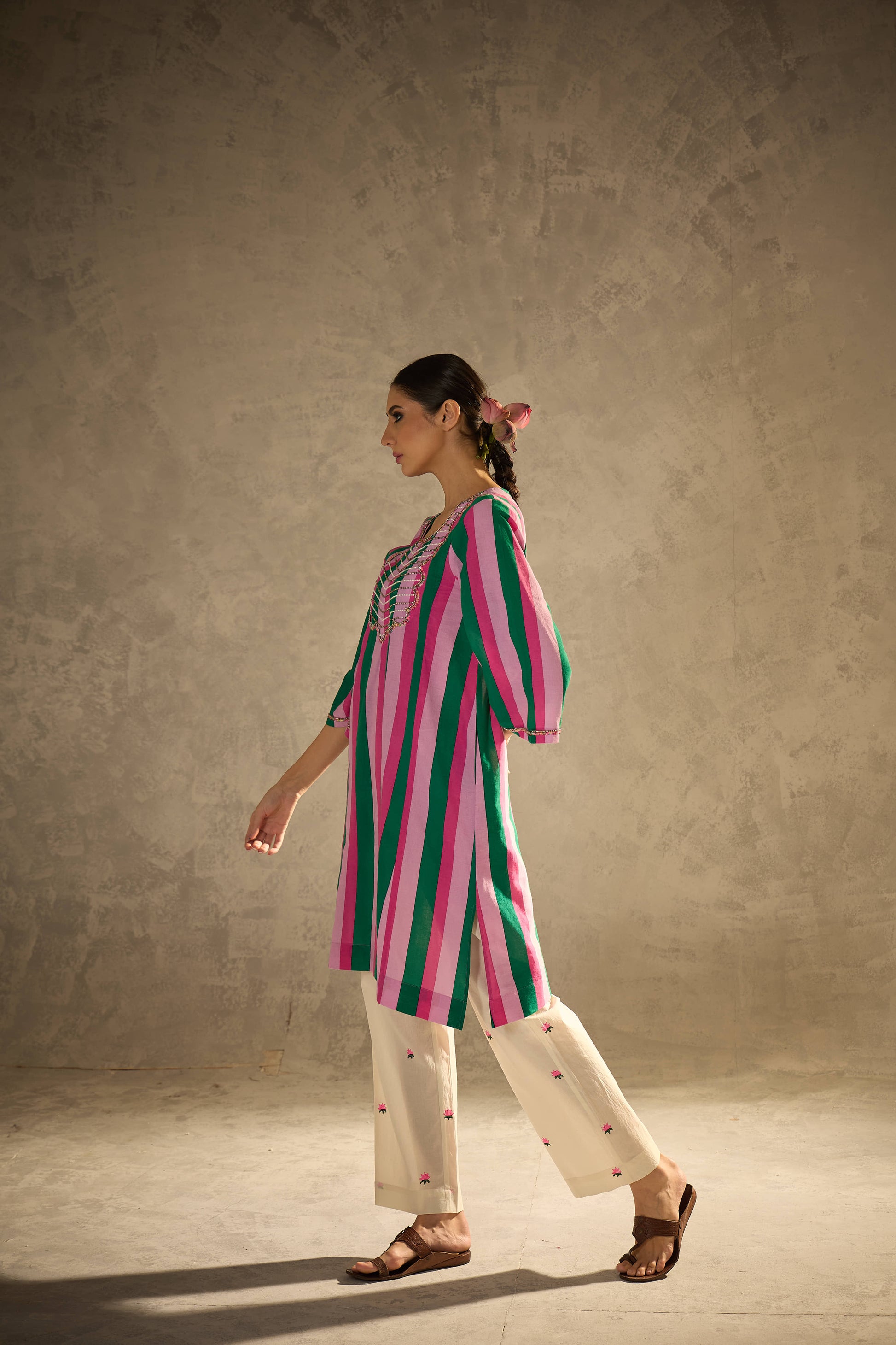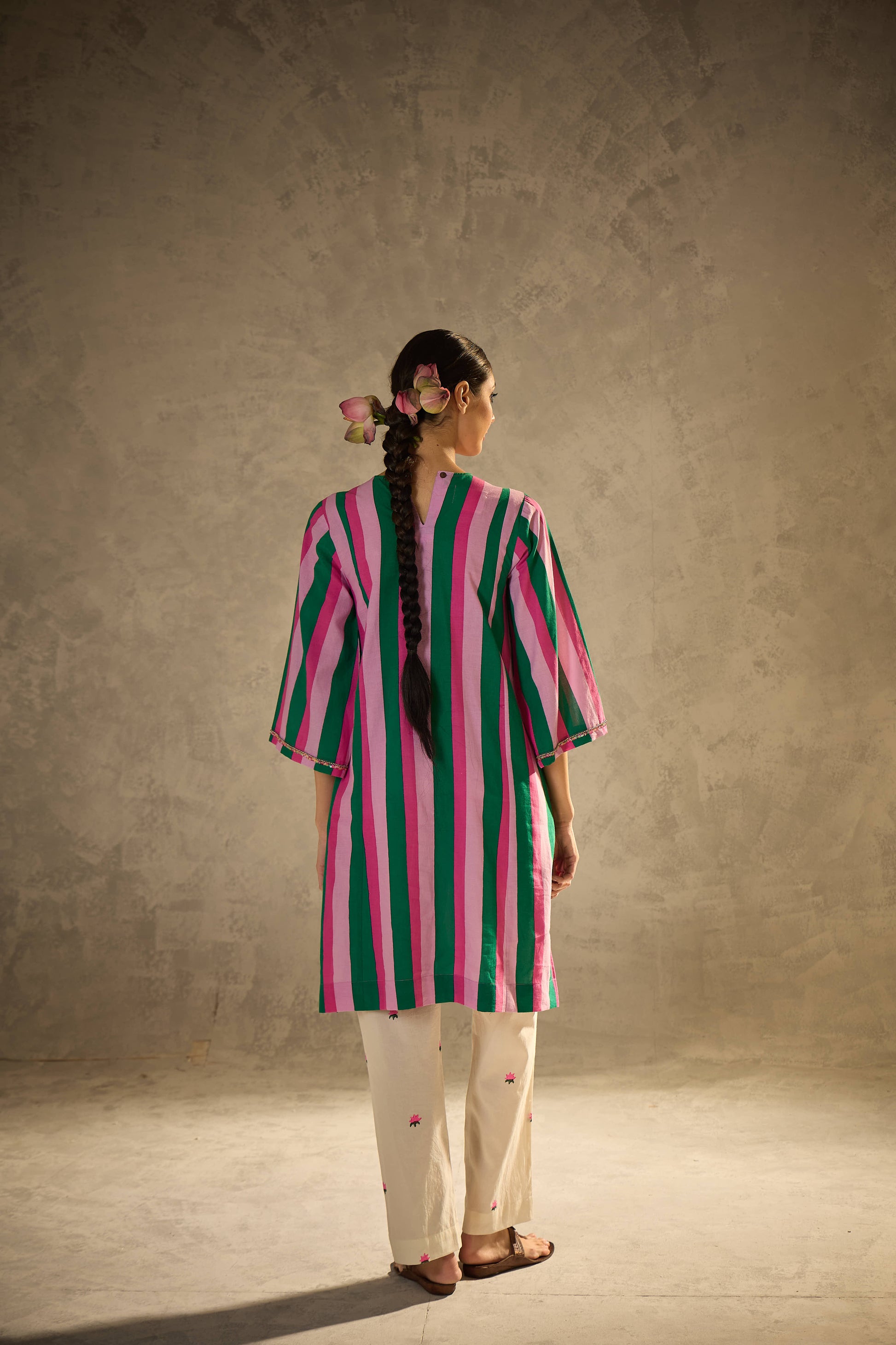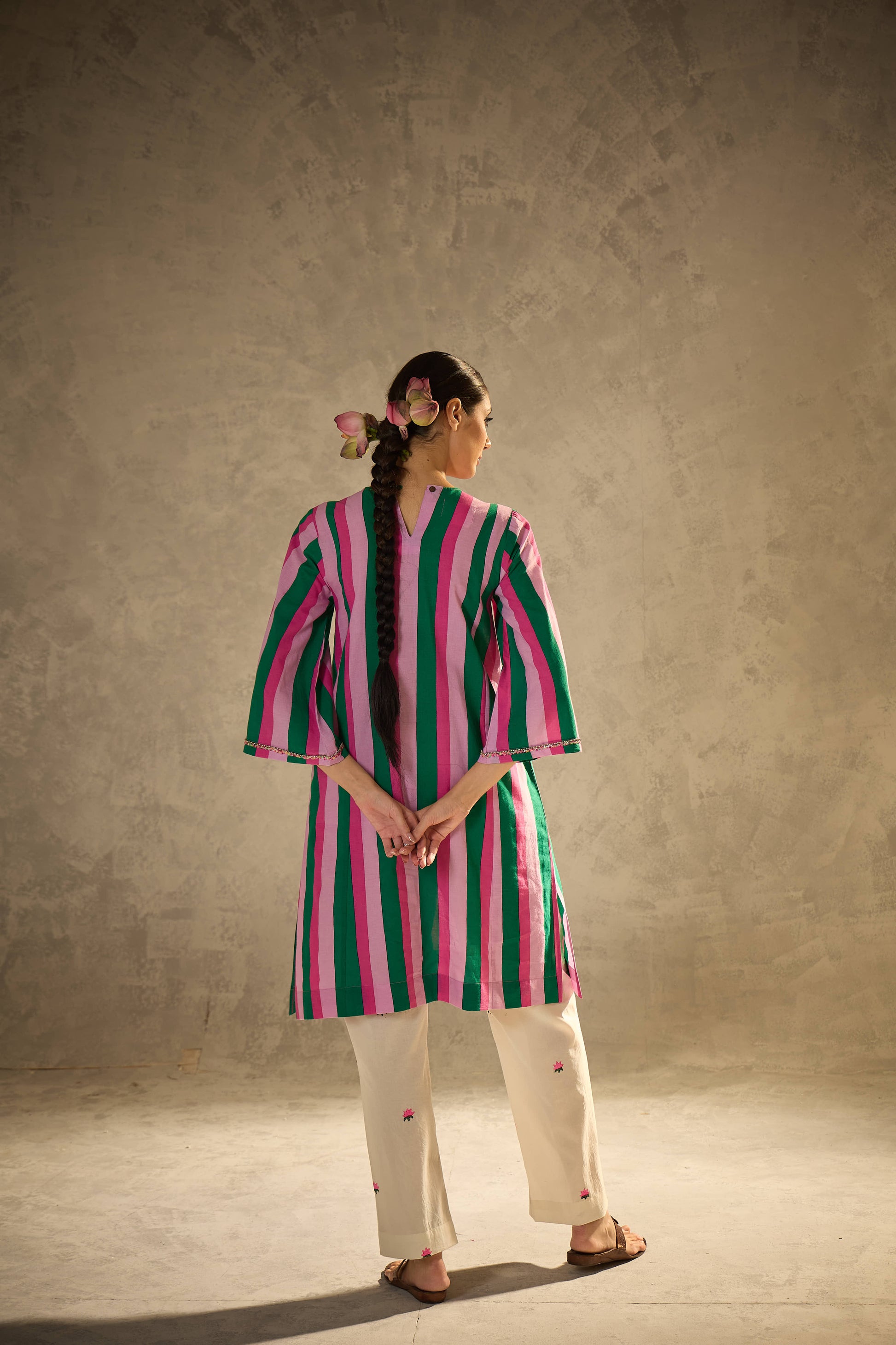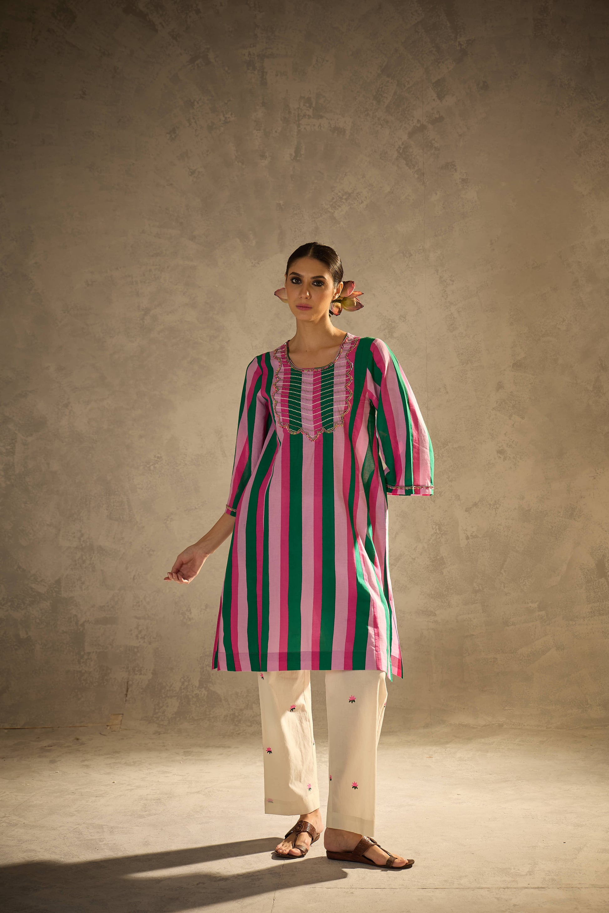 Crafted in soft, breathable cotton-cambric, this kurta set features playful stripes and rich embellishment. The kurta boasts intricate sequin and bead work on the yoke and sleeves. The pants are straight-cut with delicate lotus block prints.