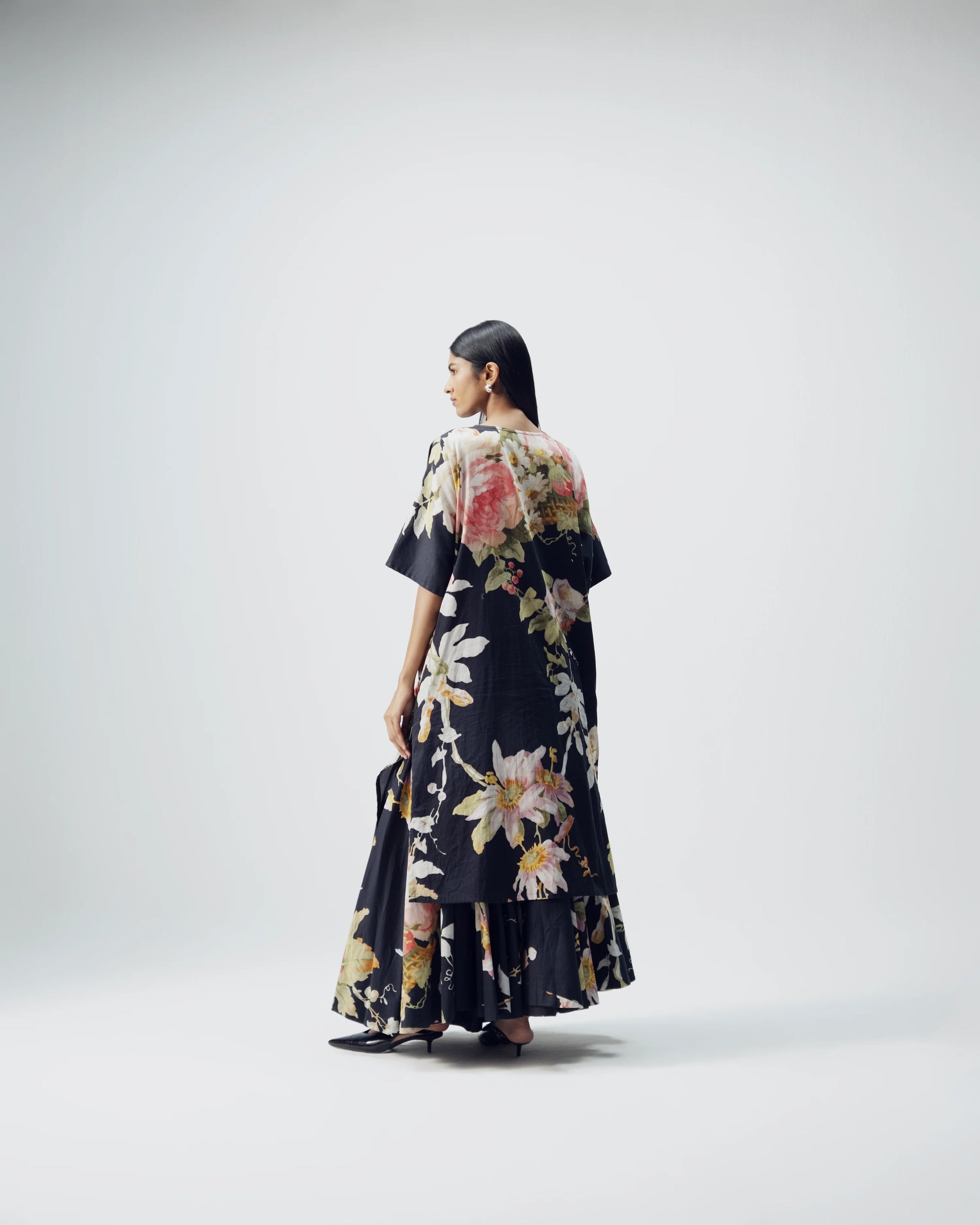 The outfit features a bold artistic floral print in shades of pink, ivory, yellow, and green set against a deep black background, giving it a dramatic and sophisticated feel. The embroidered detailing on the front of the kurta enhances the floral motifs, adding texture, depth, and a touch of handcrafted luxury.