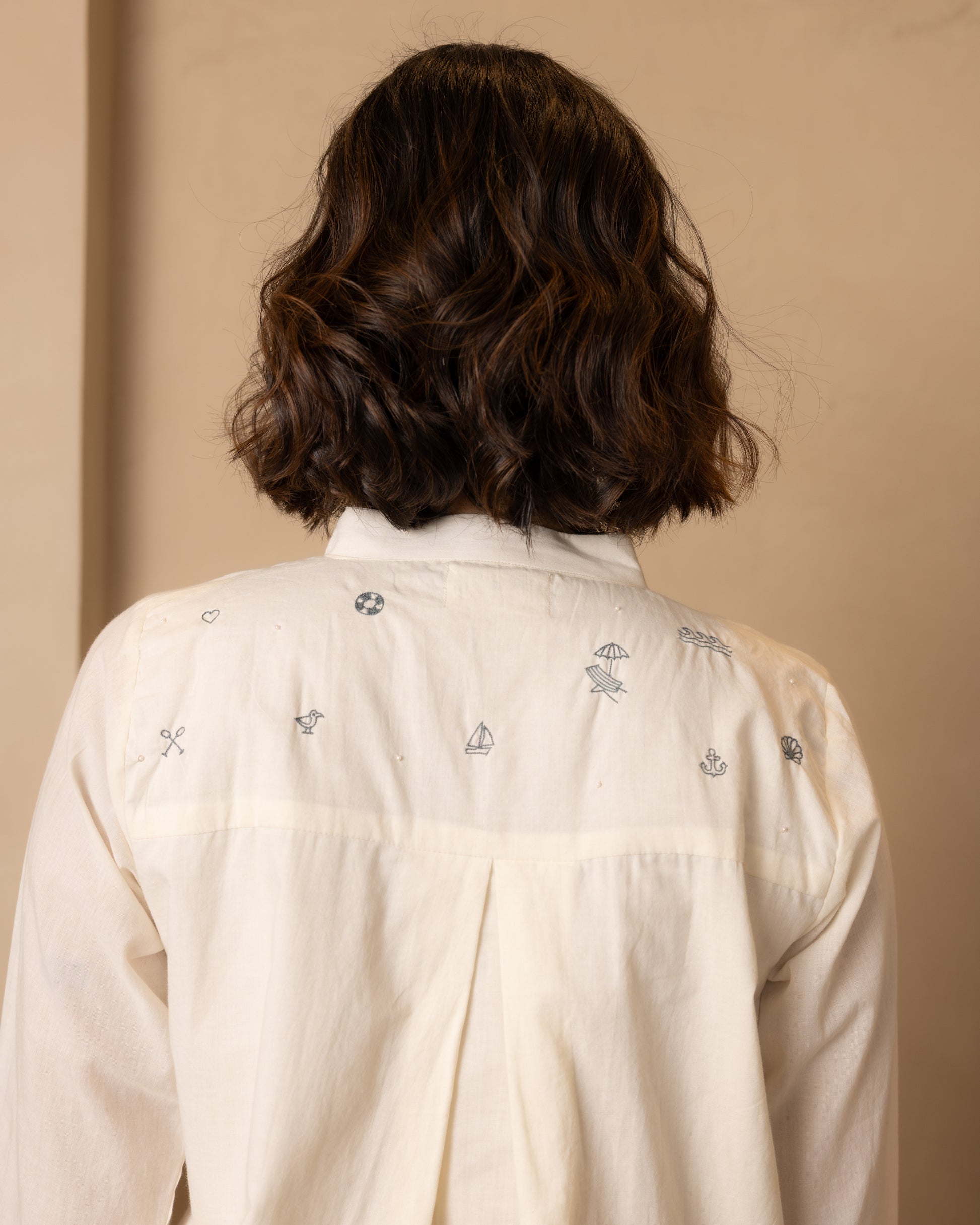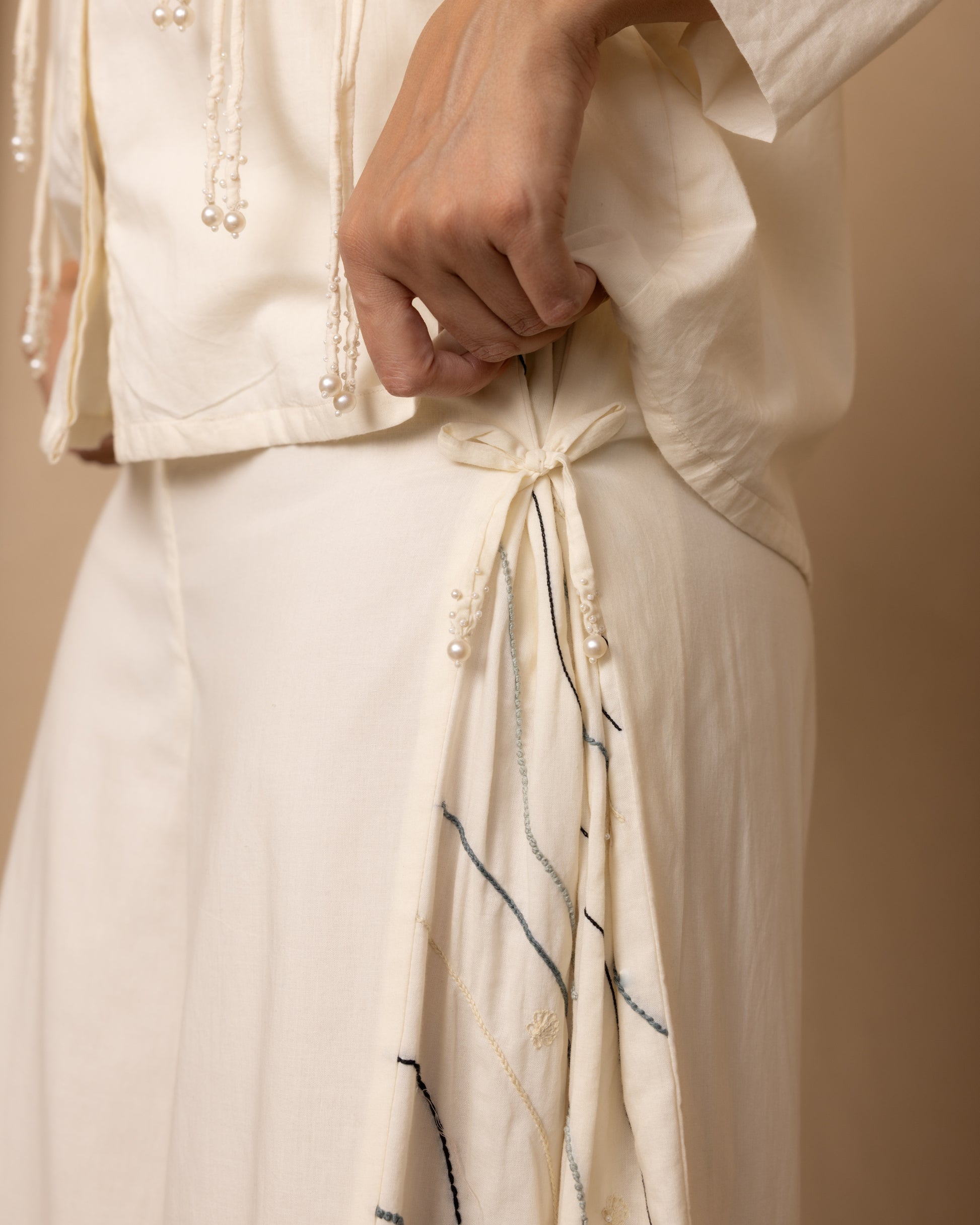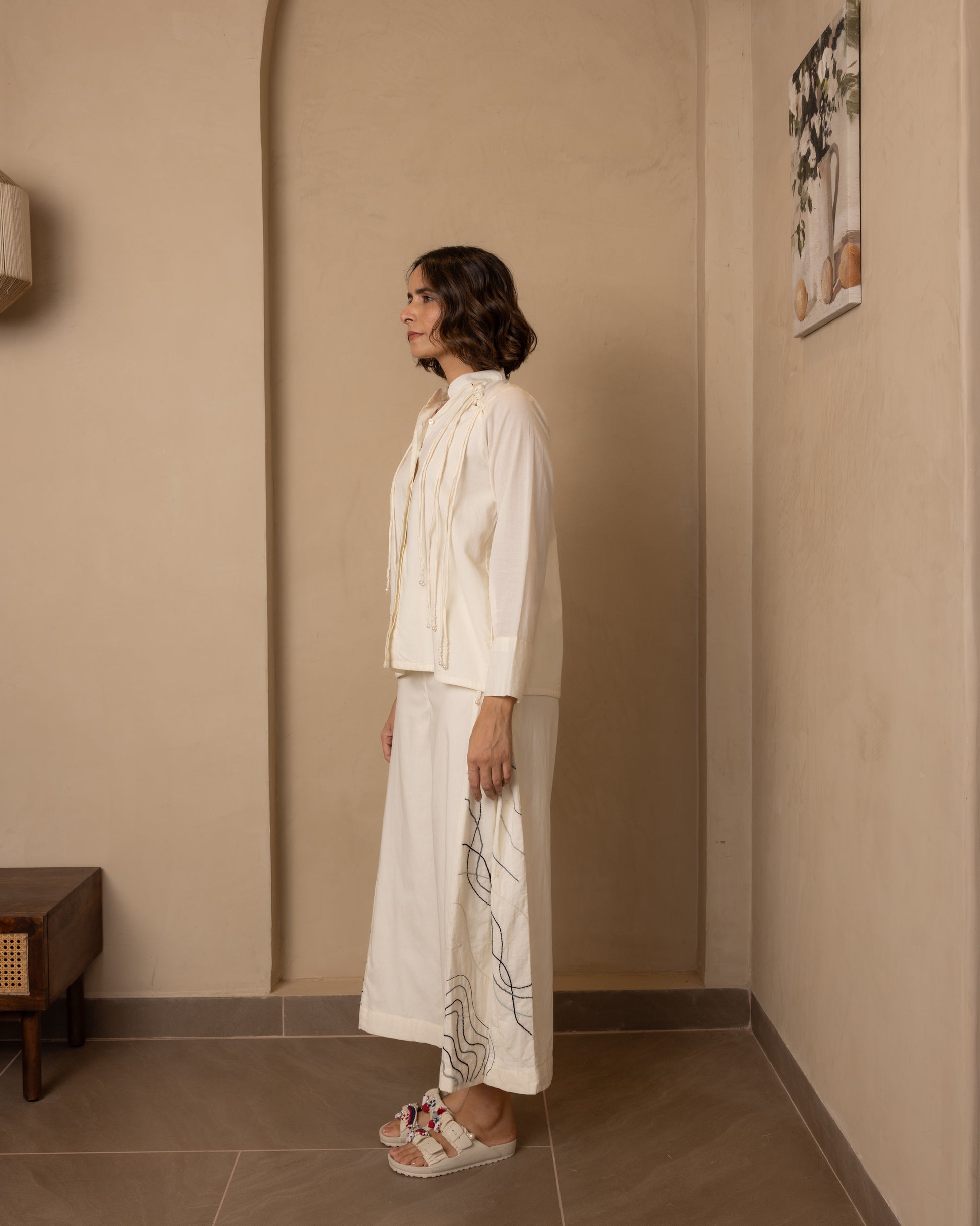 Intricate shoulder-to-sleeve lace detailing adds a touch of femininity and grace, while embroidered buttons along the neckline offer a polished finish. A standout feature of this dress is the tassel detailing on the back yoke line, adding whimsical charm and a unique focal point to the ensemble