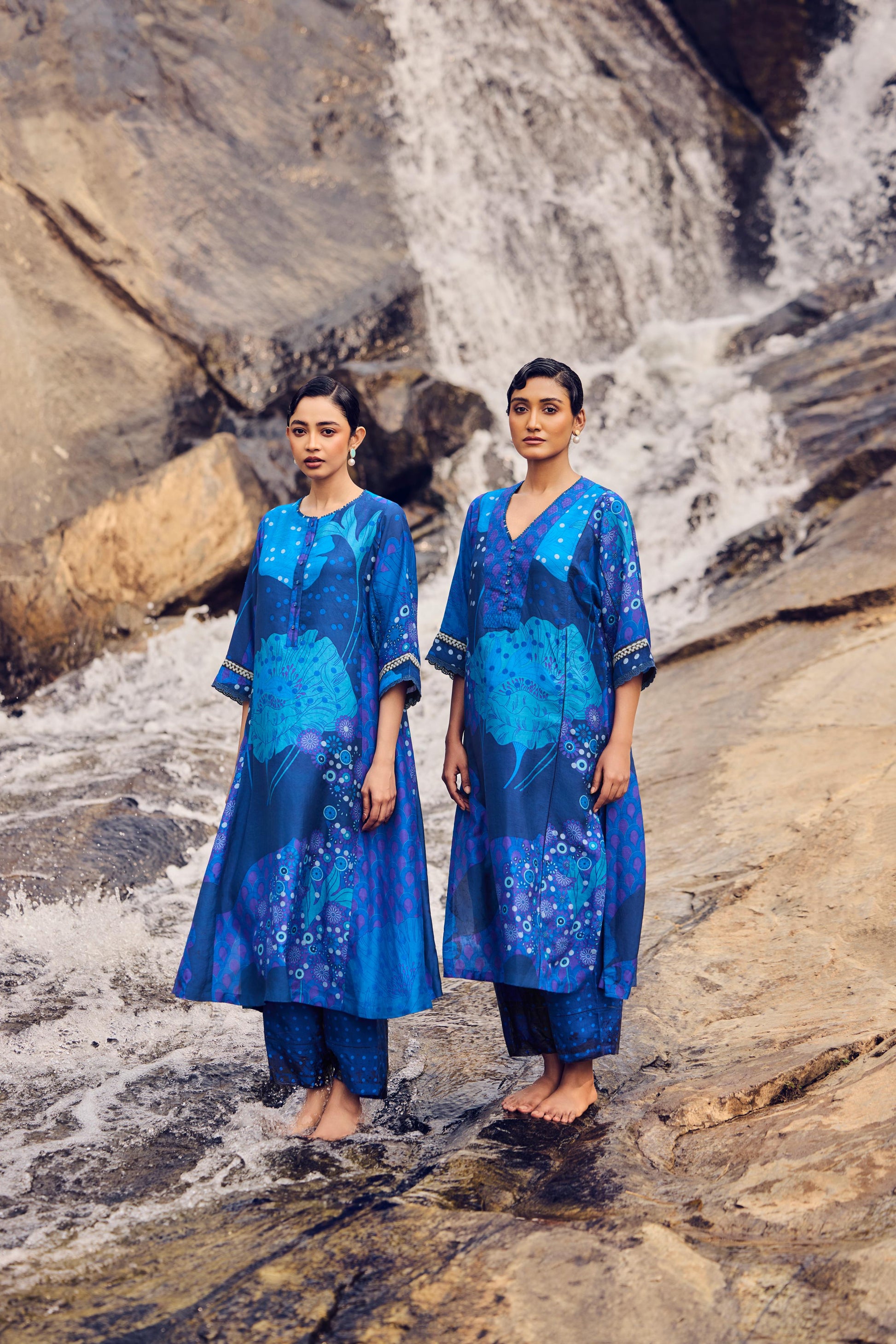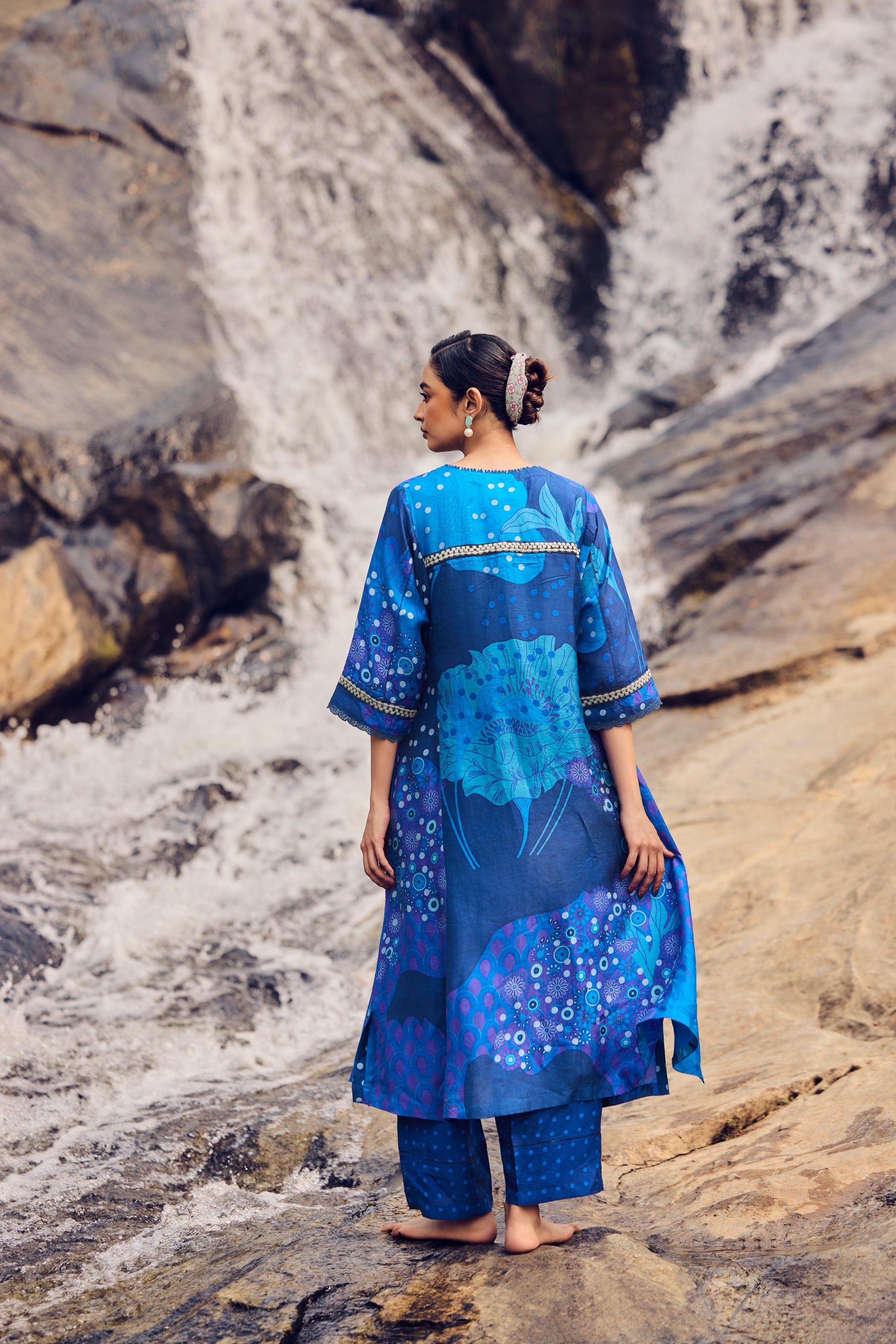 Electric blue hand woven, hand printed A-line kurta, with kaftan cut sleeves, and embroidery detail on sleeves and back, paired with pants.