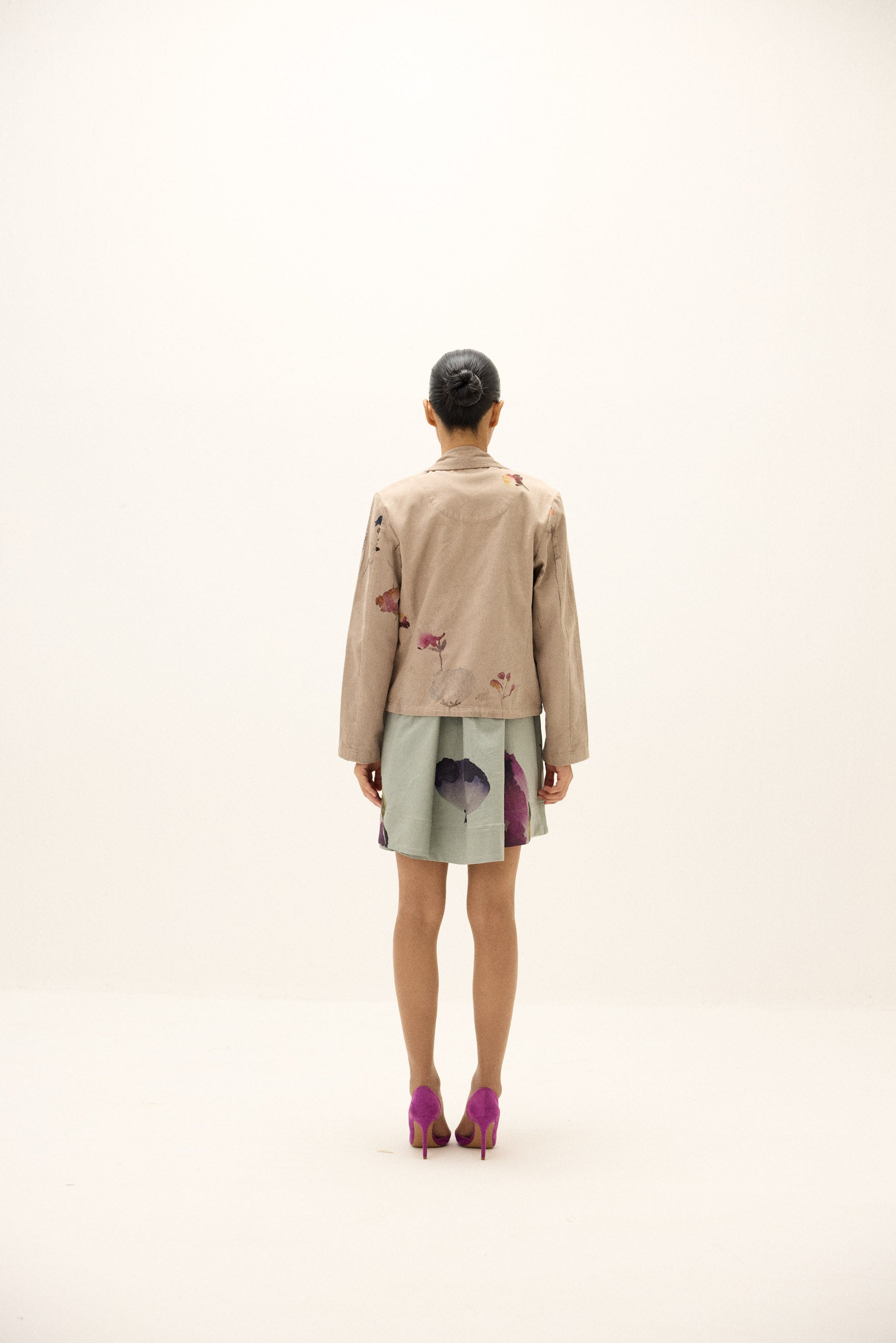 A structured corduroy blazer reimagined with an artisanal touch. Featuring an subtle floral multi - coloured print on a stone grey base, this double-breasted jacket is tailored with sharp lapels, flap pockets, and a slightly cropped length for a contemporary edge.