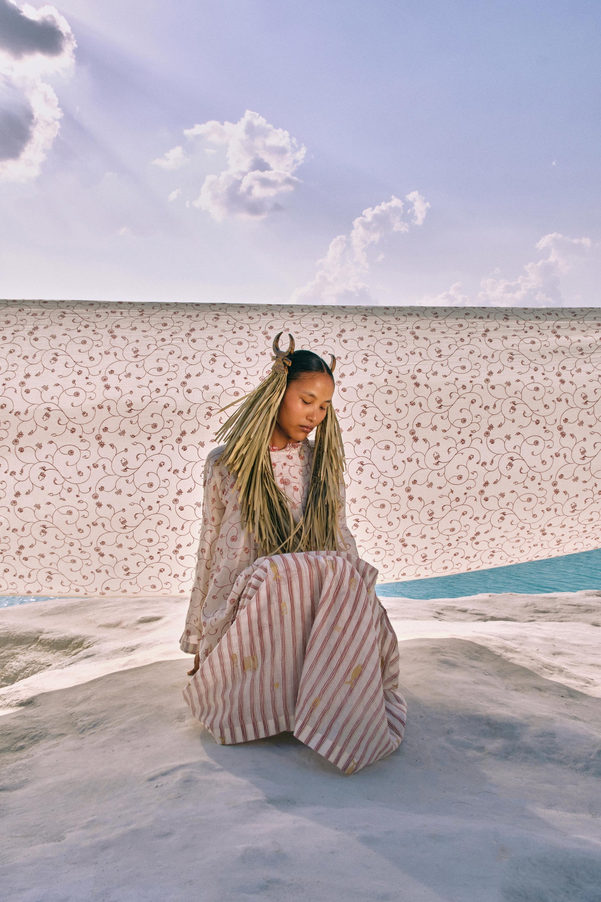 A study in structure and craftsmanship, the Chan Box Pleat Dress is crafted in contrasting hand-screen-printed cotton silk. Box pleats at the yoke and embroidered lace at the neckline lend sophistication, while raglan sleeves with bias binding create soft structure. A back tie-up adorned with handmade beaded tassels adds a delicate flourish. Every pleat, stitch, and embellishment reflects hours of meticulous labour, creating a piece where artistry and elegance flow in perfect harmony.