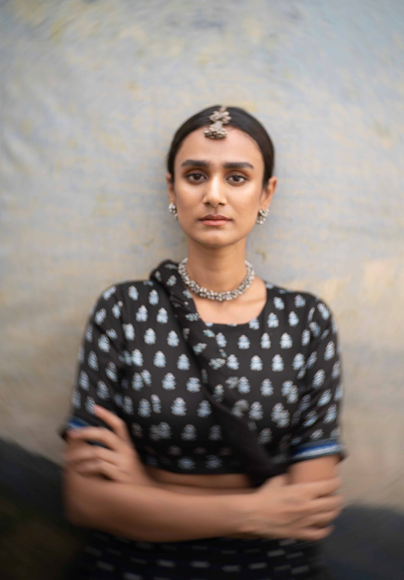 The Chand Lehenga displays the striking hues of blue against black, featuring hand block printed mughal motifs of flora and leaves . the lehenga is paired with a handblock printed silk organza dupatta finished with a satin piping.