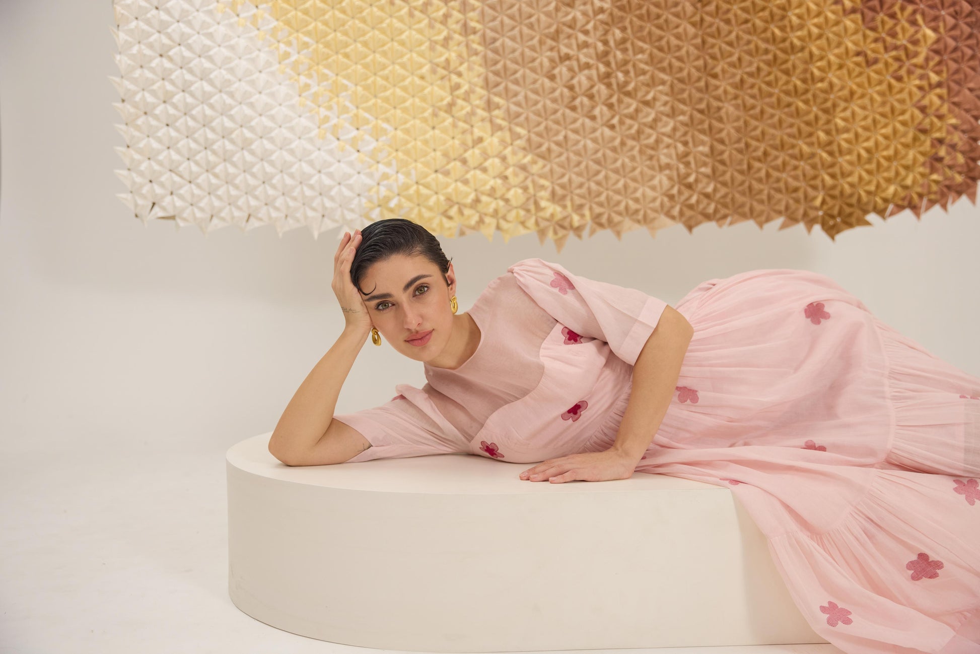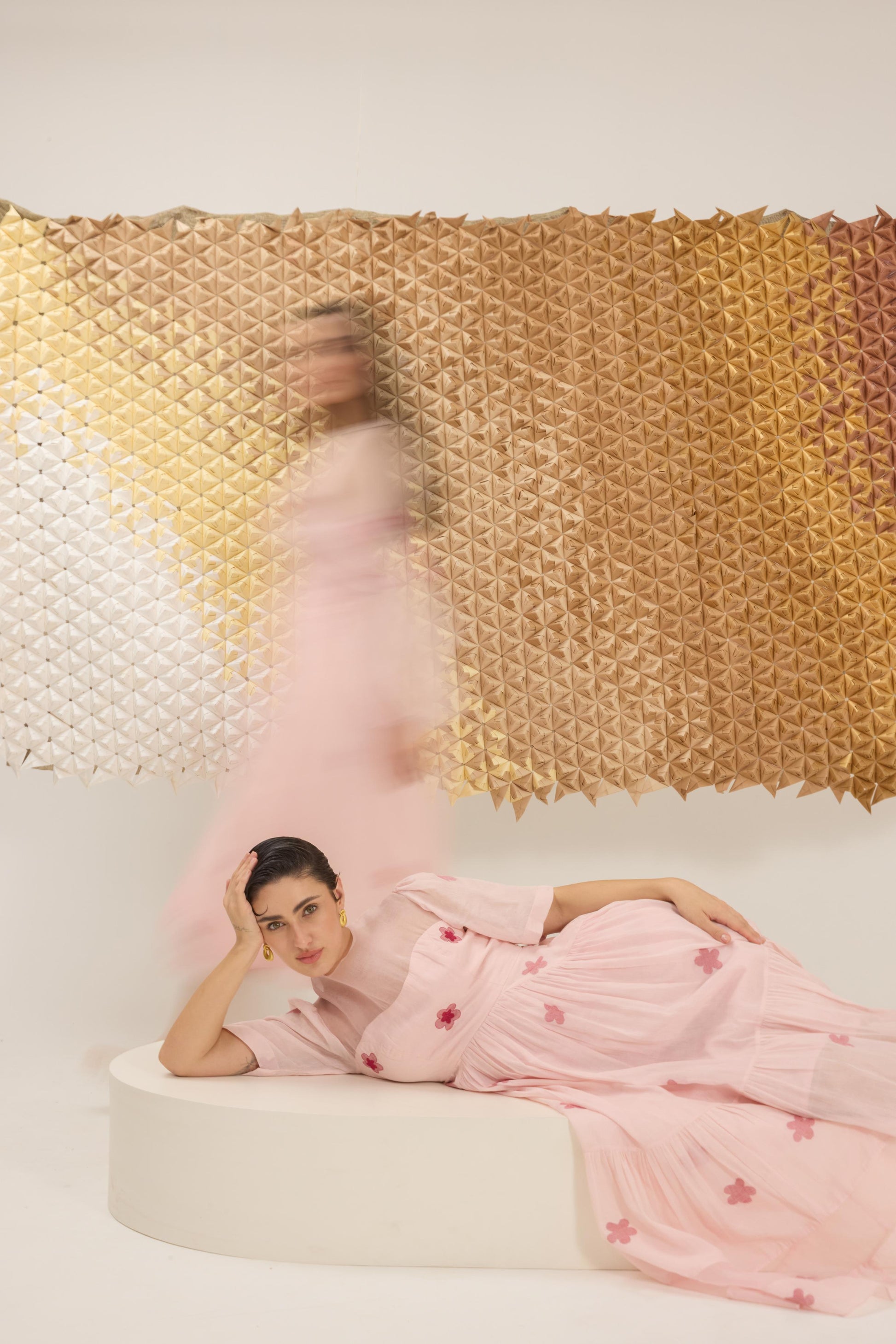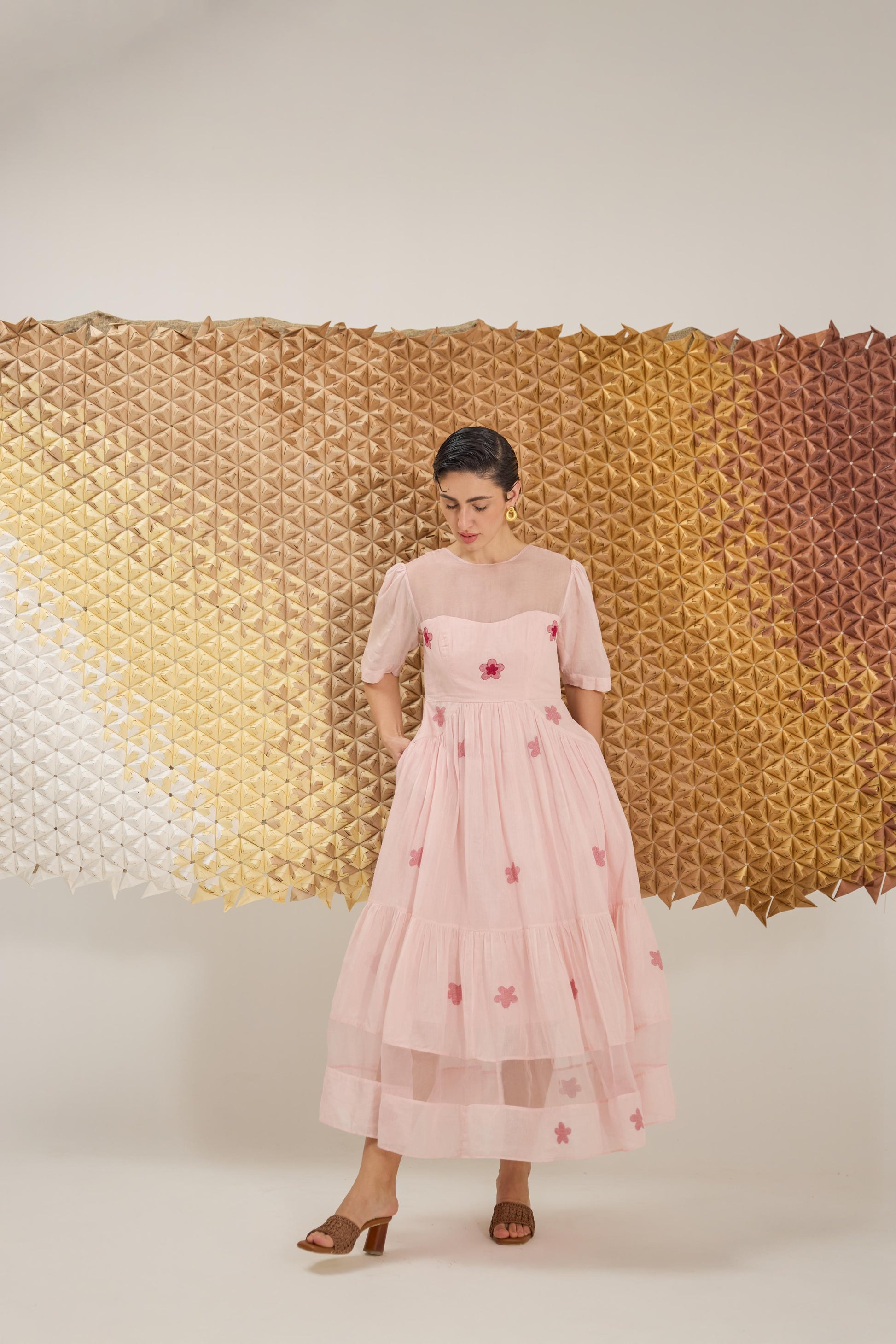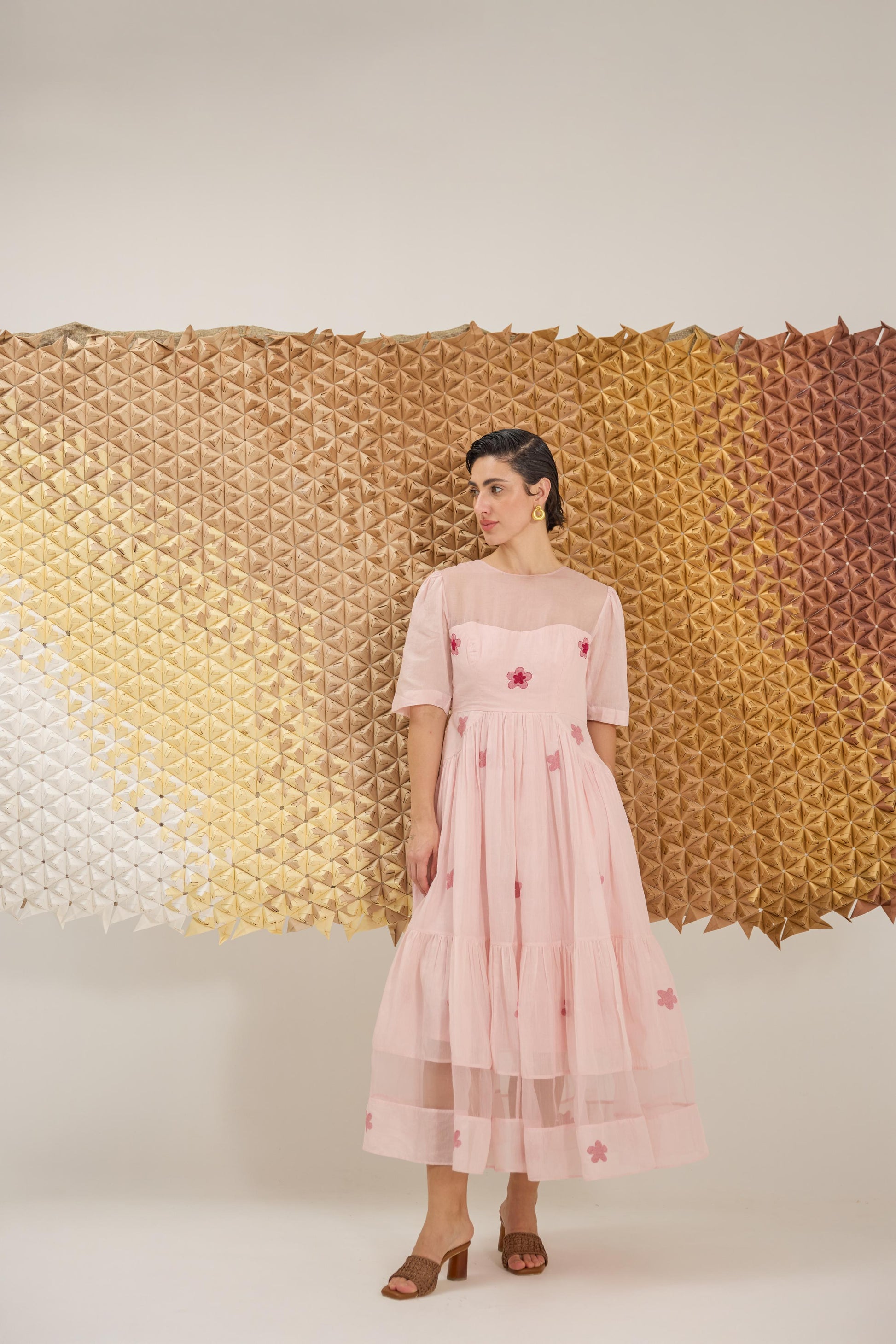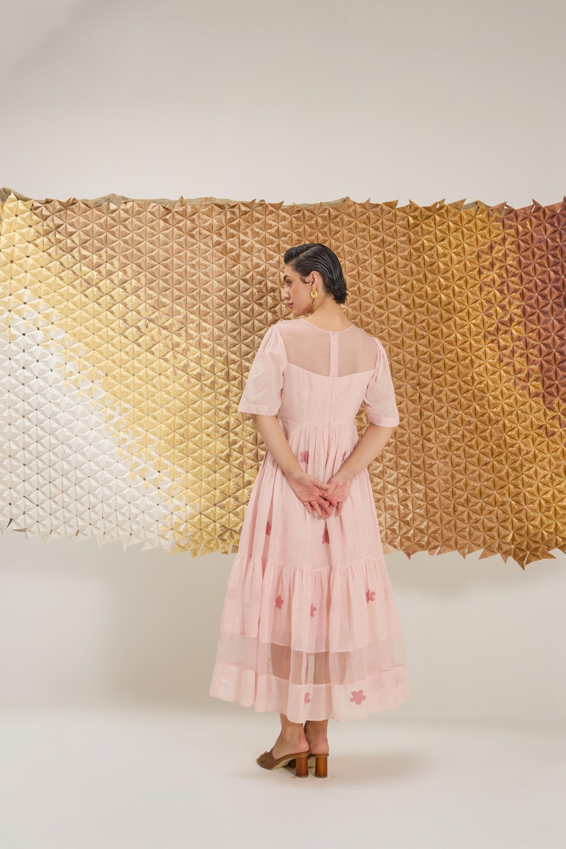A delicate A-line dress with fluttering sleeves, reminiscent of cherry blossom petals gently falling. Crafted in a soft pink hue from handwoven cotton silk in floral Jamdani weave technique and the strategic use of Organza give the dress an airy, springtime feel, embellished with hand embroidery.