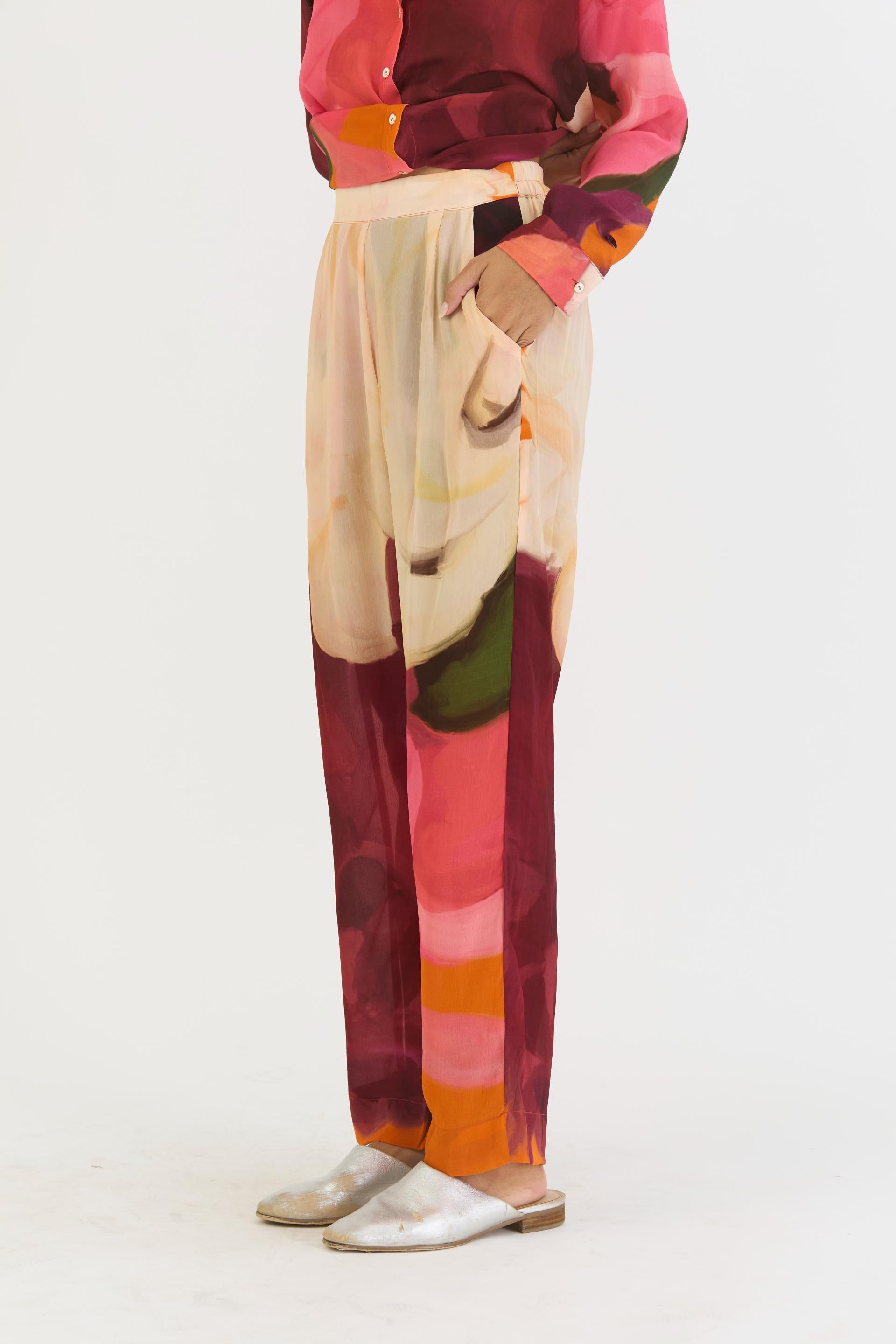 The Shirt is paired with a straight crepe pant in the same print with back elastic.