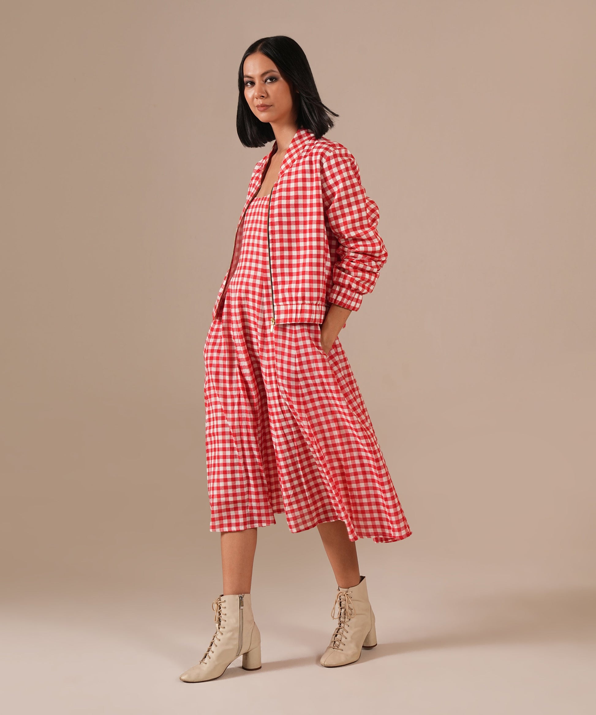 A classic ensemble features a fit and flare dress with deep square neckline, back zipper fastening, elegant kali panel detailing, and side pockets, paired with a co-ord bomber jacket, effortlessly combining timeless craftsmanship with a contemporary, stylish edge.