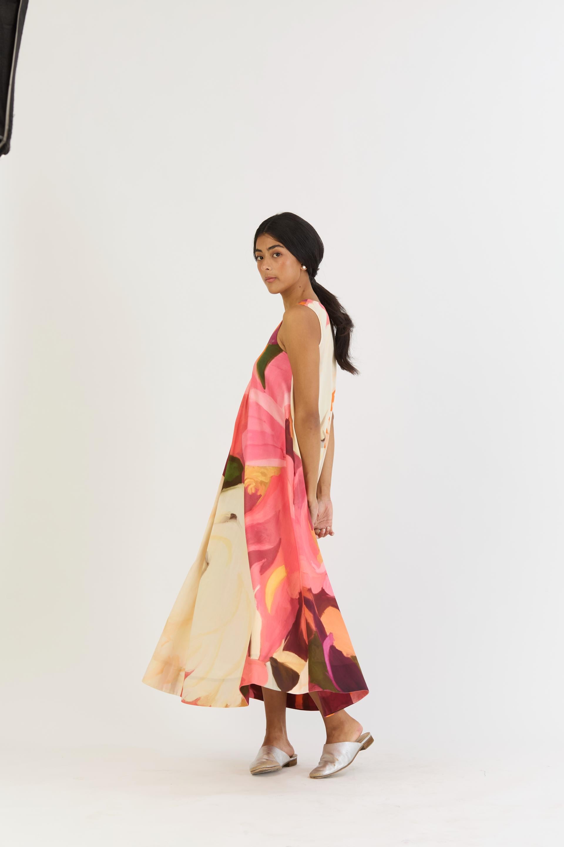 The V - neck dress features pockets on both sides, adding a touch of functionality to its graceful silhouette. This timeless piece seamlessly combines the allure of a V- neckline, cut sleeves, and the inverted box pleated in front adding volume to the dress with the comfort of cotton satin fabric.