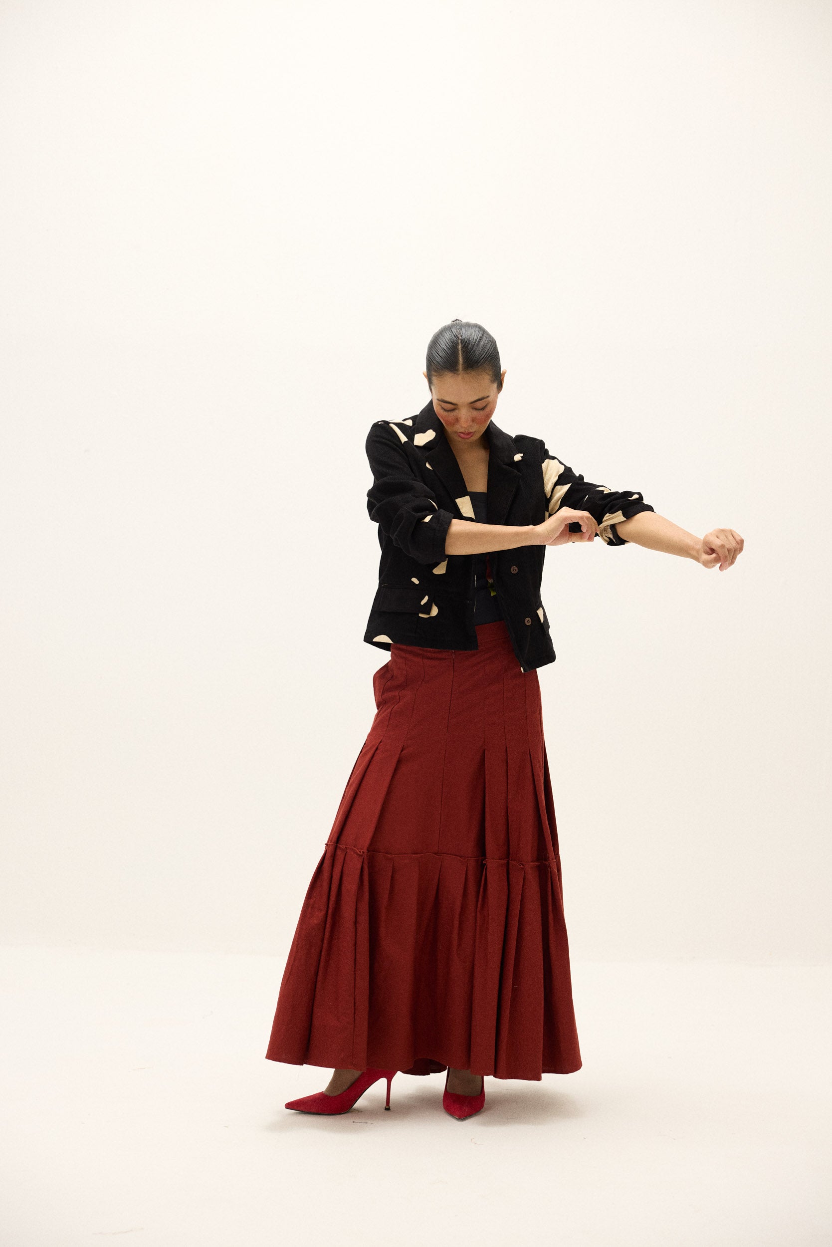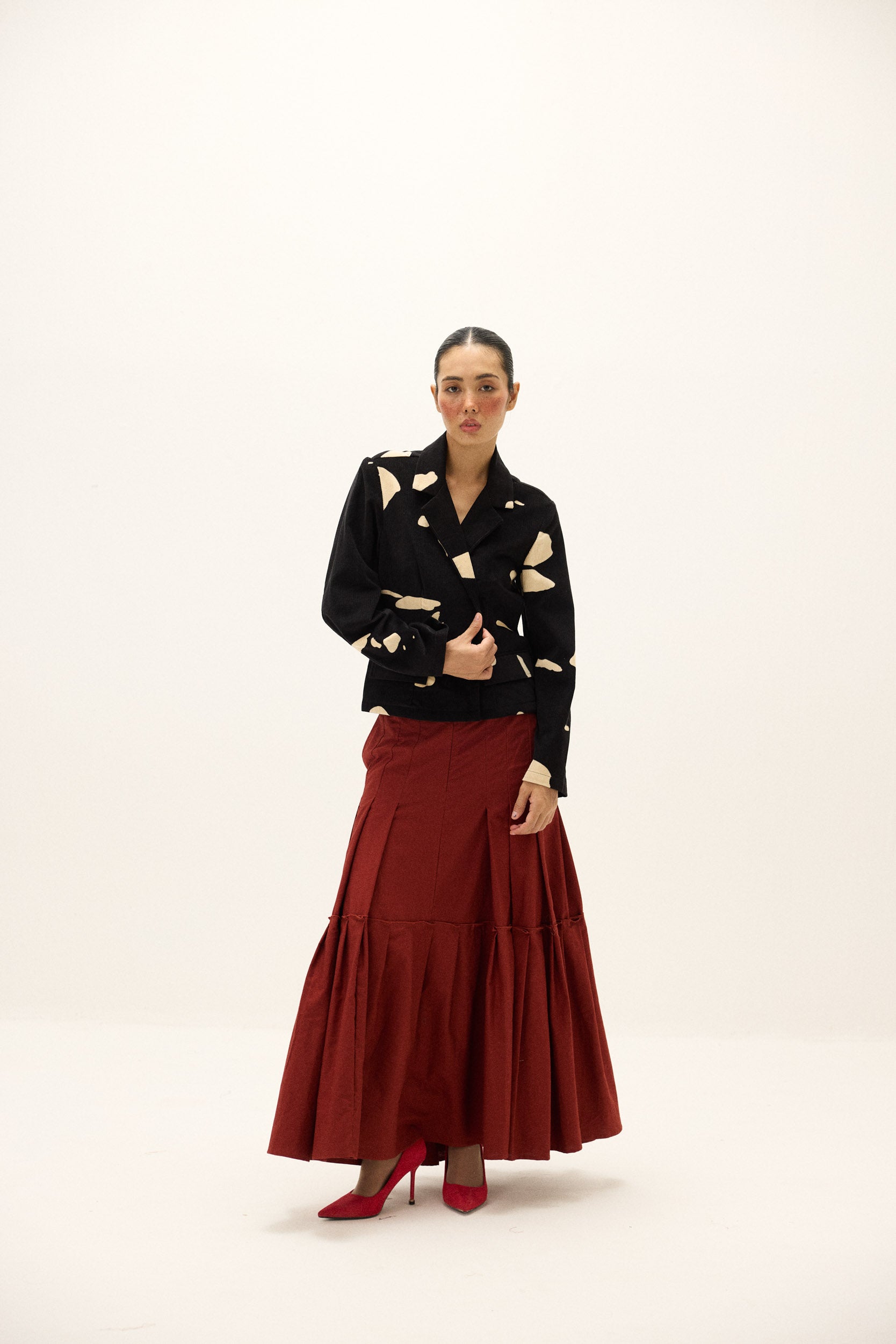A structured corduroy blazer reimagined with an artisanal touch. Featuring an abstract ivory print on a deep black base, this double-breasted jacket is tailored with sharp lapels, flap pockets, and a slightly cropped length for a contemporary edge.