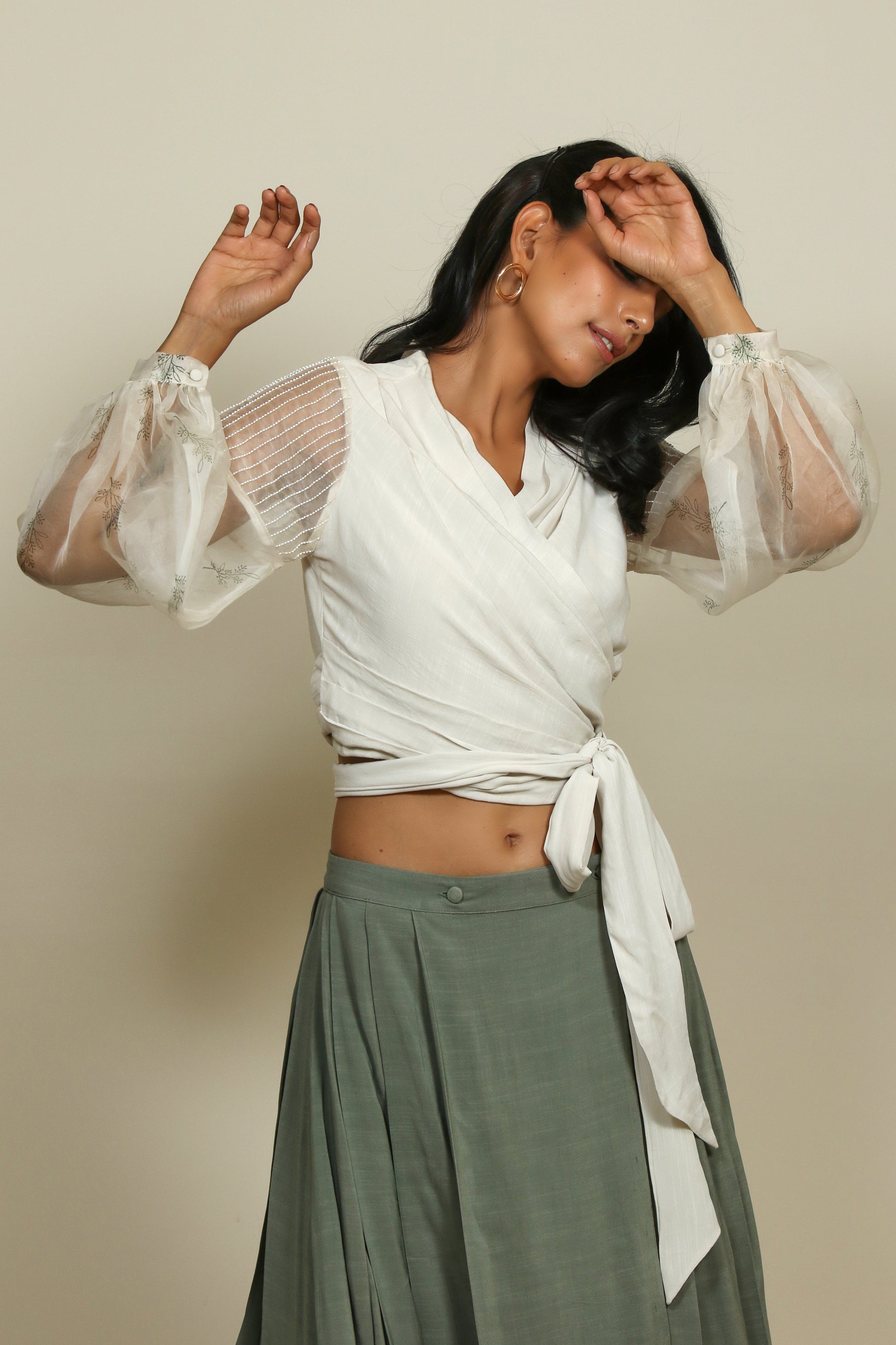 Ivory draped wrap top with organza printed sleeves and tonal embroidery details