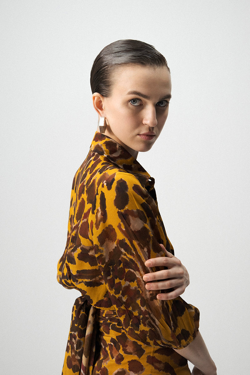 The Tie up top and Knotted skirt set is crafted in luxurious crepe and features a bold, abstract animal-inspired print in warm hues of ochre and brown. The outfit includes a front-tie crop shirt with a collared neckline and three-quarter sleeves, paired with a matching draped skirt that’s ruched and knotted at the waist for a flattering, sculpted silhouette. The fluid crepe fabric enhances movement and drape, making it perfect for both day and evening occasions.