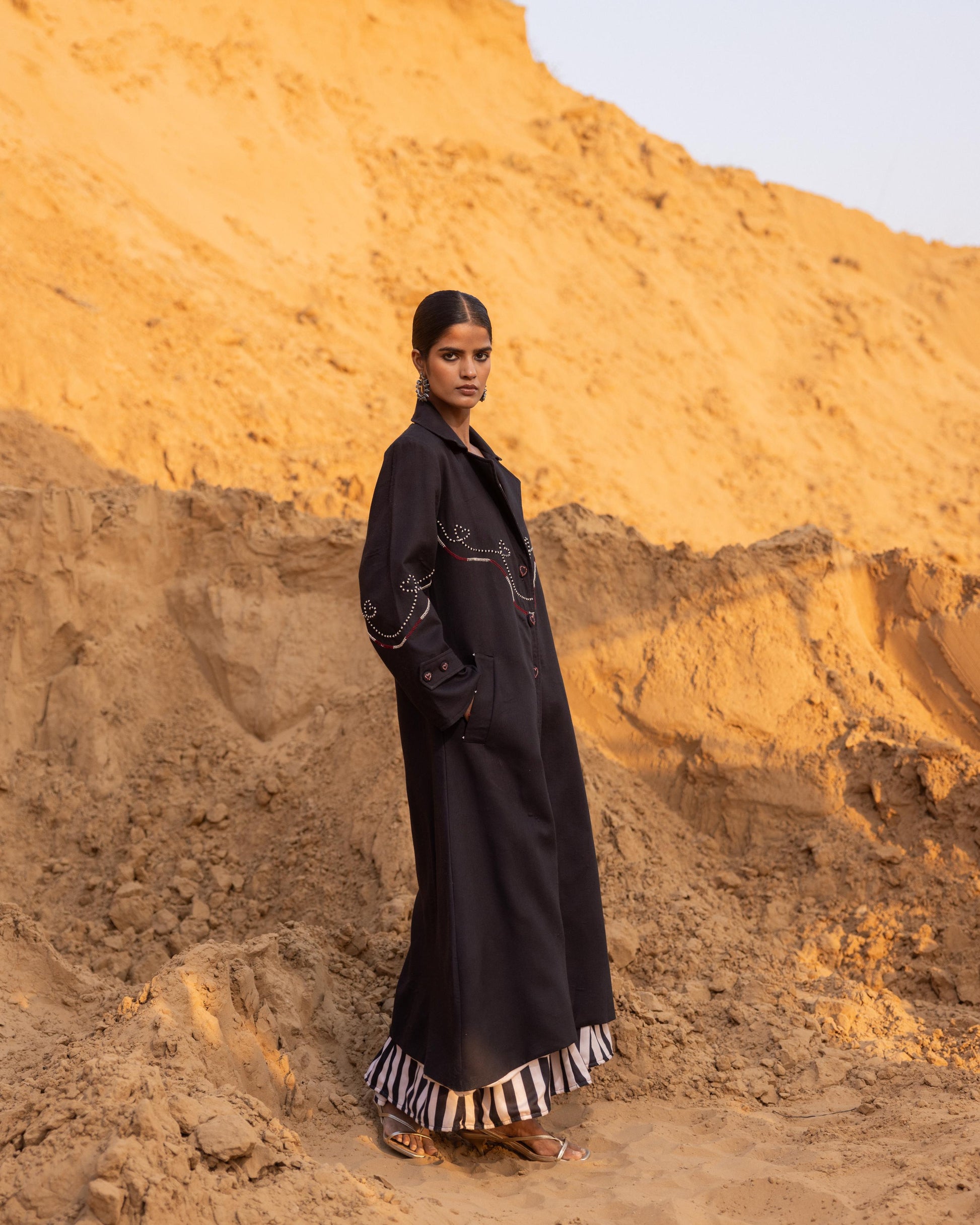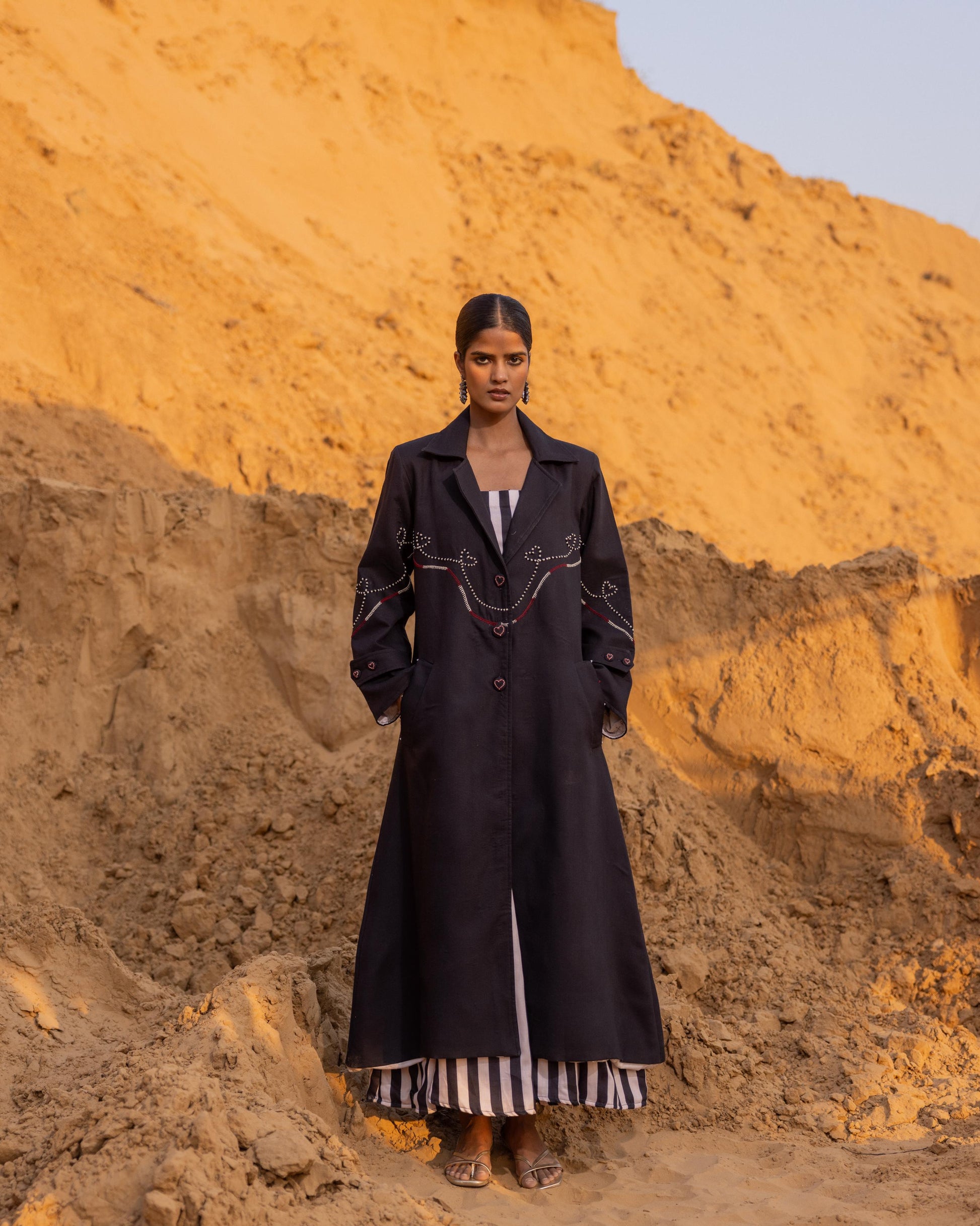 Redefining timeless elegance with contemporary ease, this long trench coat is designed for the modern woman who values both structure and flow. Crafted in premium fabric with a soft drape, it features a tailored silhouette and detailed lapels that exude quiet sophistication.