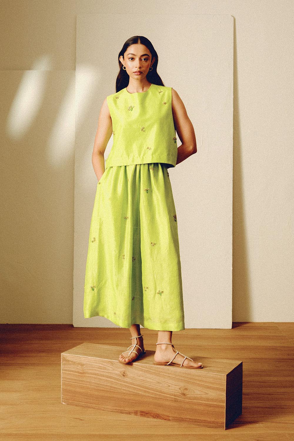 Handwoven mulberry silk sleeveless top with hand embroidered bead motifs. The top is paired with a solid matching embroidered midi skirt.