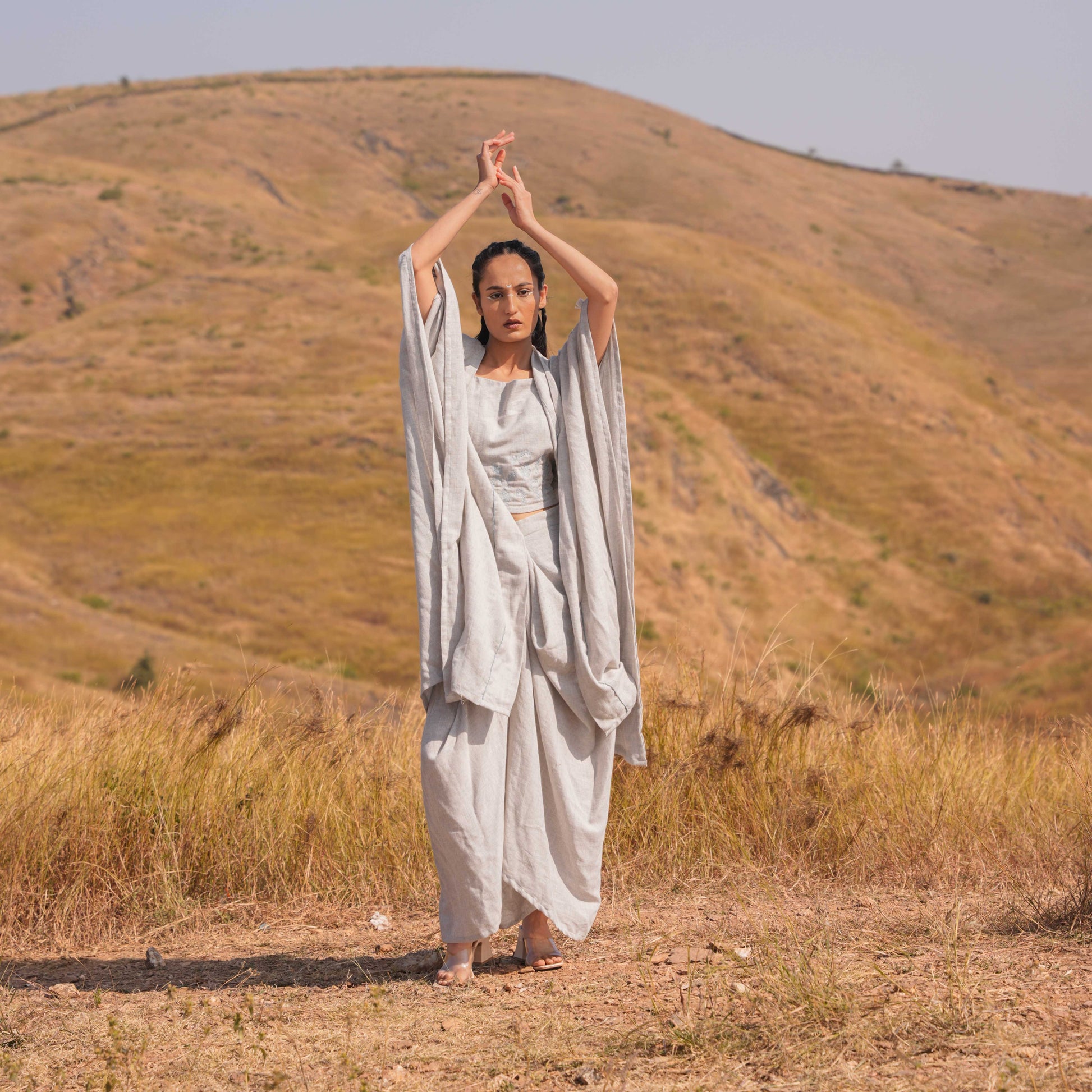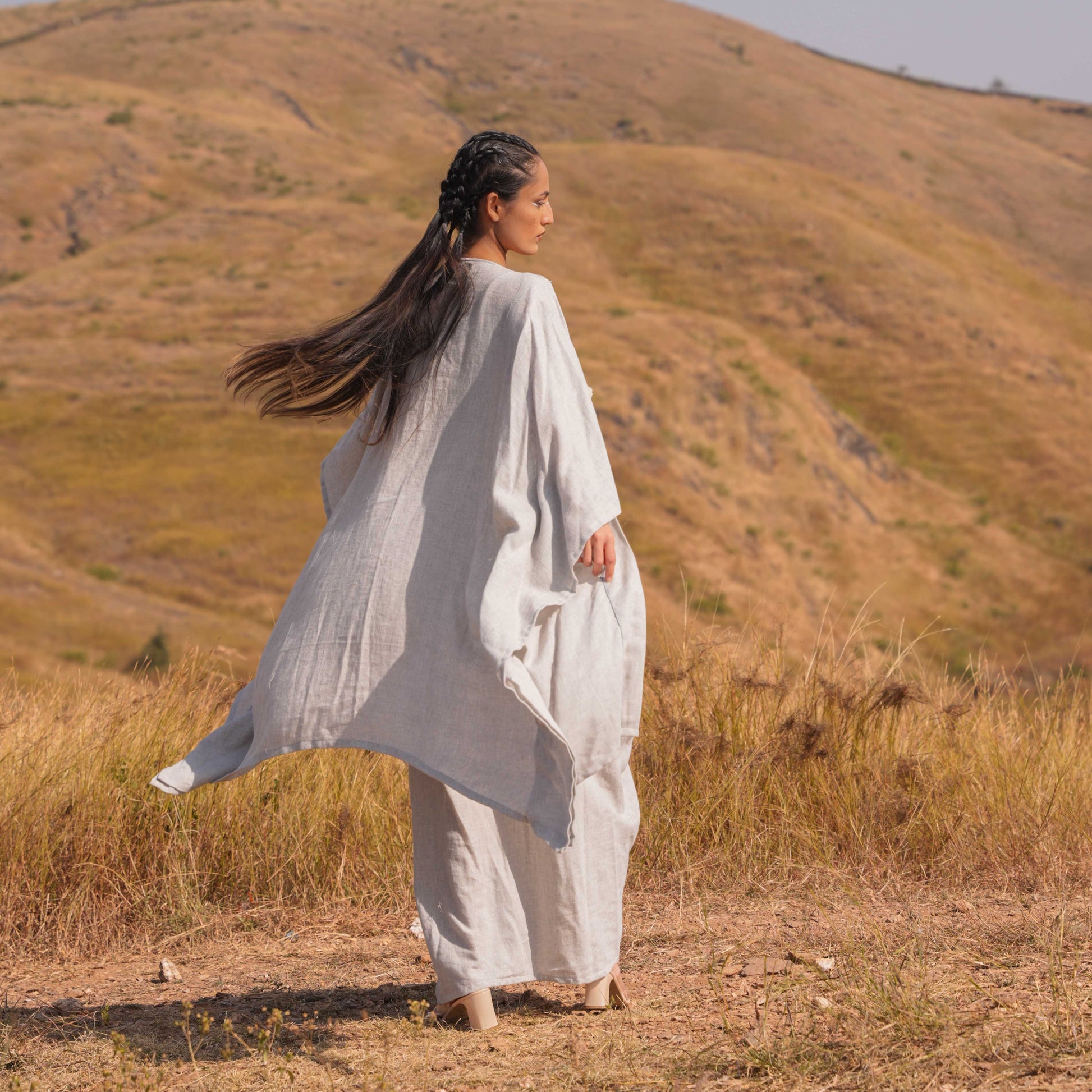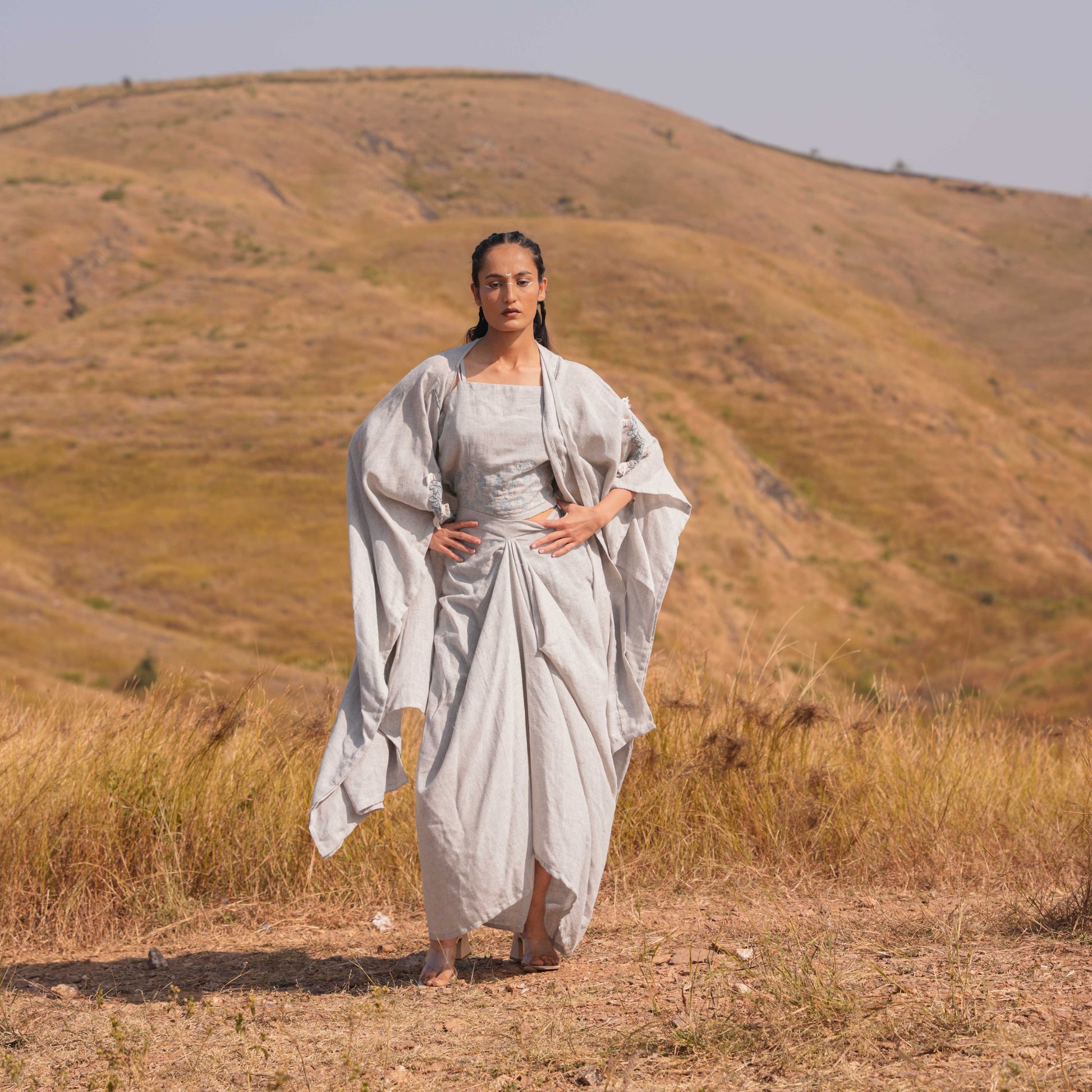 A celebration of artistry and elegance, skillfully blending printed Chanderi and cotton fabrics to create a sophisticated and timeless look. The neckline is adorned with printed pleats and Katha details, adding intricate charm and texture to the ensemble.