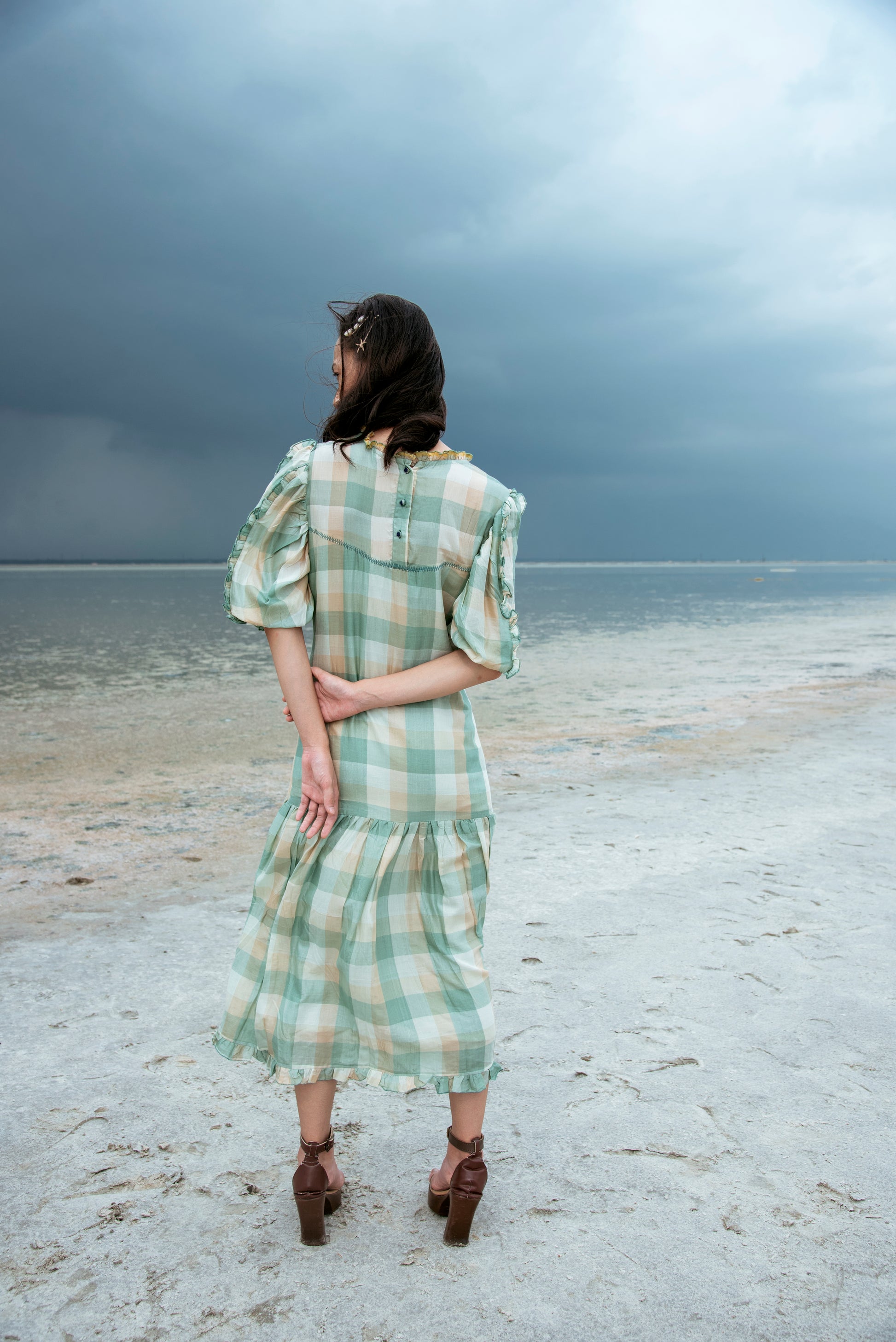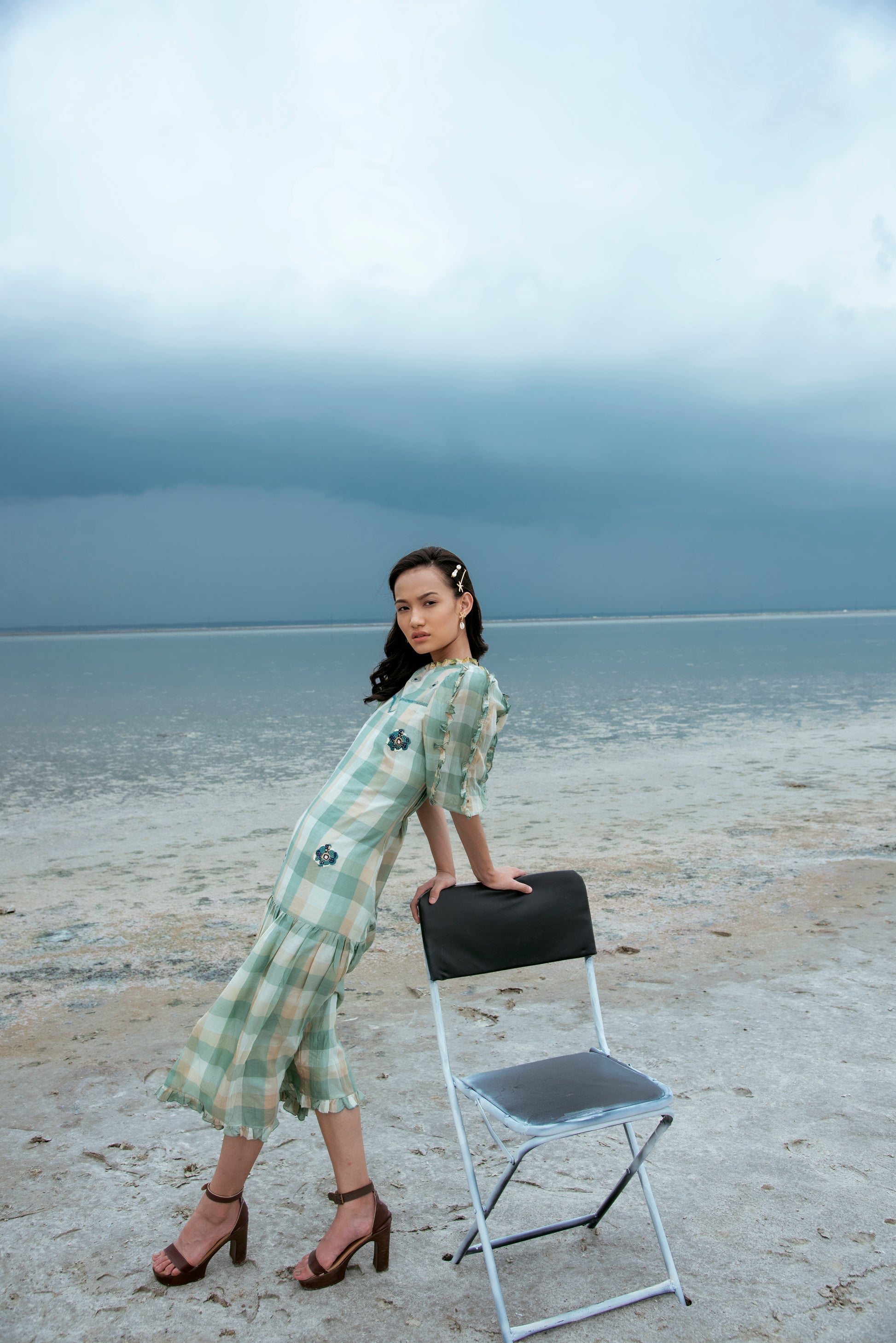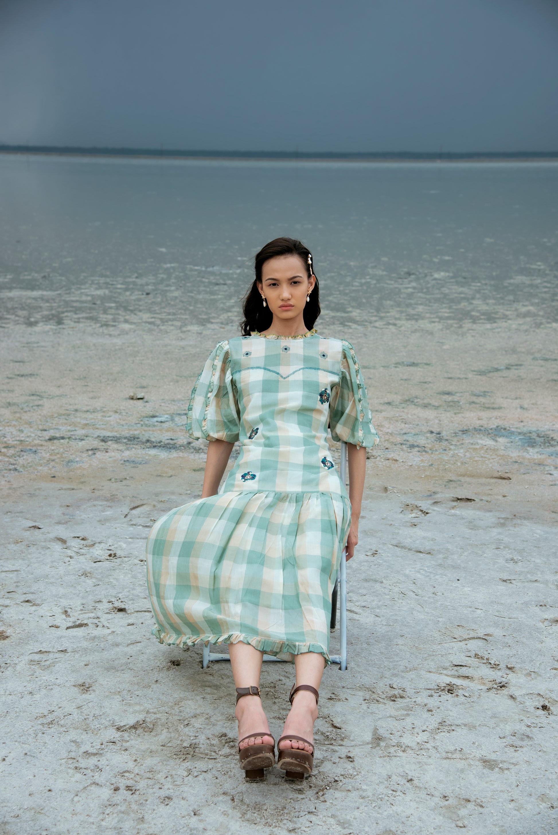 This silhouette is made in handwoven silk fabric in soothing shades of green & yellow checks . It has scoop neckline with melon sleeves and ruffle details on the neckline with a opening at the back. With detailed hand embroidery on the yoke, bodice & on the buttons, this is an interesting silhouette and one of its kind. This collection is an assorted range of textiles & handspun fabrics sourced from Banaras, Islampur, Murshidabad & quaint villages of India. The inspiration for the embellishments & embroideries has been derived from the artist Huguette Caland and her work over the years. Intricate crafts like sujani & kantha are the key embroidery techniques been used.