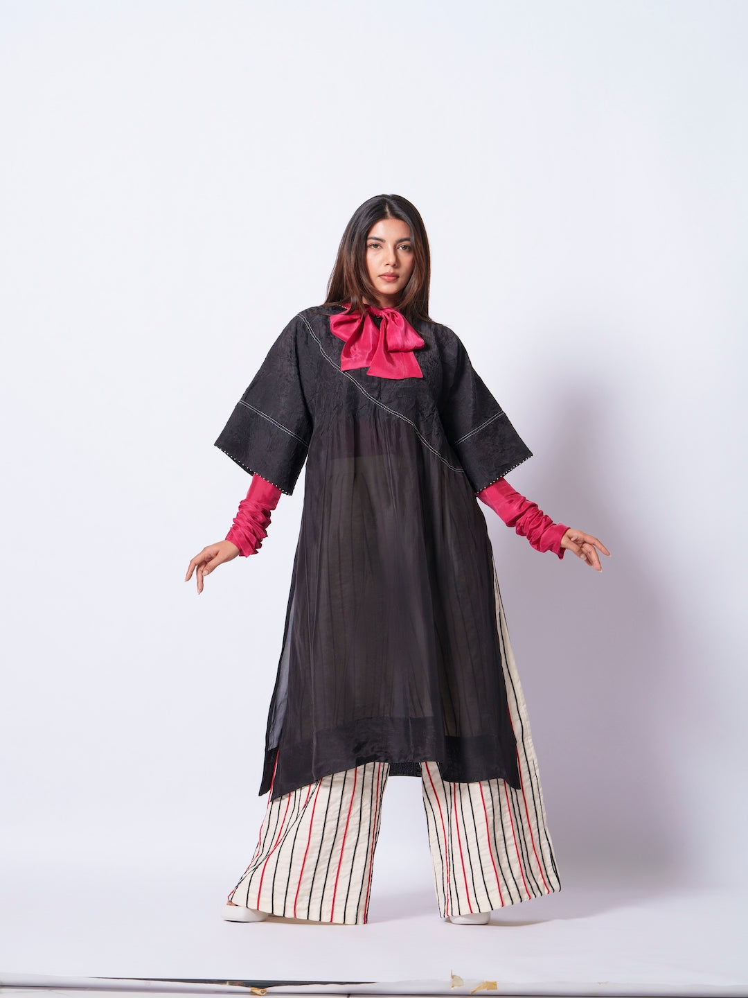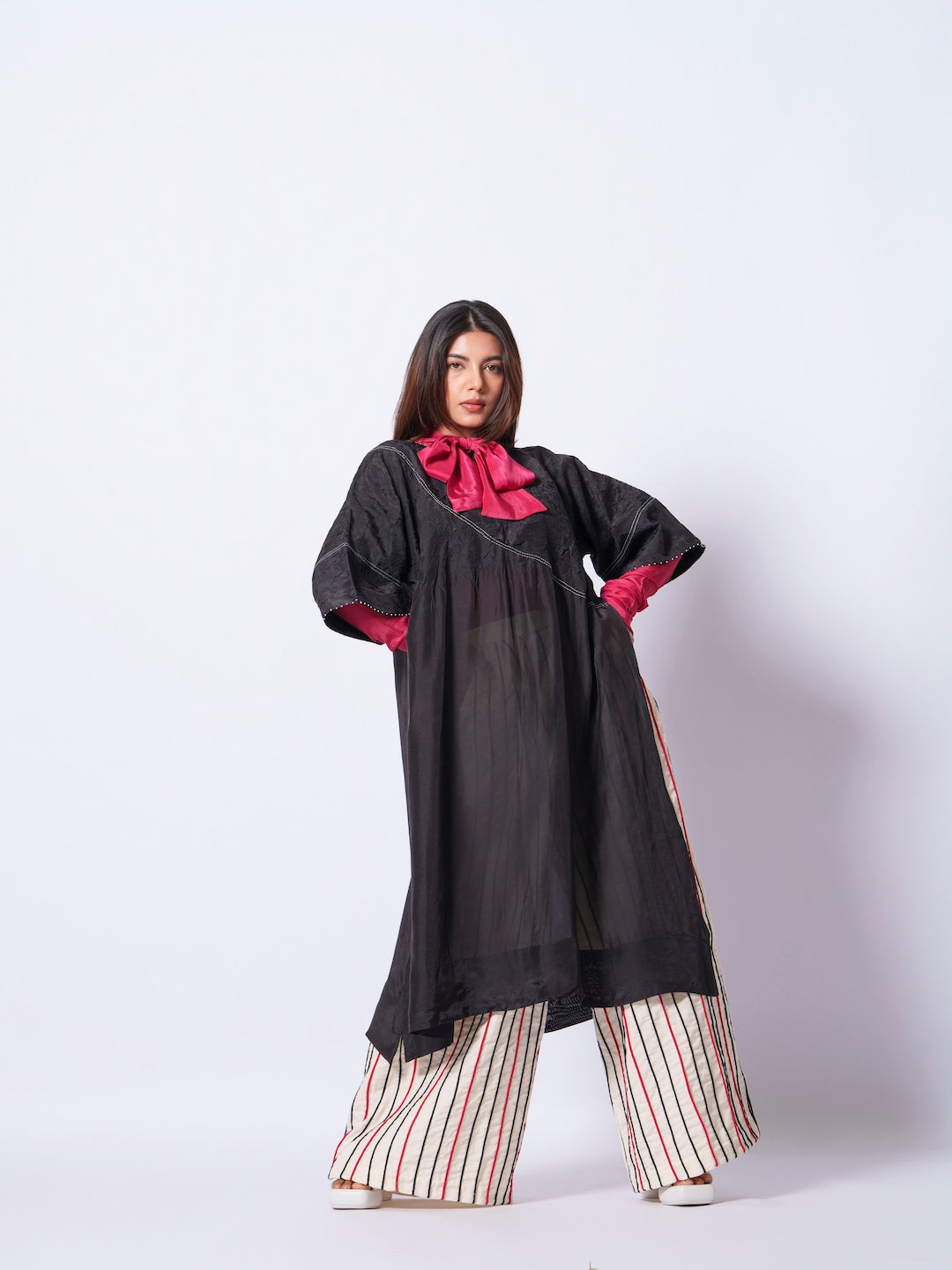 Like ripples caught in stillness. Relaxed, oversized trousers crafted in handwoven cotton with a subtle wet-plaid texture. Detailed with hand-sewn cording in striking contrast — easy yet intentional, fluid yet grounded.