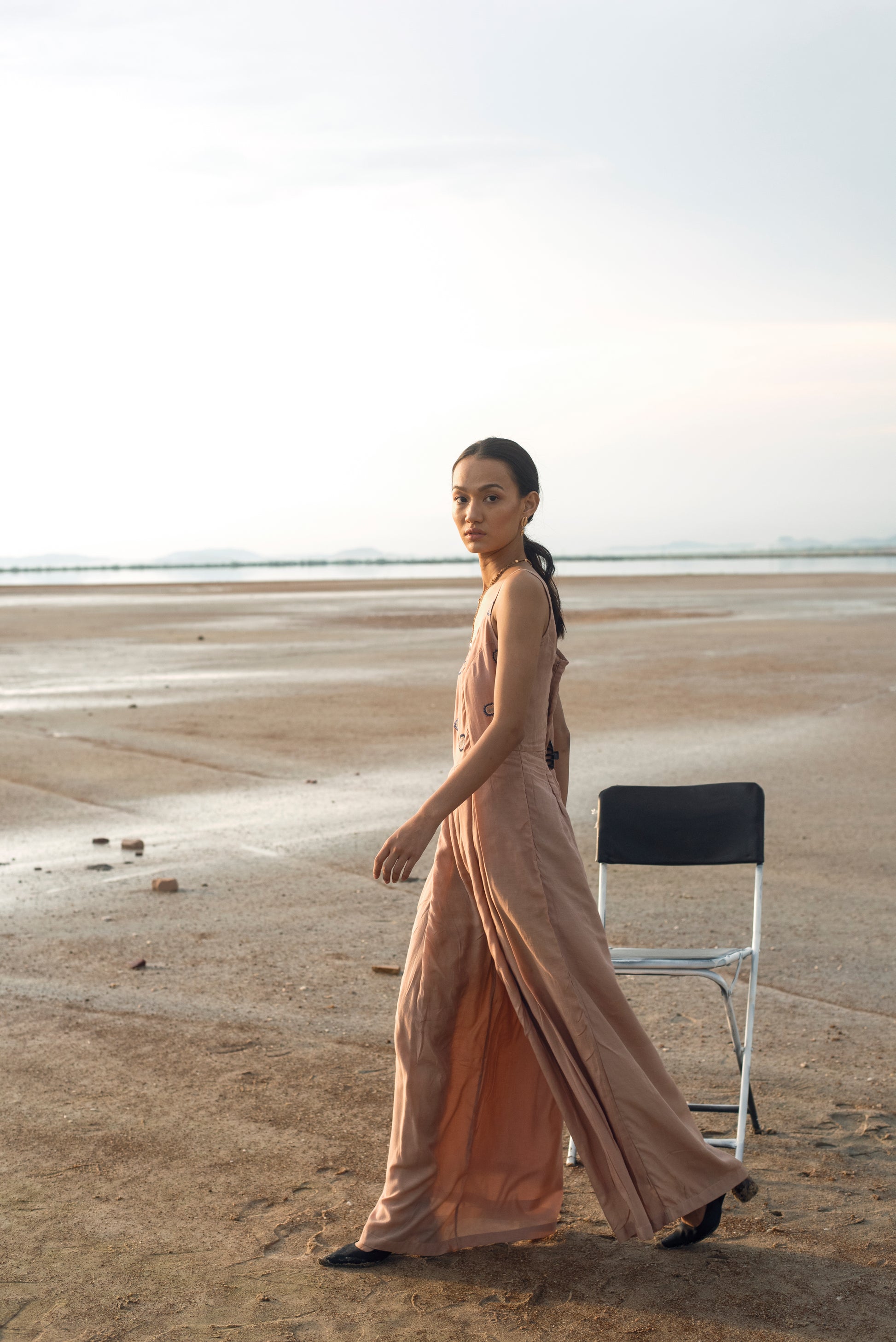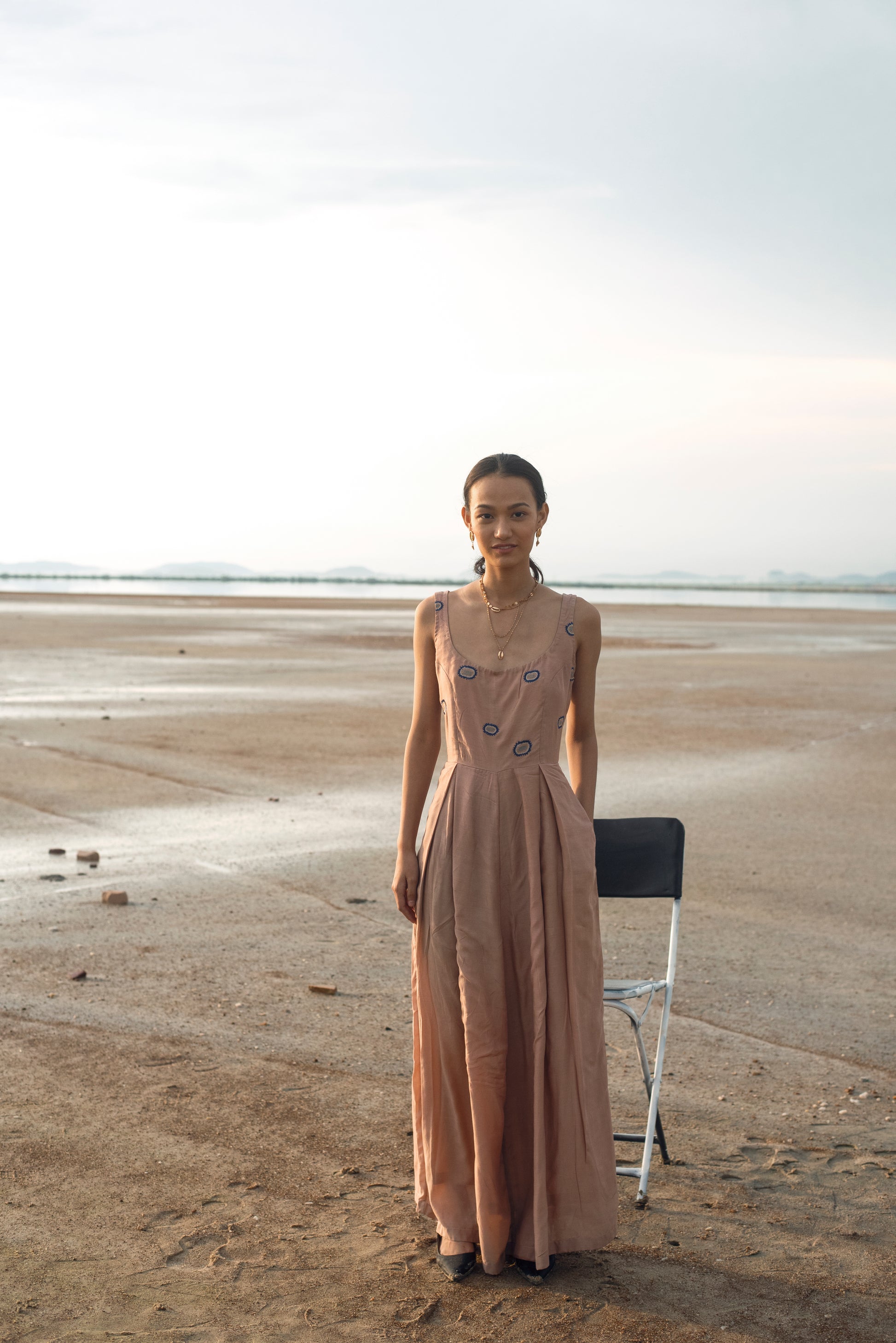 This is a classic jump suit style made in cotton silk fabric, handwoven in West Bengal. It’s a sleeveless jumpsuit with a deeper U scoop neckline & princess cut bodice for a perfect fit with box pleat details in the jumpsuit. This style is made in tan color with a highlight of blue color hand embroidery in abstract coral motifs. This collection is an assorted range of textiles & handspun fabrics sourced from Banaras, Islampur, Murshidabad & quaint villages of India. The inspiration for the embellishments & embroideries has been derived from the artist Huguette Caland and her work over the years. Intricate crafts like sujani & kantha are the key embroidery techniques been used.