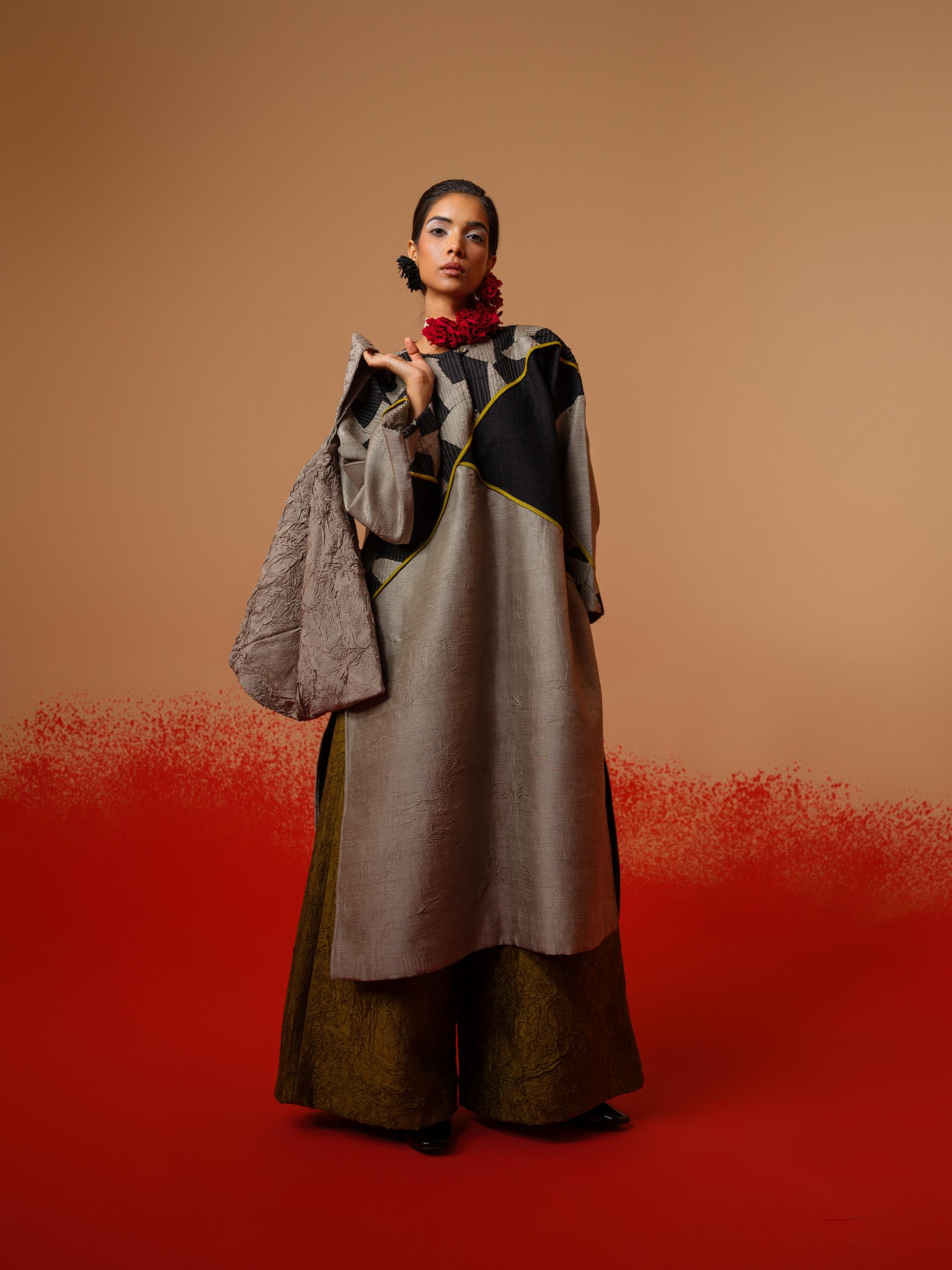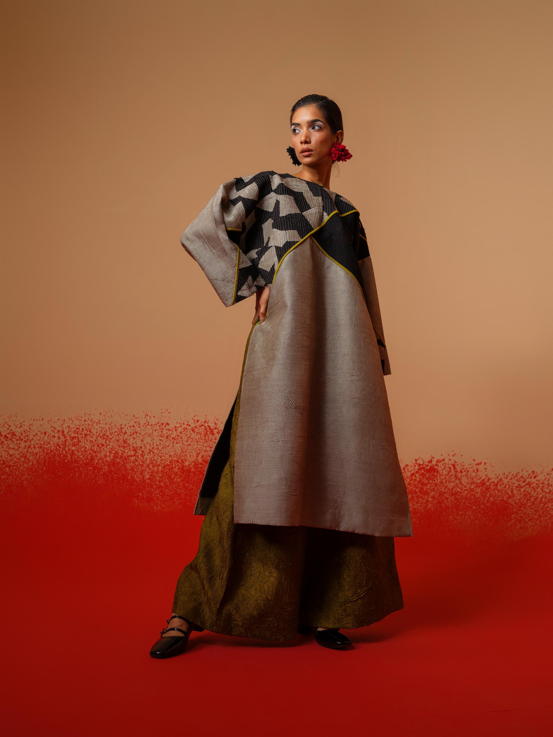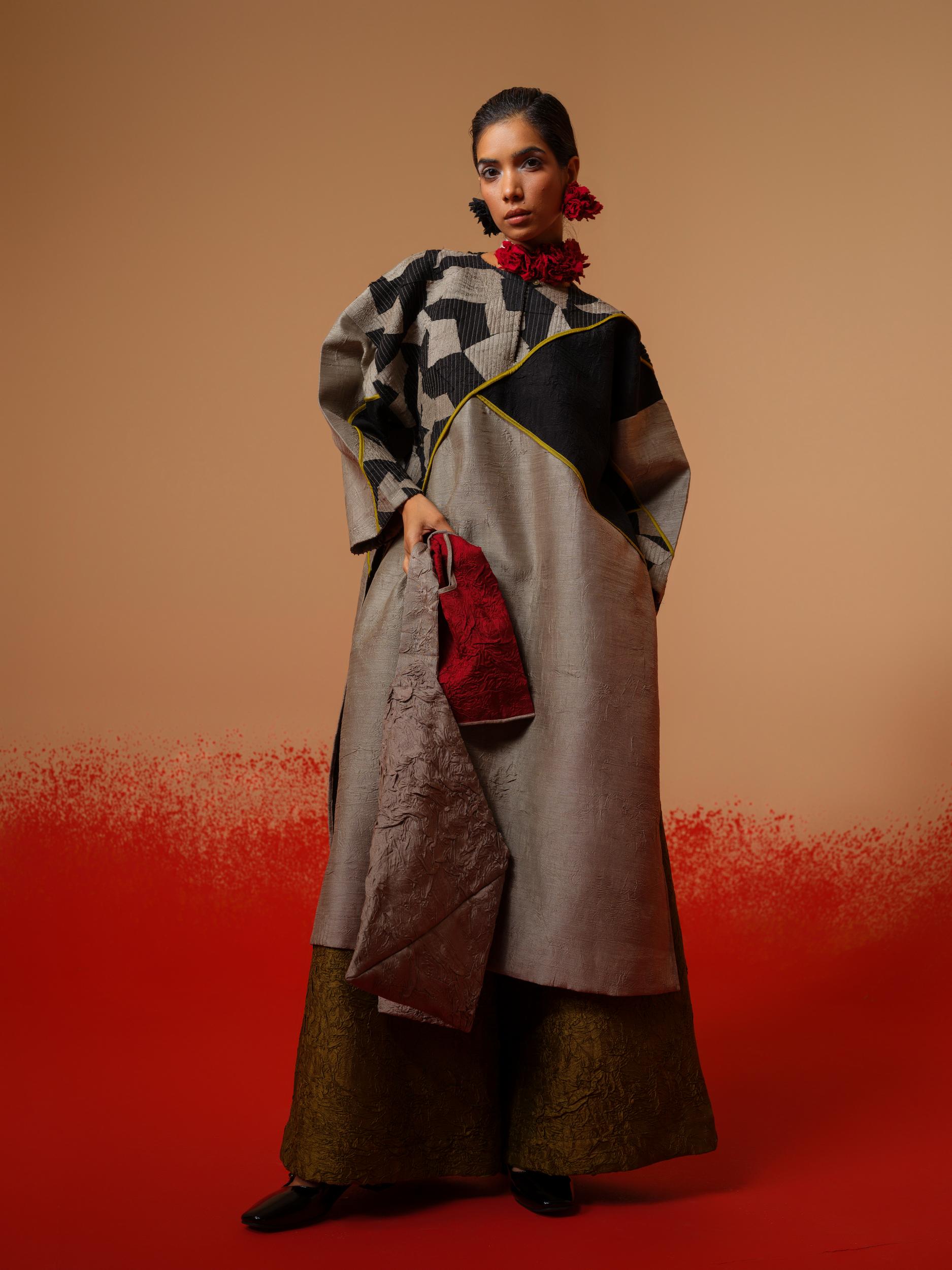 Fragments gathered, stories stitched. A one-size tunic crafted in our signature crushed silk, detailed with upcycled chindi patchwork and vibrant contrast bindings. Easy, effortless, and layered with quiet memories.