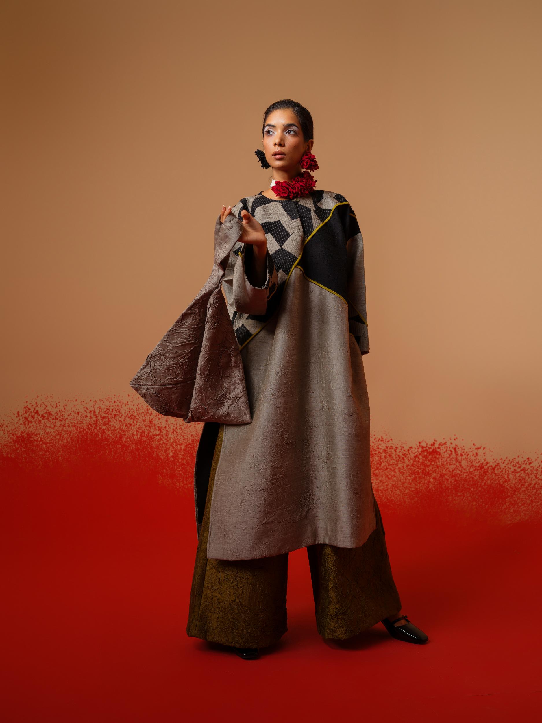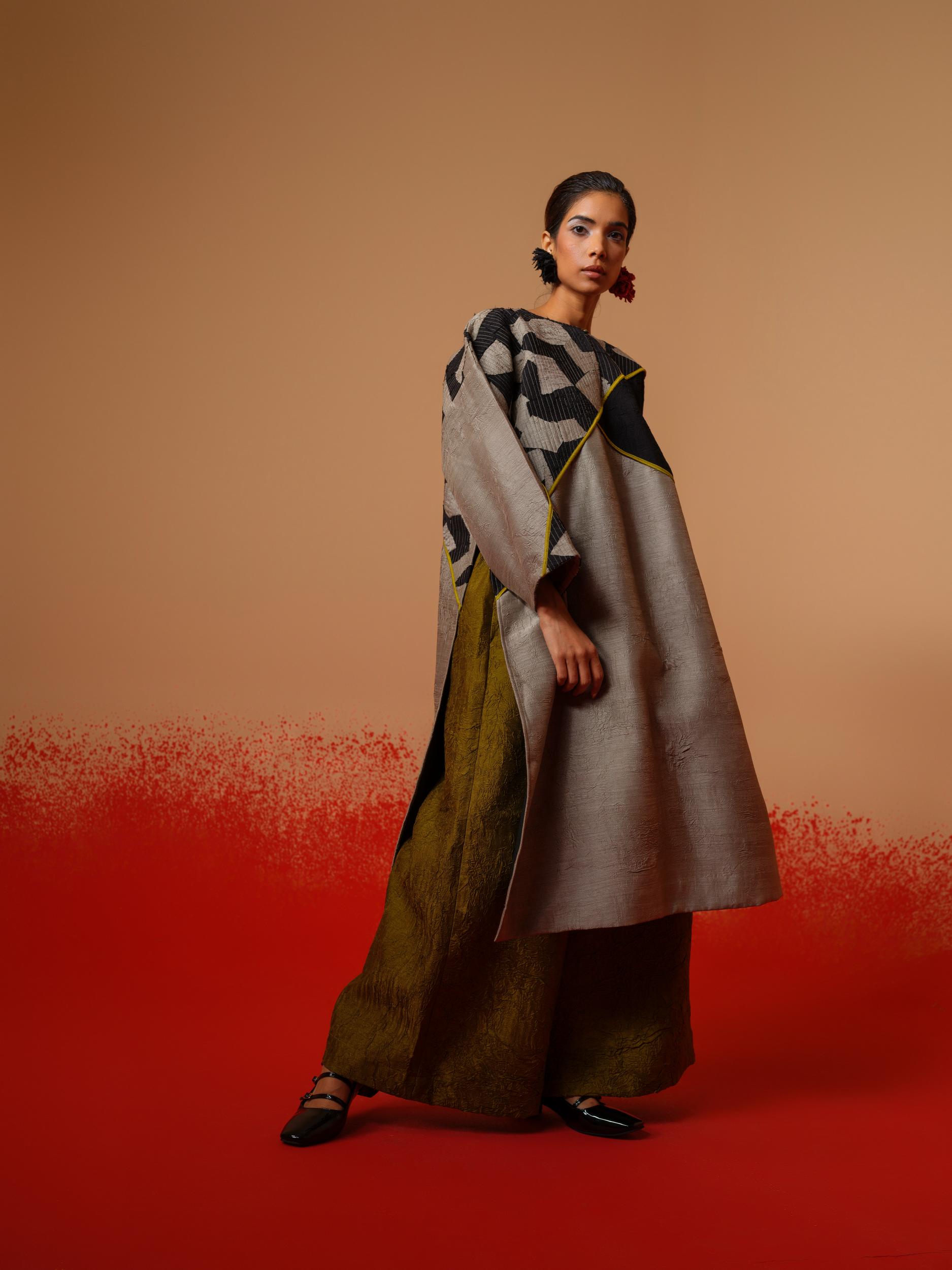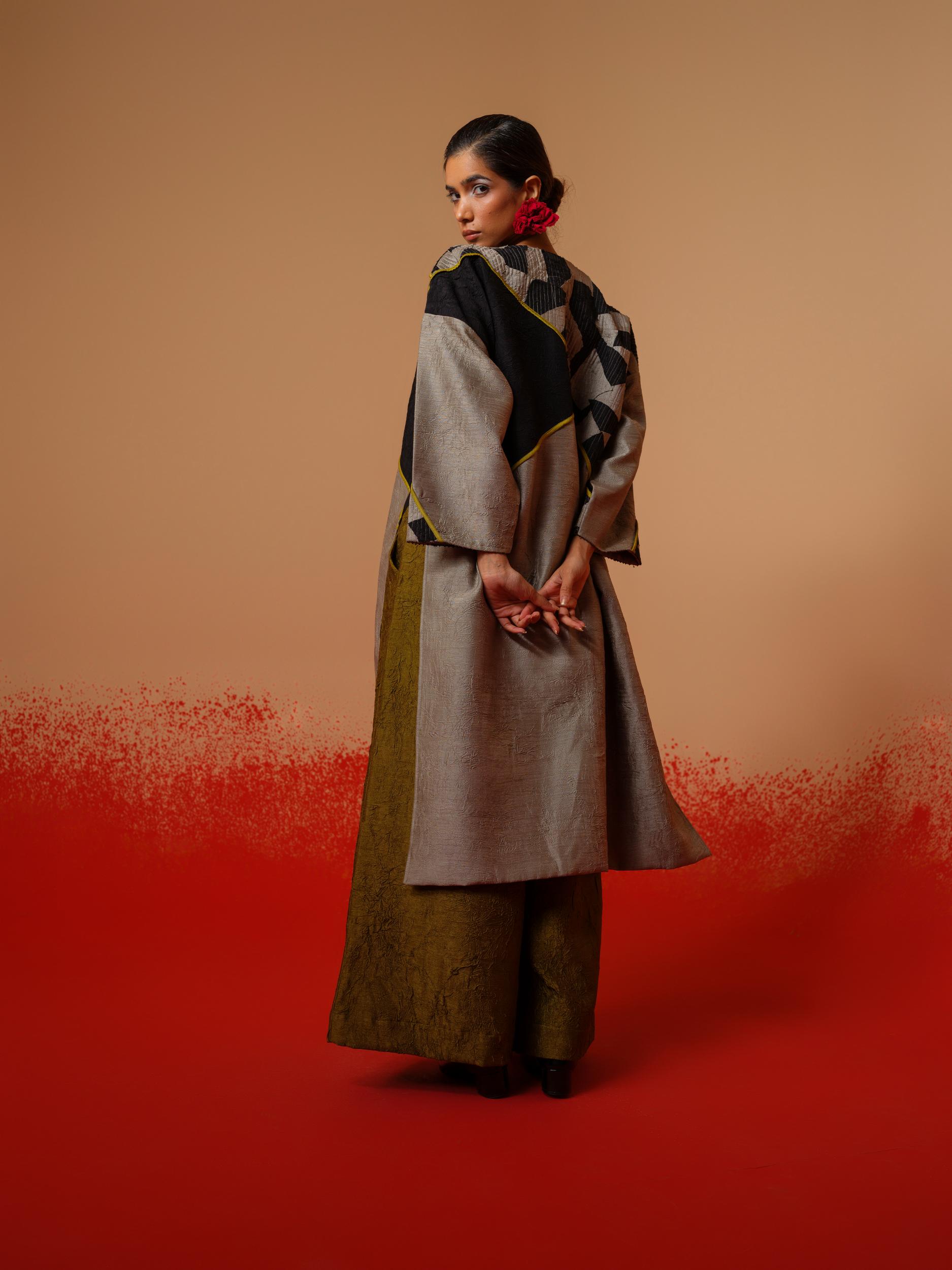 Fragments gathered, stories stitched. A one-size tunic crafted in our signature crushed silk, detailed with upcycled chindi patchwork and vibrant contrast bindings. Easy, effortless, and layered with quiet memories.
