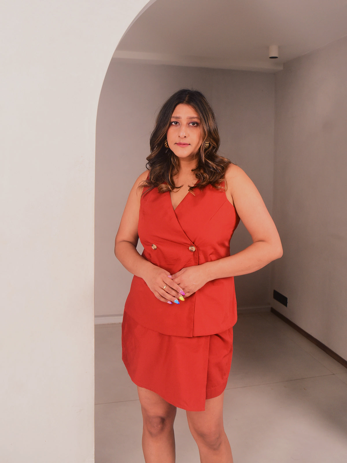 Made from brick red-dyed cotton, the Dee Vest adds smart tailoring to your wardrobe. With a double-breasted button front, V-neckline, and an adjustable back belt, it shapes the silhouette effortlessly. Layer it over a fitted tee or pair with the matching Dee Skort for a sharp, coordinated statement. Ideal for creative presentations, exhibitions, or informal office events.