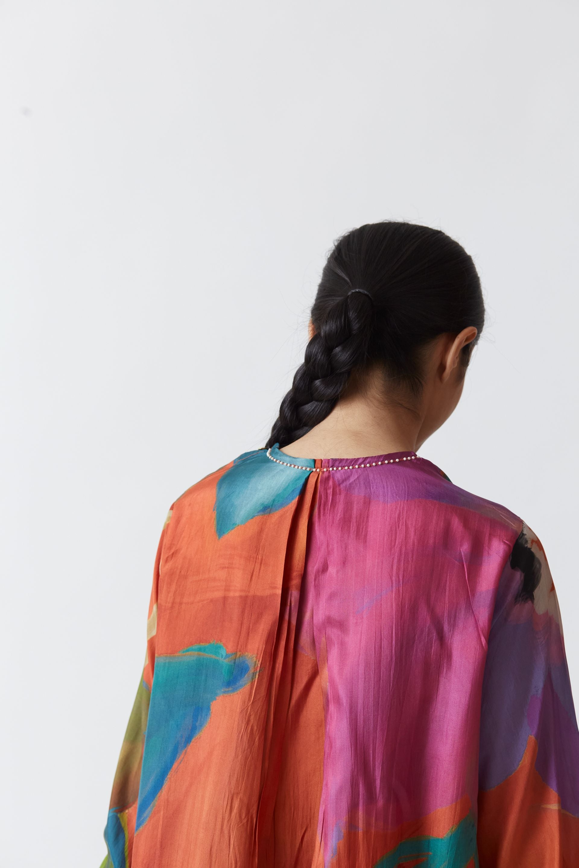 The set is crafted in the amethyst print carefully printed on Pure silk featuring white pearls on the neck.