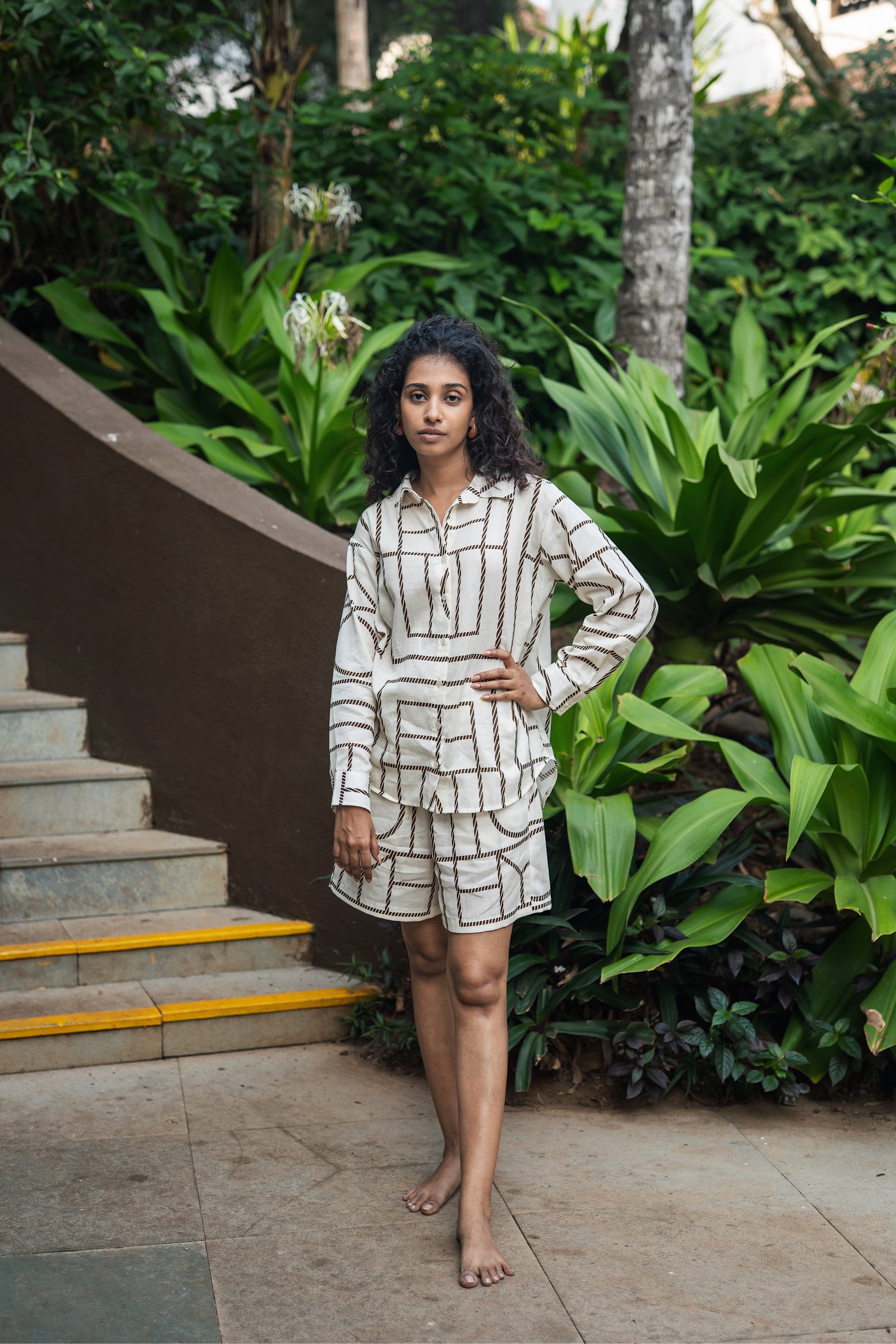 Diana shirt is a relaxed fit button down shirt made from linen cotton fabrication in geometric print.