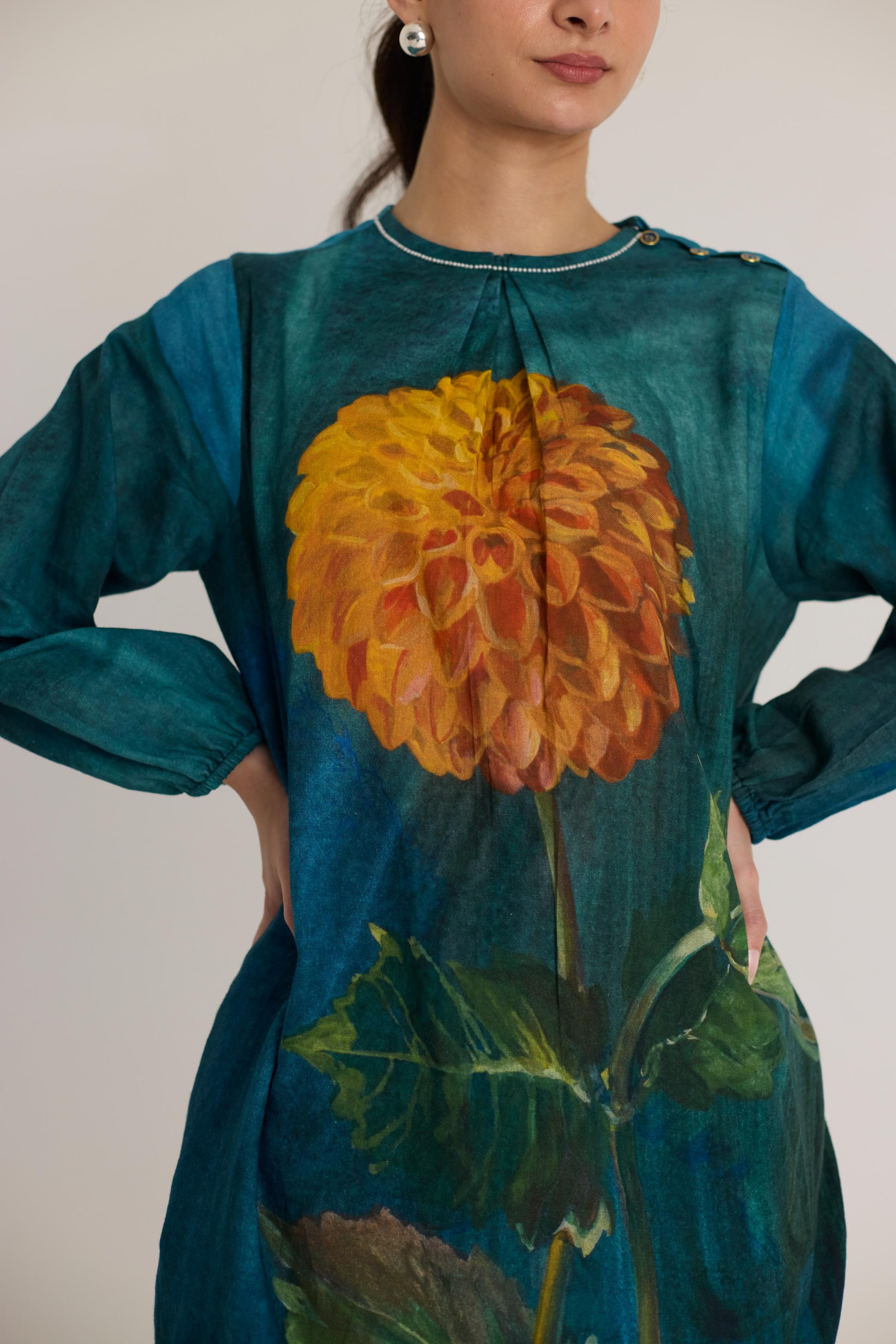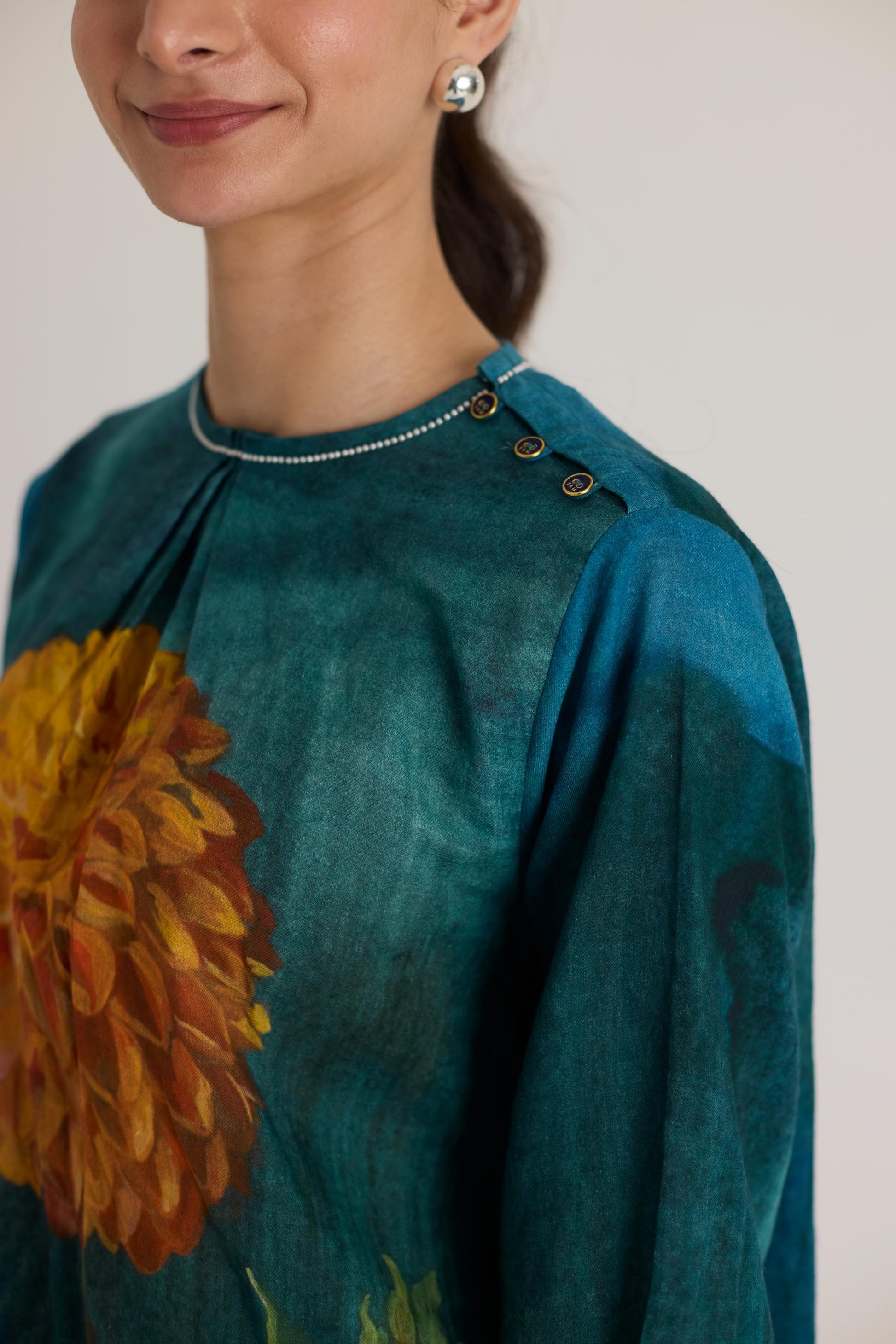 Make a striking impression with this artistic kurta set, featuring a dramatic oversized floral print on a deep teal canvas. The vibrant golden bloom at the center adds a unique contrast, making it a wearable piece of art. Crafted from breathable fabric with a relaxed silhouette, this set is designed for effortless elegance. The straight-cut trousers complement the flowy kurta, making it perfect for both casual and semi-formal occasions.