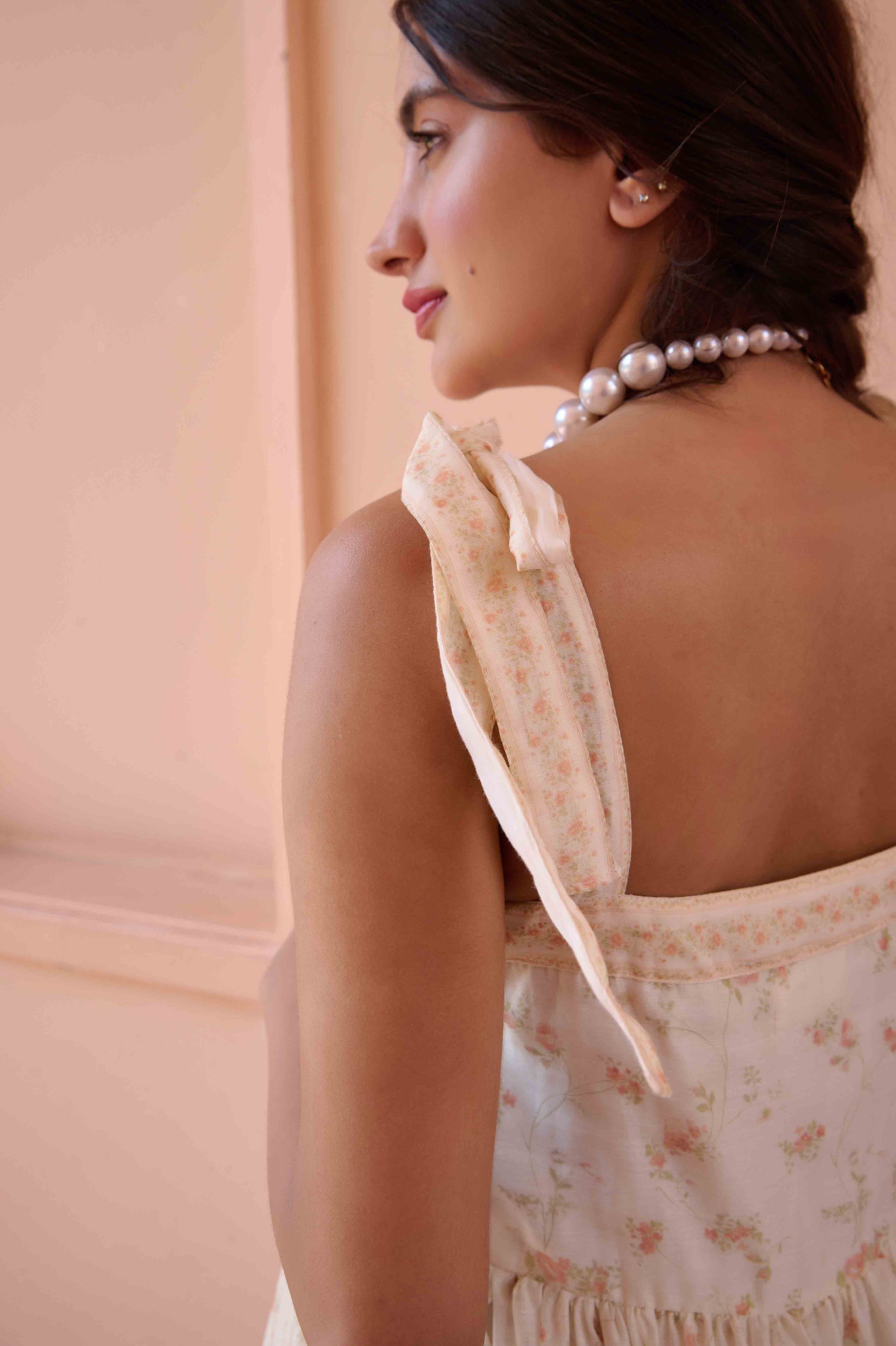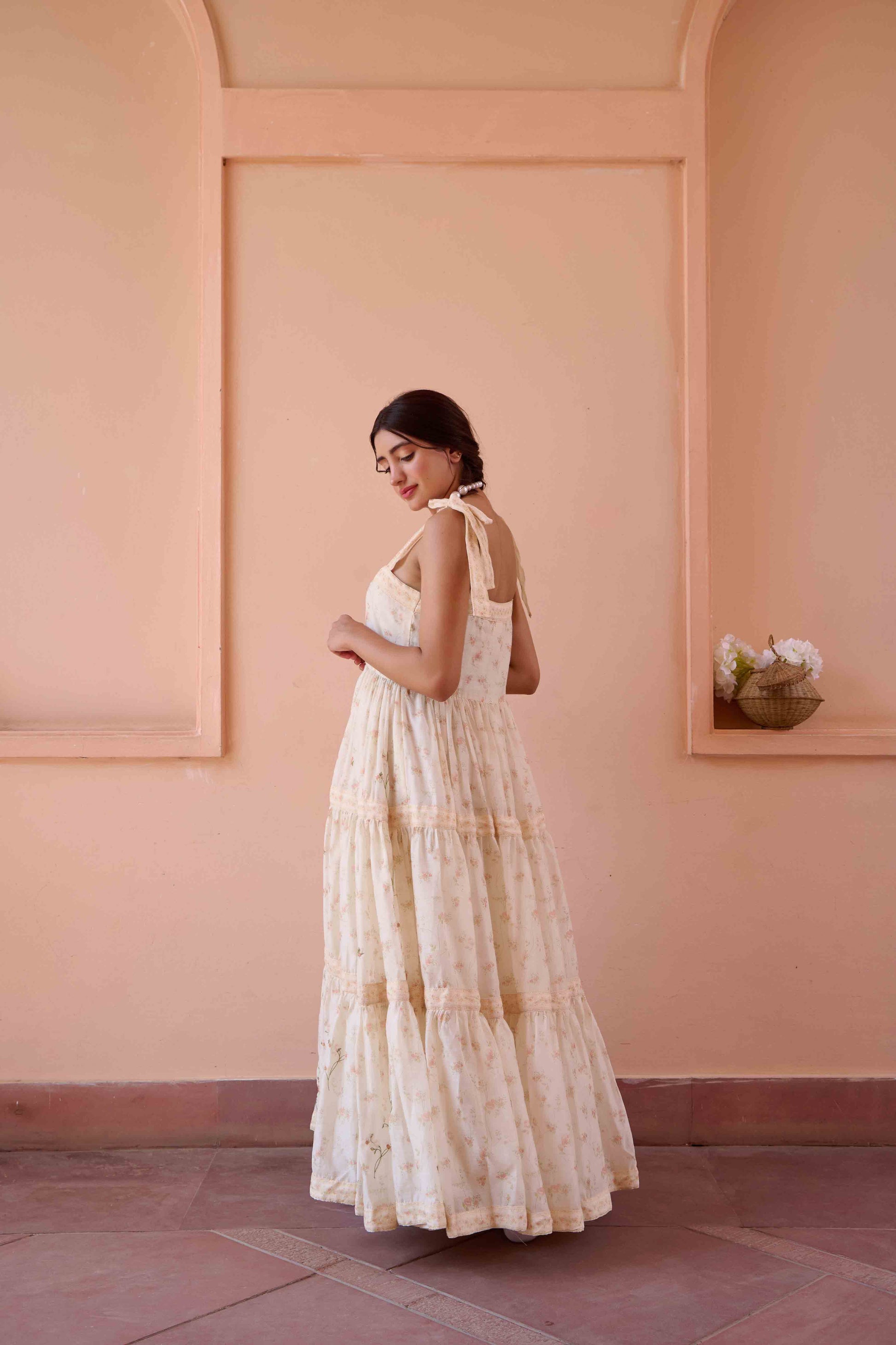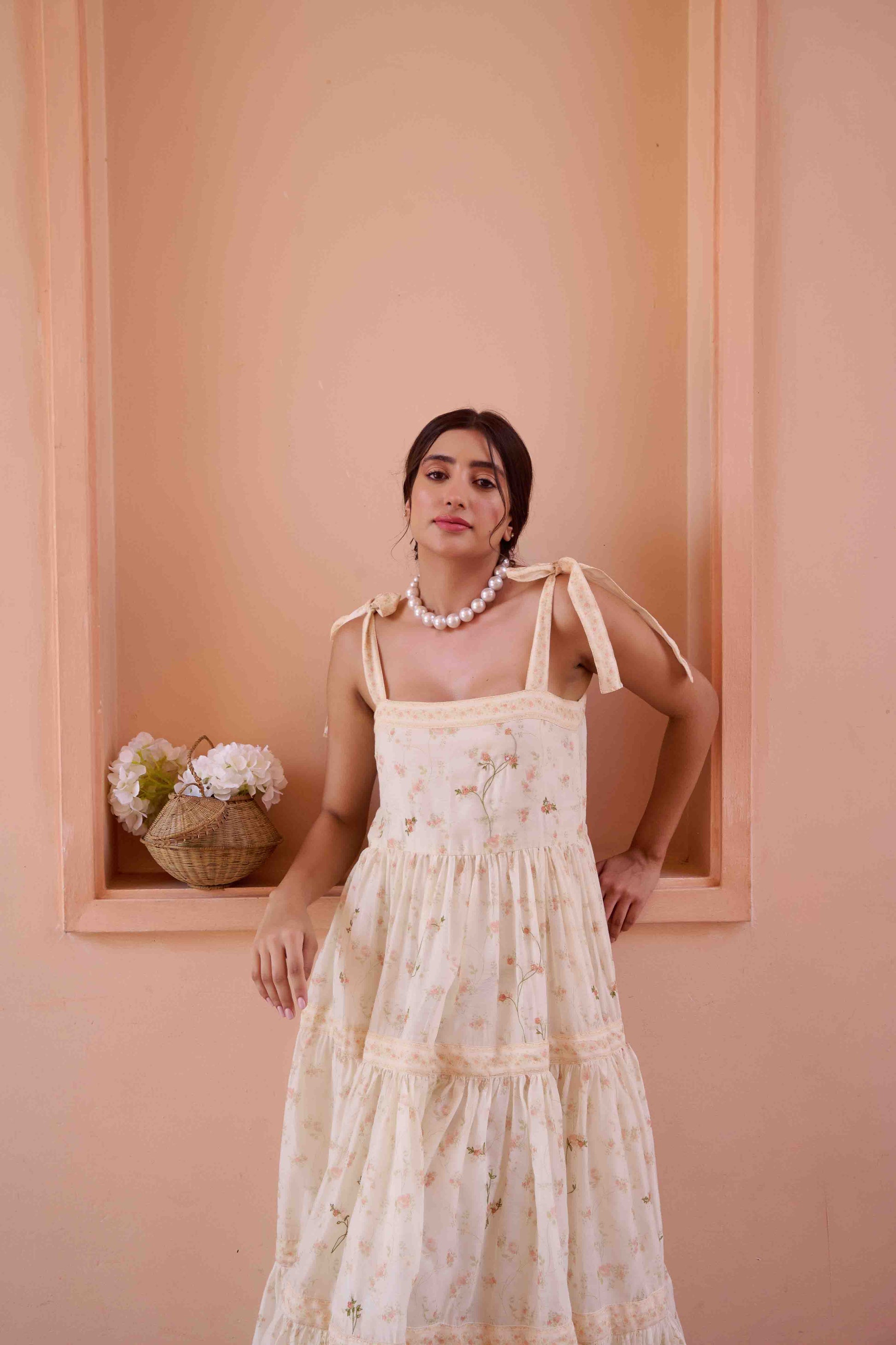 introducing our Chanderi Printed Tier Dress, a fusion of elegance and whimsy that exudes effortless charm. This dress features delicate tie straps that add a hint of playfulness and adjustability. Detailed with intricate highlight and sequence detailing, the dress sparkles subtly, enhancing its allure. Perfect for sunny days or special occasions, this dress promises comfort and style with every wear, making it a versatile addition to your wardrobe.