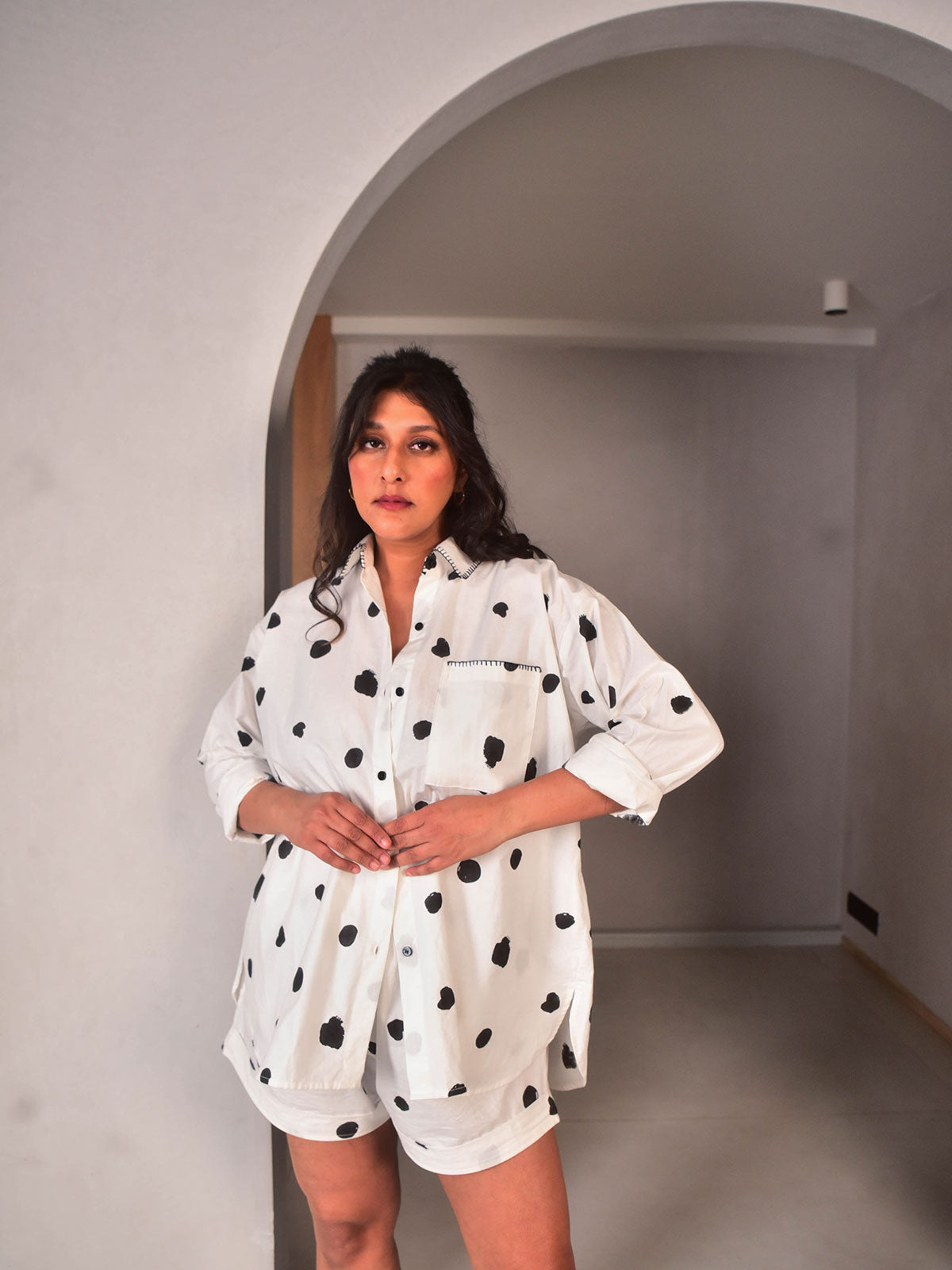 Timeless polka meets our signature separates. Cut in our exclusive black and white polka hand-block printed cotton, this oversized set is made for light-heartted days. Hand-embroidered edging in its collar and pockets. Paired with co-ordinated shorts for the full look. Wear as a two-piece or style with the bralette for an effortless getaway look.