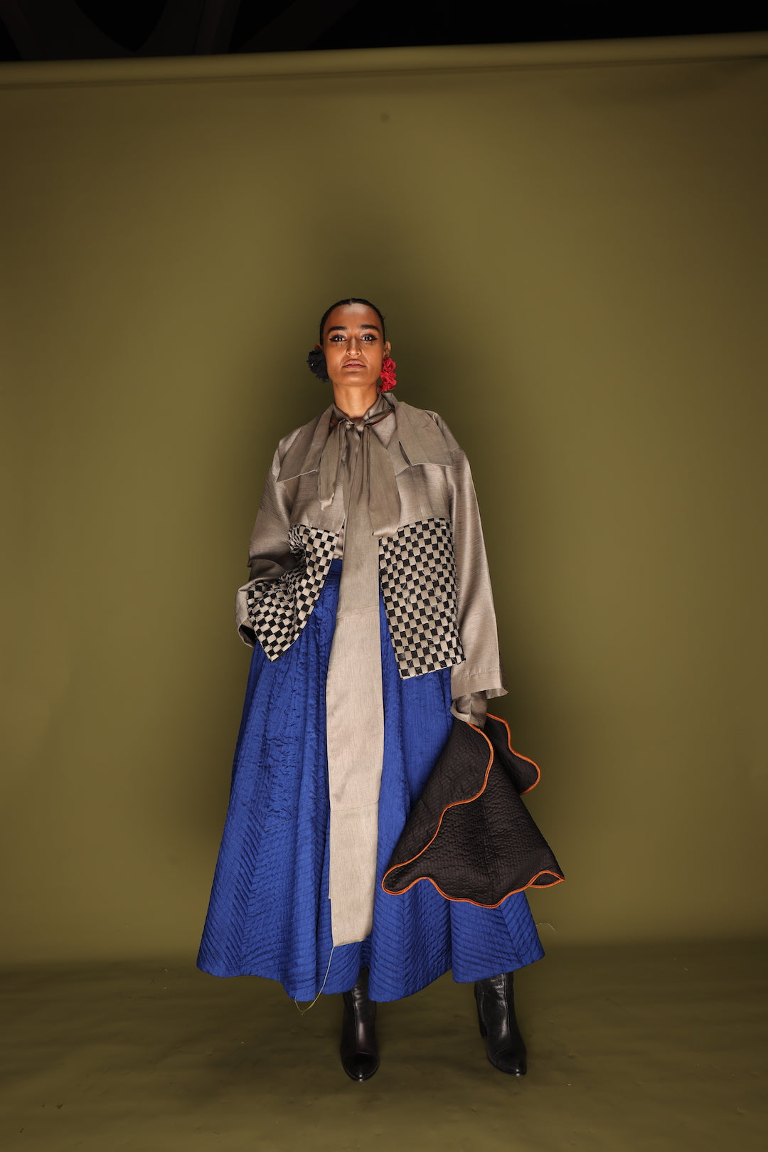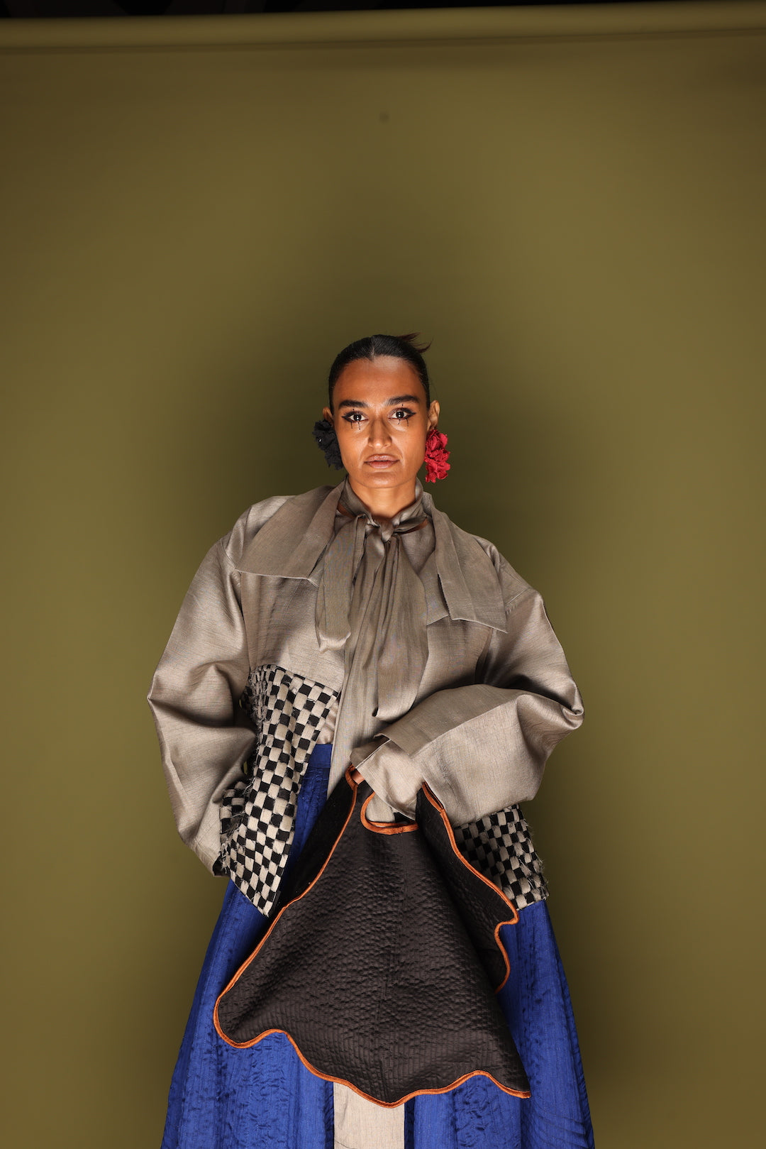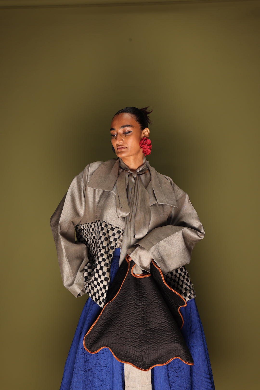 A quiet patchwork of patience and precision. An oversized overlay crafted in silk, featuring hand-woven checks meticulously made in-house from remnant fabrics — a slow and thoughtful celebration of material and making.