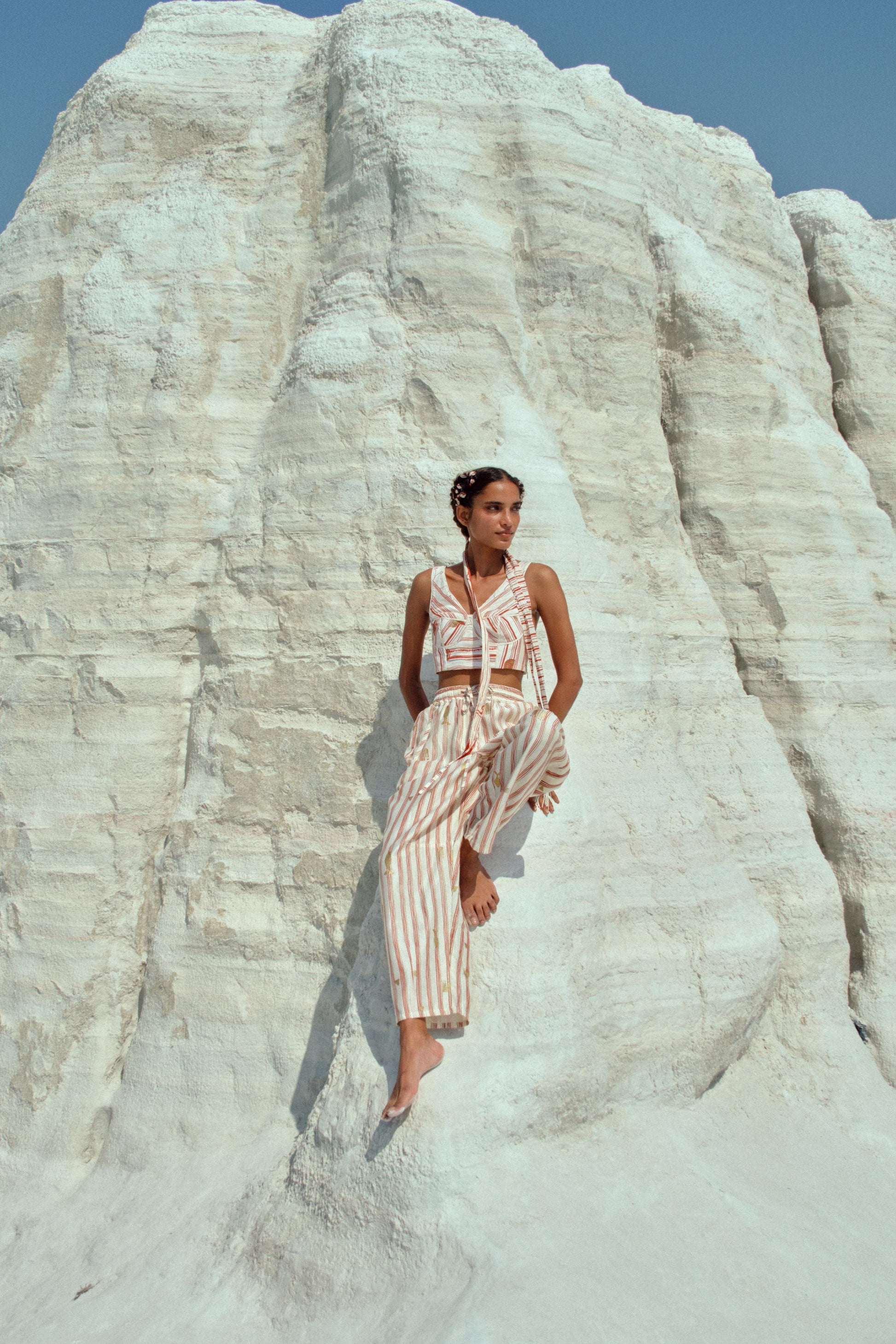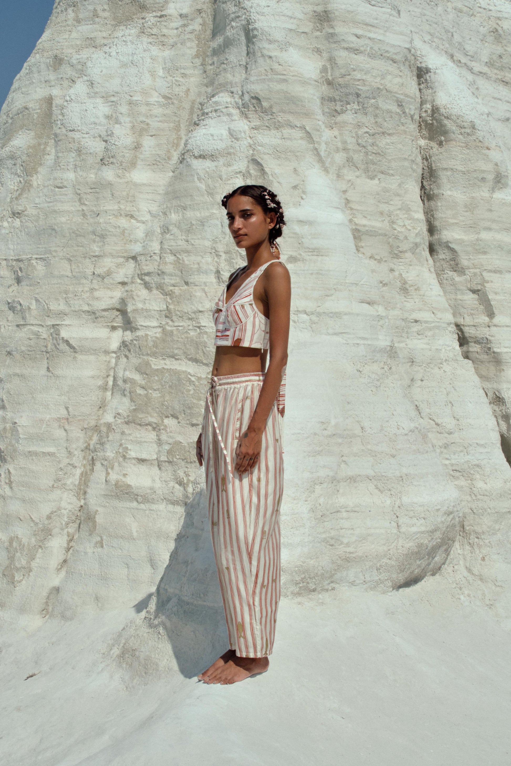 A modern take on the classic pant, the Eaindra Dart Pants sculpt the body with thoughtfully placed darts along the calf and hem. The elasticated waistband and drawstrings ensure comfort, while front buttons, side pockets, and a back welt pocket add functionality. Each detail is executed with hours of skilled handwork, merging casual ease with refined elegance in a versatile, wearable silhouette.