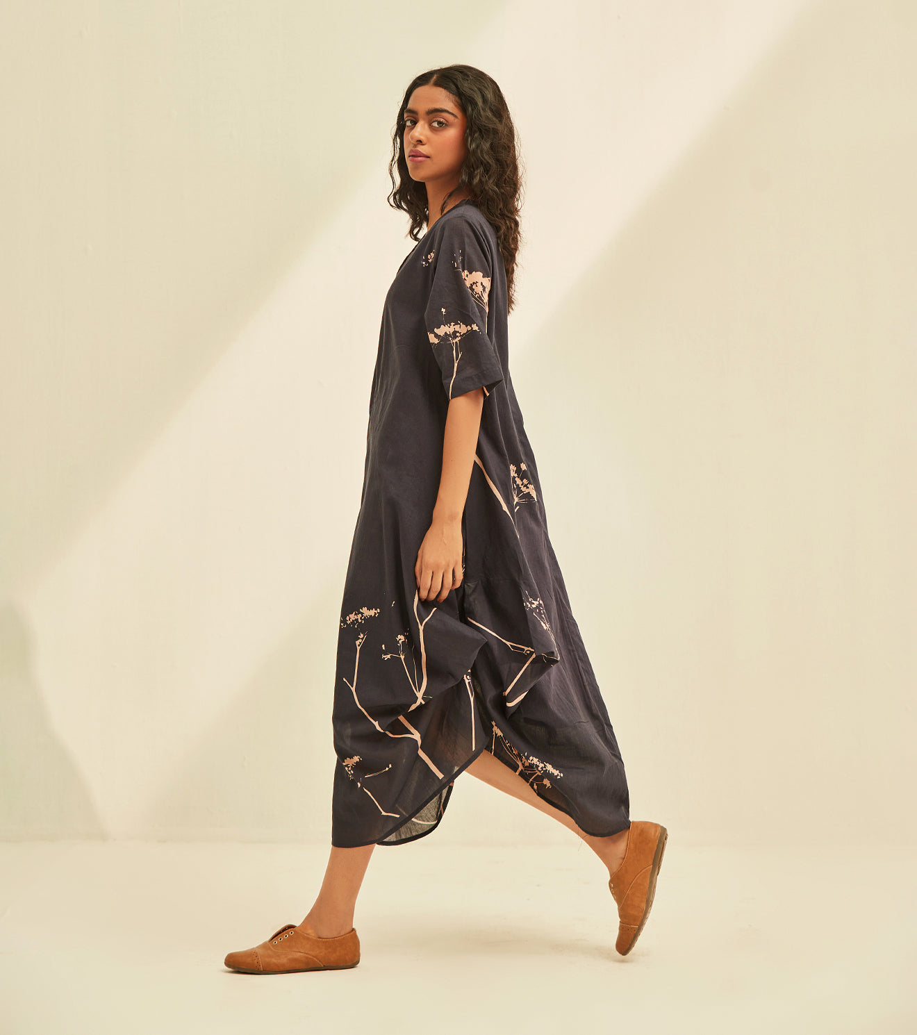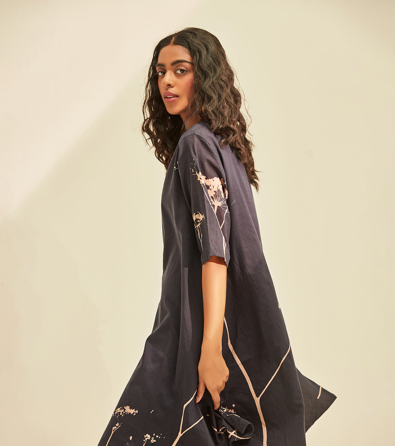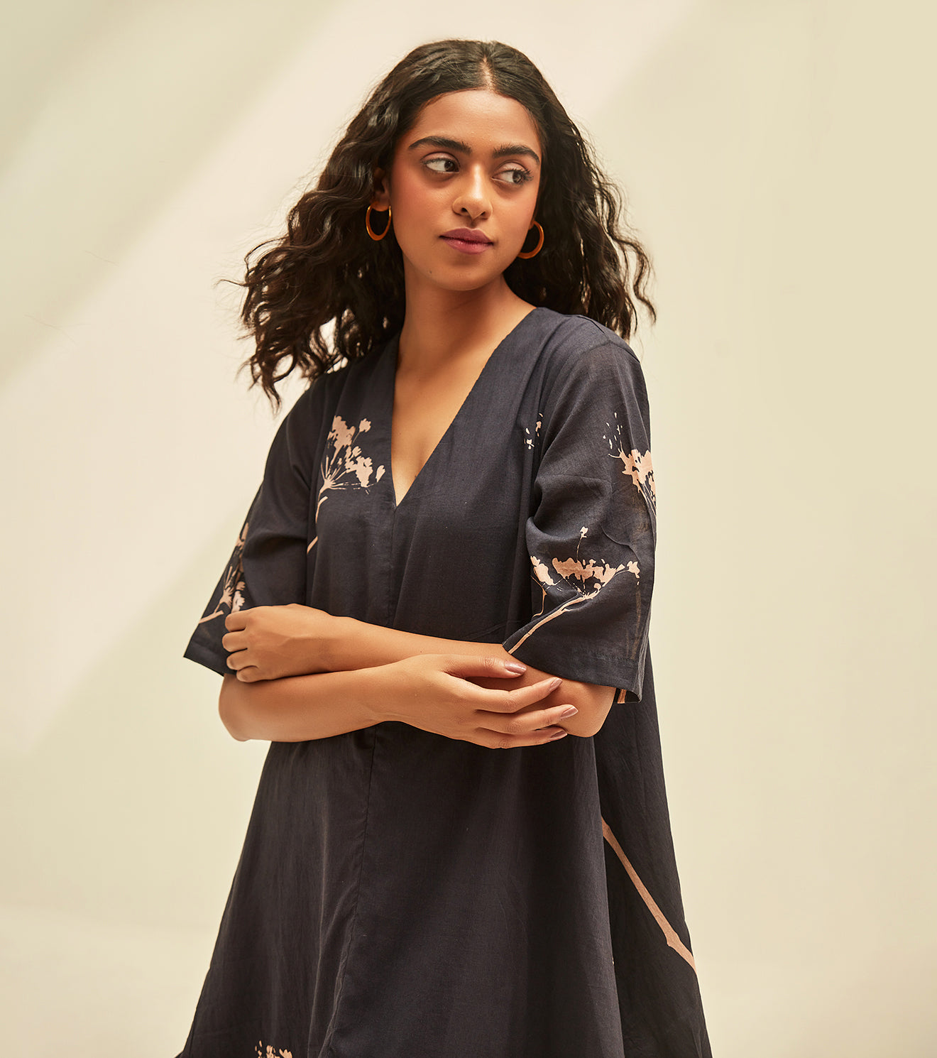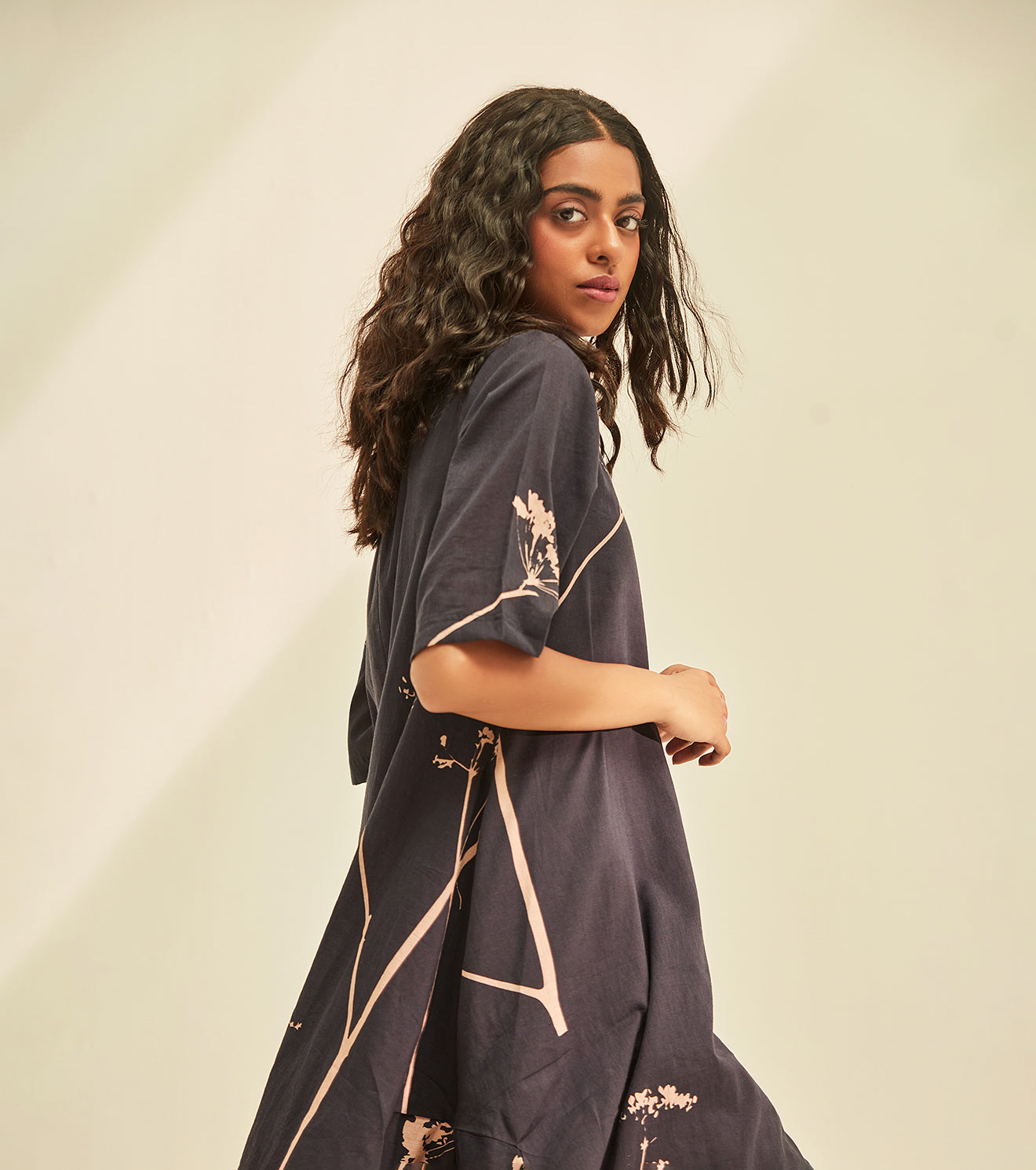 Eclipse embraces the serenity of nature during summers. adorned with a delicate floral print, it features a v neckline and side cowls.Handcrafted in India. Side seam pockets. Fully lined.