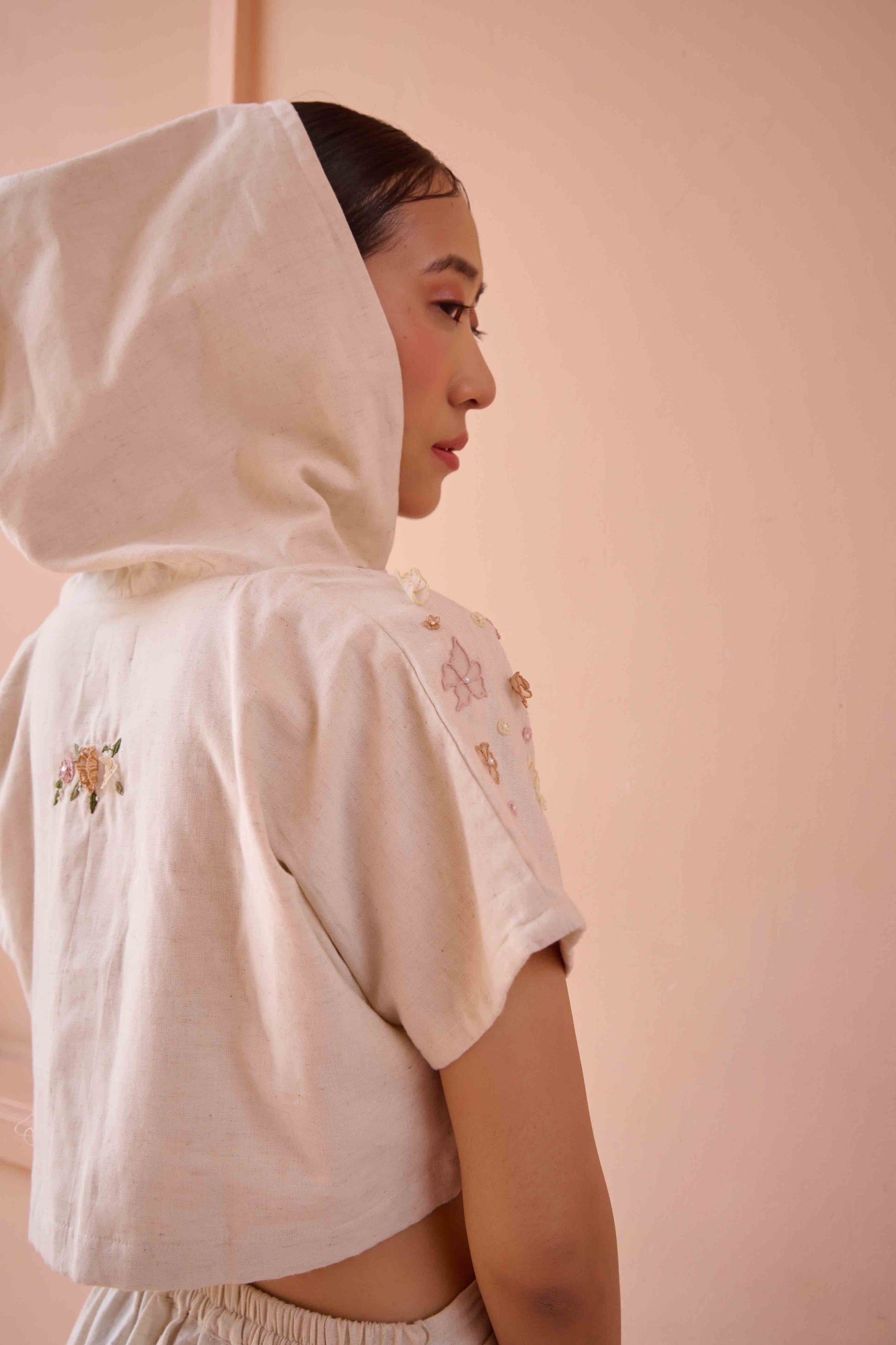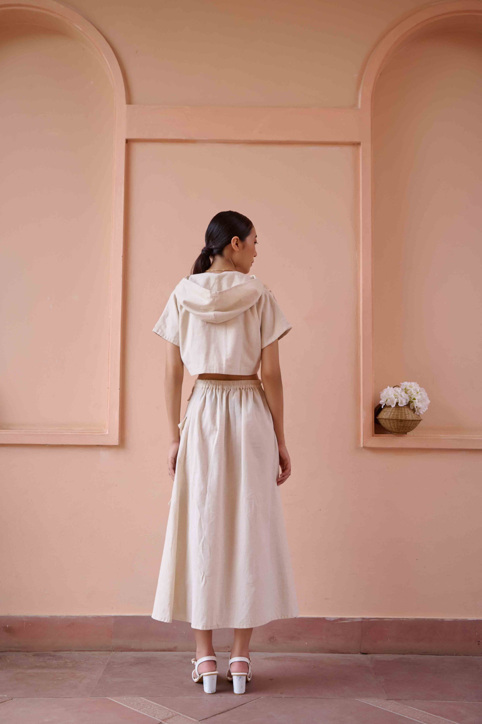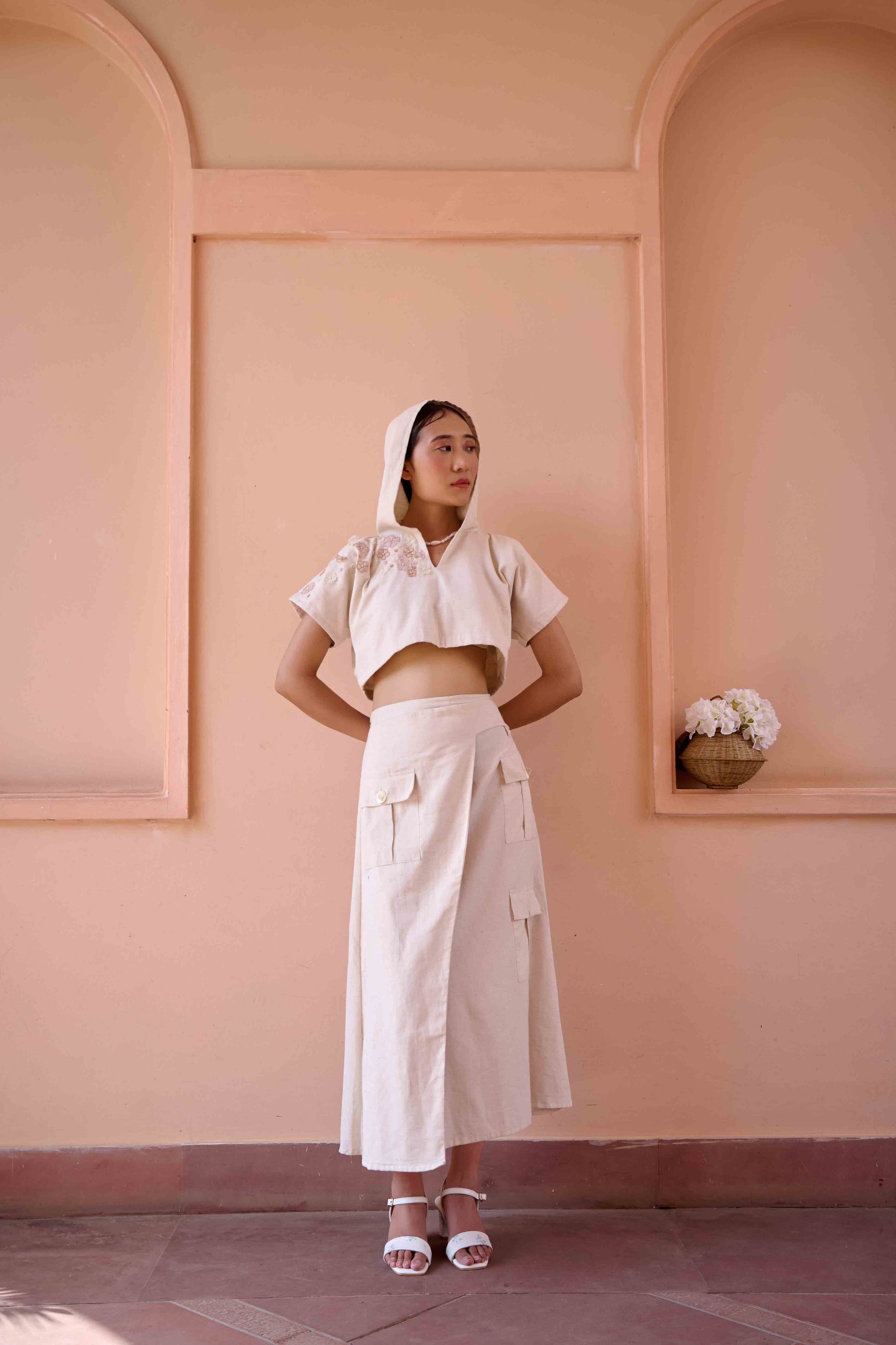 Introducing our Hooded crop Top adorned with beautiful organza flower details, a perfect blend of comfort and elegance. The hooded design adds a casual yet chic touch, while the intricate organza flowers elevate the top with a touch of sophistication and texture. Paired with our Multi-Pocket Wrap Skirt, this ensemble combines practicality with style. The wrap skirt features multiple pockets for added functionality and a contemporary flair, making it versatile for both casual outings and more polished occasions.