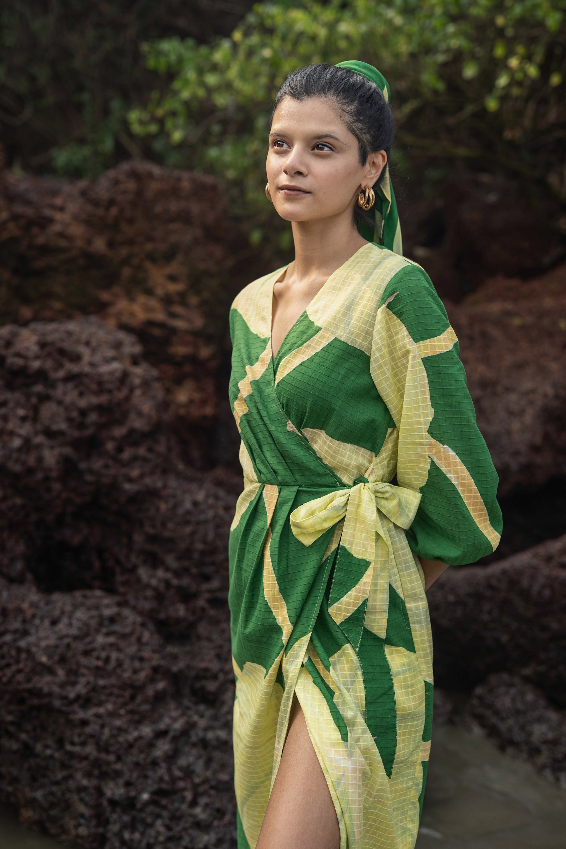 The Eka wrap dress is made from our Cotton chequard slub fabric with paan print. It has a pleat detailing at the waist and elasticated at the back.