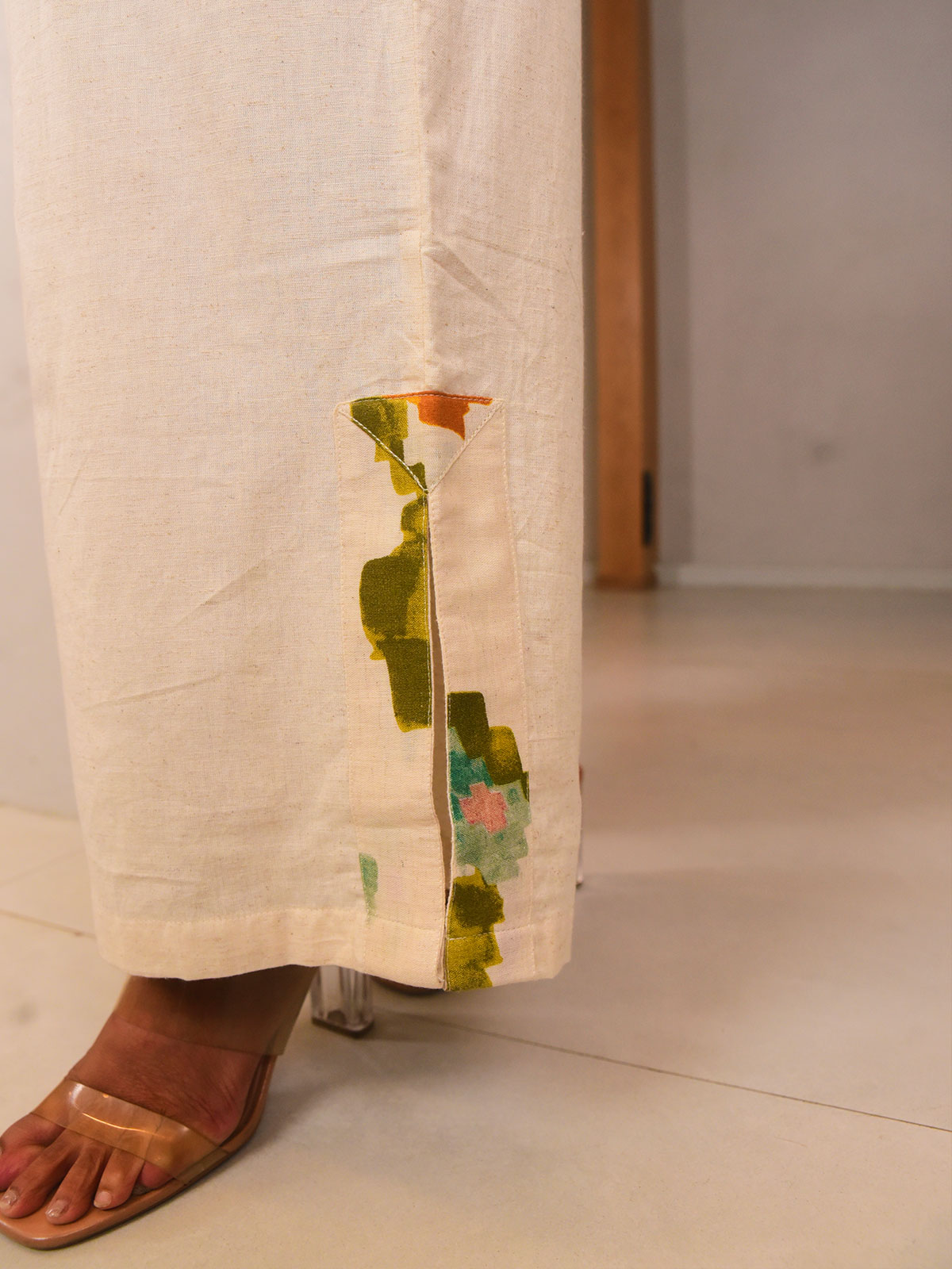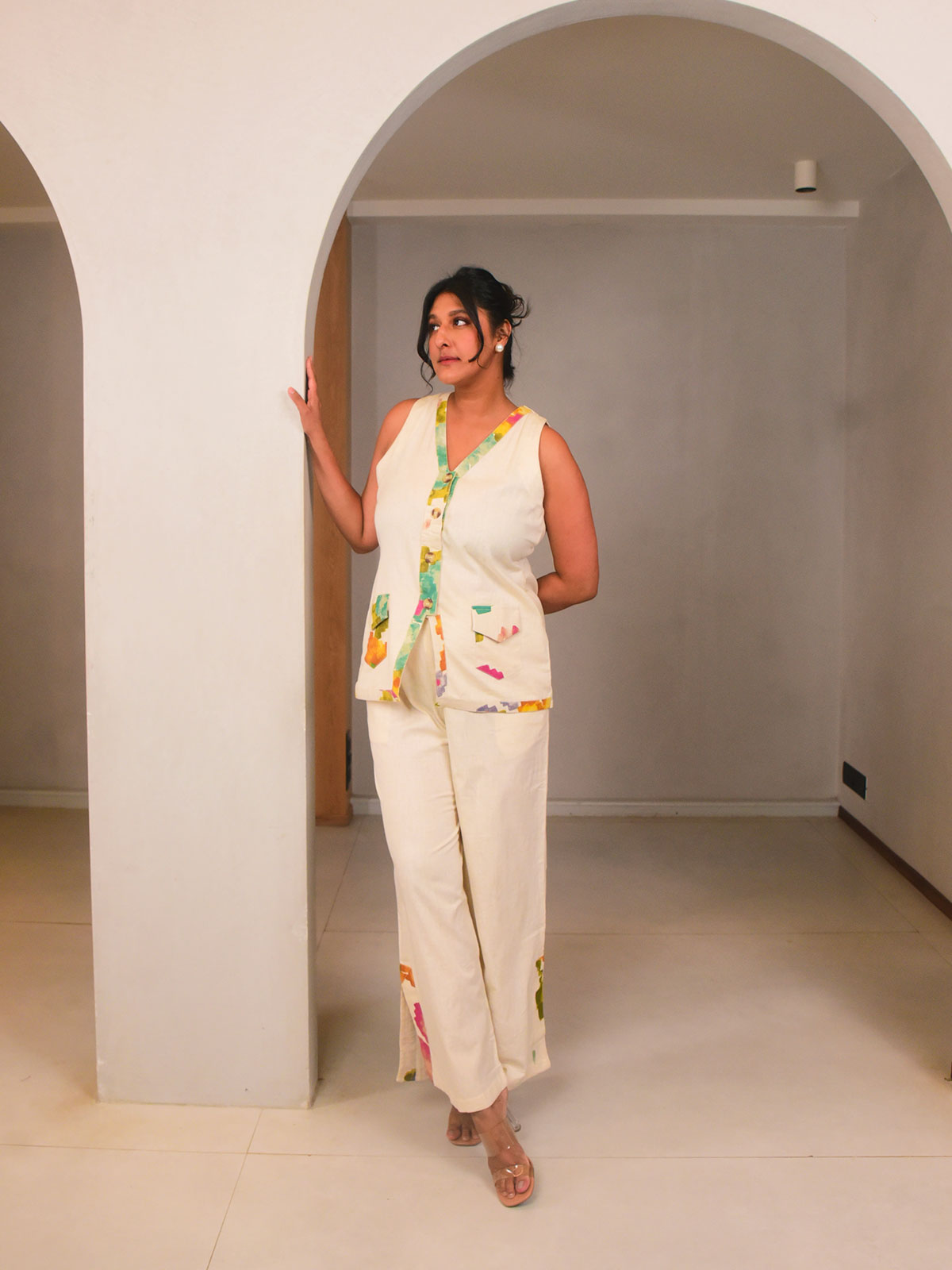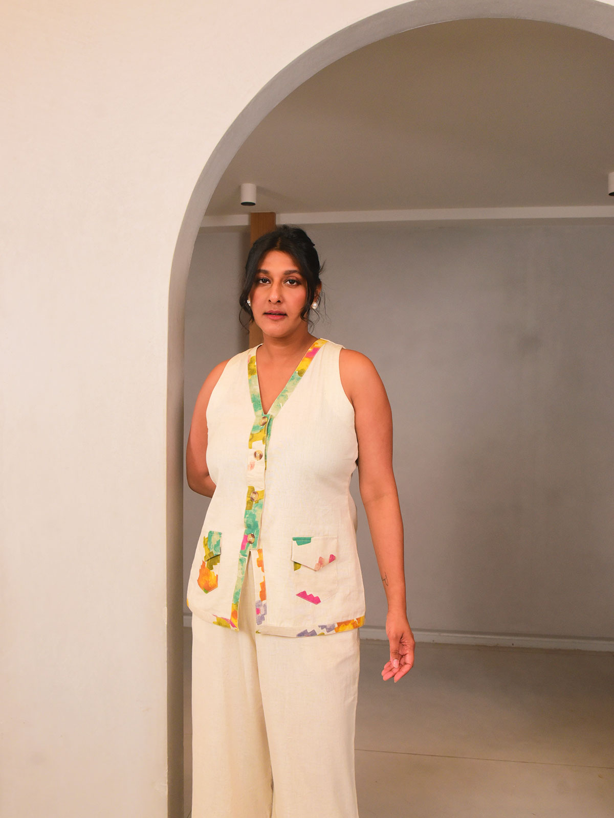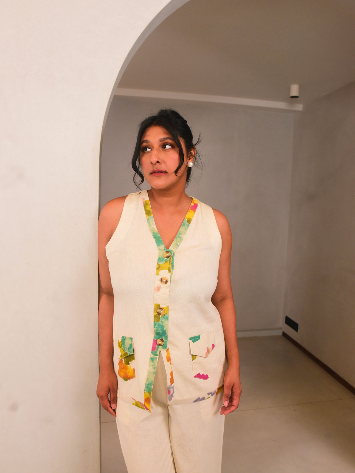 This tailored co-ord set pairs a sleeveless long vest with flap pockets and structured straight-fit pants, both crafted in beige linen-cotton with panels of our exclusive cream floral print. The pants are high-waisted and elasticated for comfort. A refined yet easy-going option, ideal for creative workdays, team meetings, or low-key formal outings.