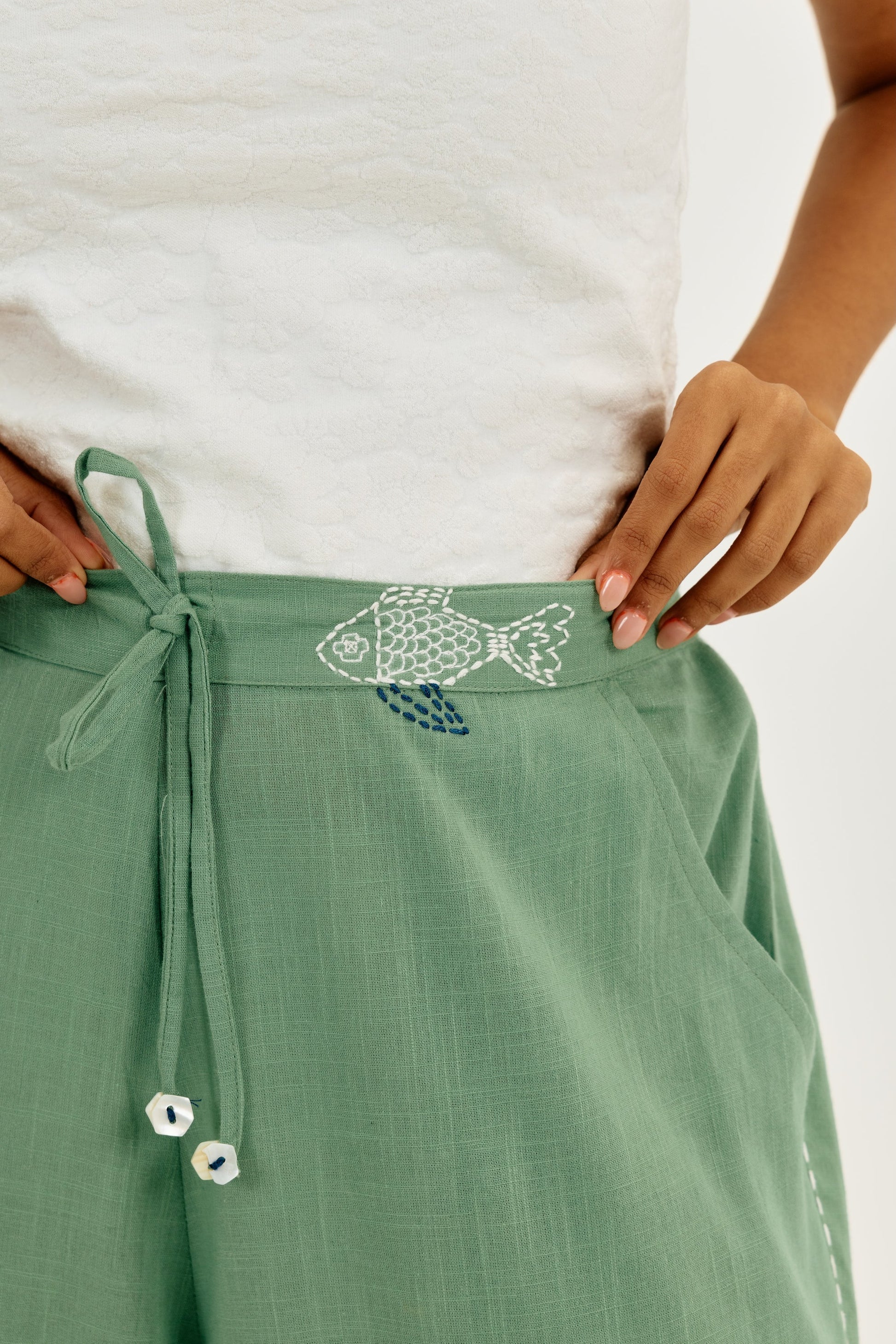 Made in breathable cotton, these wide-leg pants are all comfort with a touch of whimsy. Finished with scalloped hems, fish hand-embroidery on the waist, and tiny appliqués near the ankle, plus a drawstring waist for an easy fit.