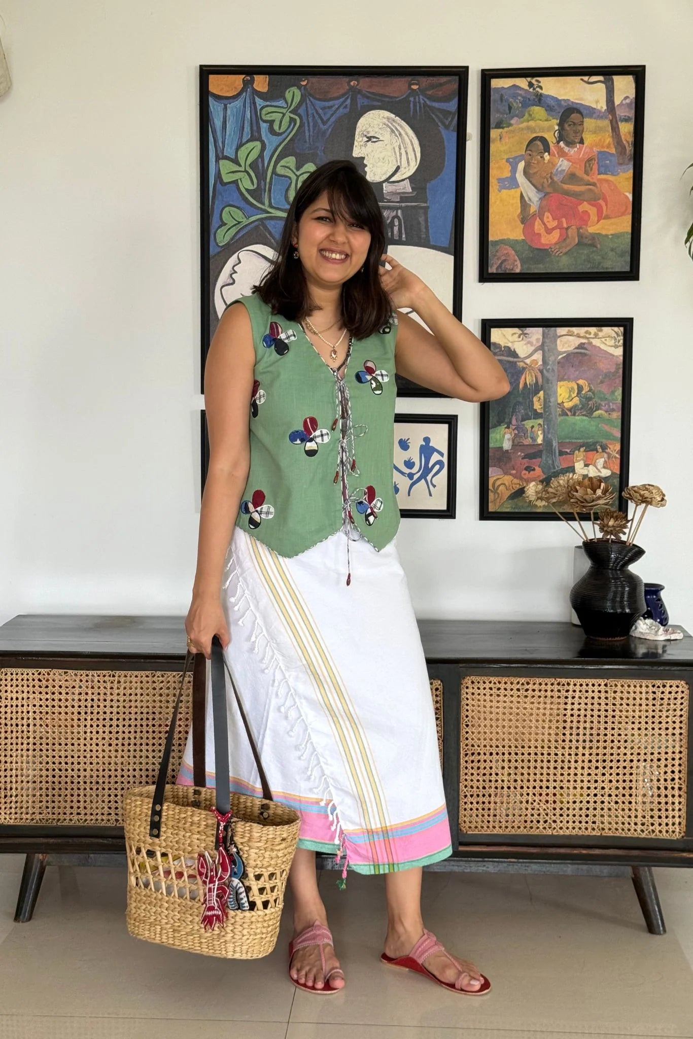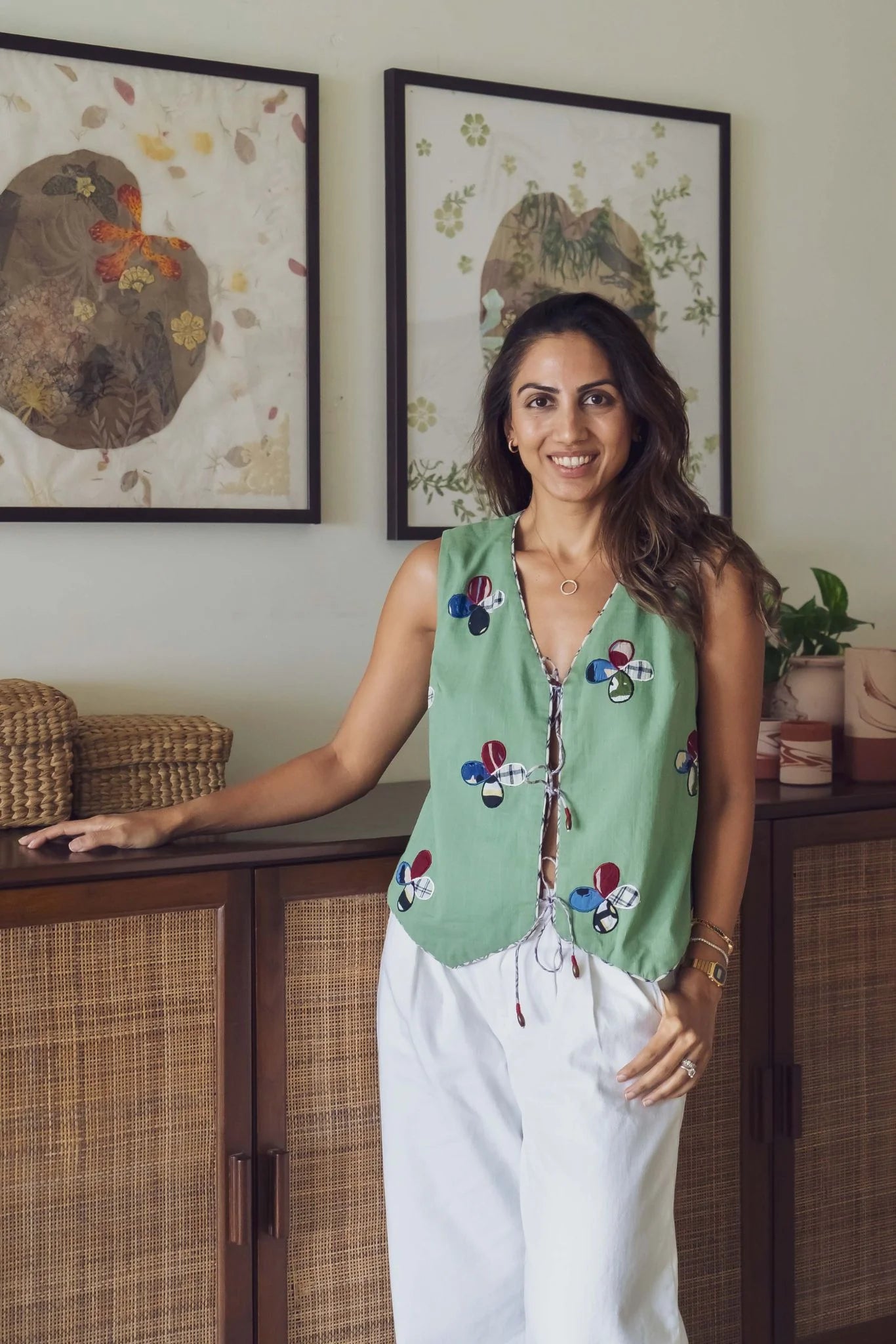 Crafted in breathable cotton and hand-dyed in seafoam green, this waistcoat features whimsical hand-cut appliqué floral motifs in bright pops of red, white, and blue—this piece is finished with a charming tie-up front and playful scalloped hem.