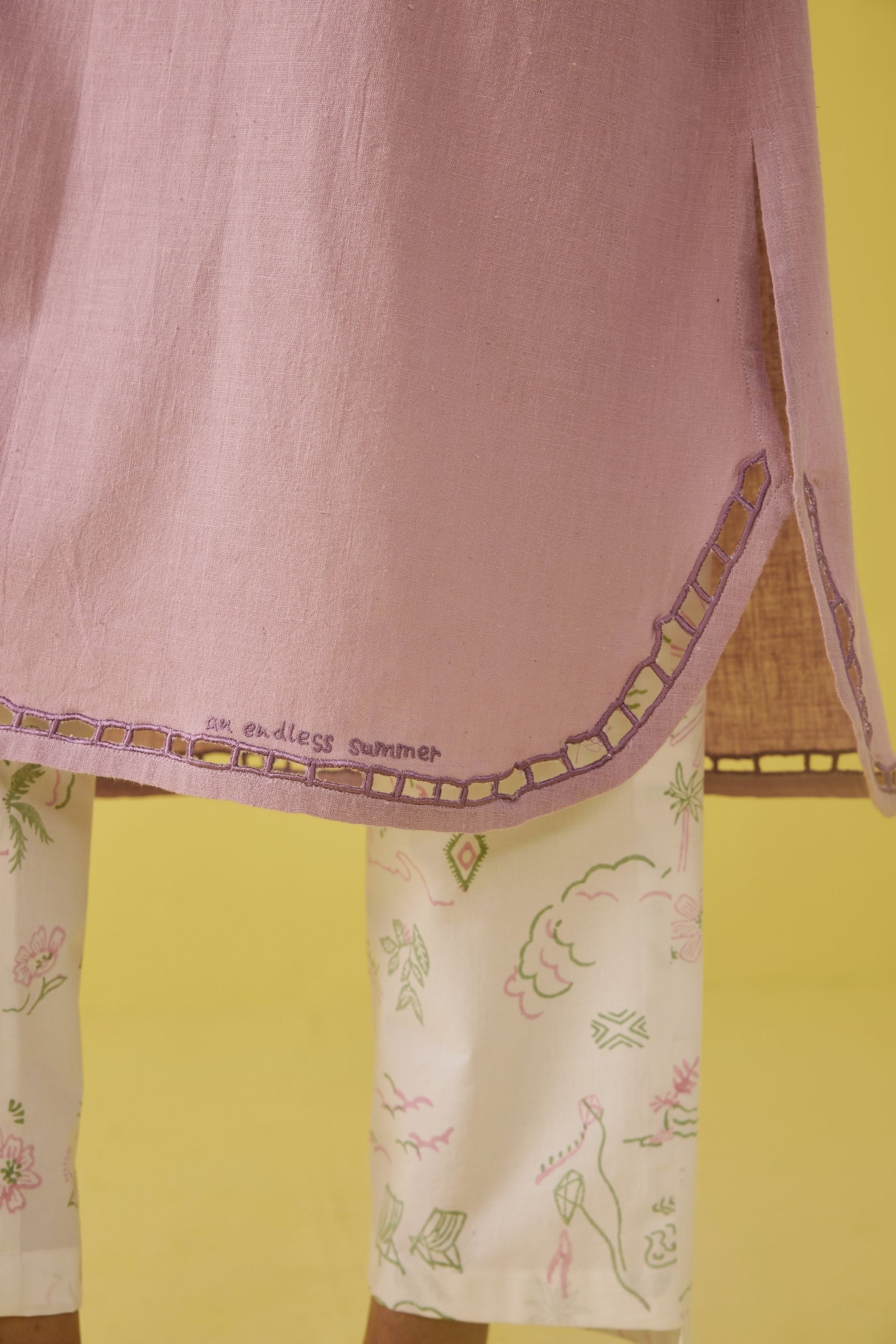 Relaxed fit, wide three-quarter sleeve, v-neck, full length kurta top crafted in azo-free dyed handwoven Kala cotton fabric, machine embroidered with flower motifs.