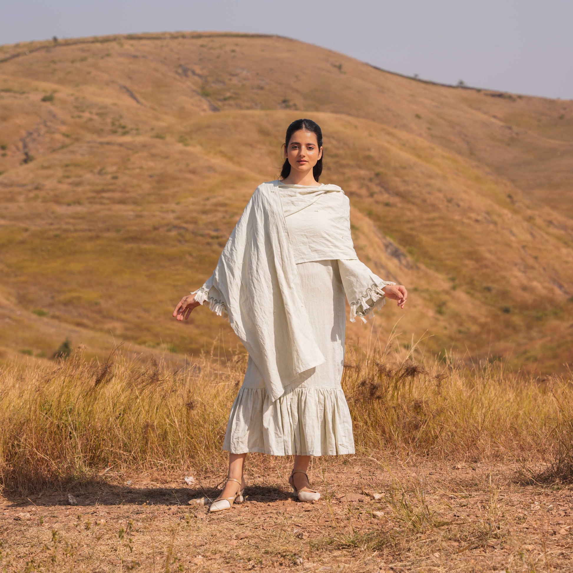 The embroidery detail on the yoke and puffed sleeves accentuates its feminine allure, while knots on the neckline and sleeves add a playful and stylish accent. A standout feature is the addition of tassels with crochet flower details, creating a whimsical and intricate focal point.