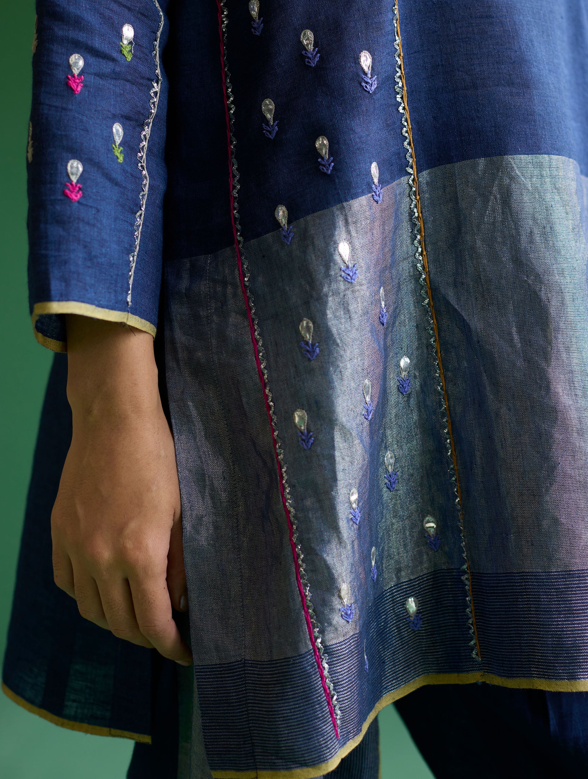 A paneled short kurta with 3/4th sleeves in our signature yarn-dyed soft handloom metallic border linen with a grey stripe border weave and grey colored selvedge. The kurta is intricately hand-embroidered with zardozi and gotapatti with a mix of metallic and multicolor threads.