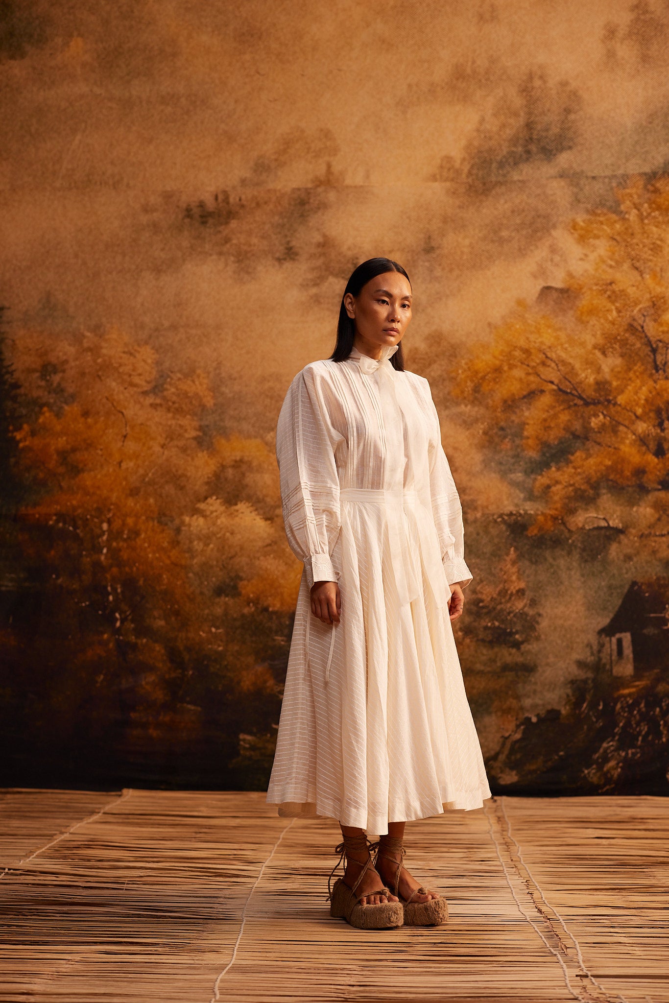 An embodiment of fluid elegance, the Enso Stripe Skirt is crafted from screen printed Chanderi, creating graceful movement with every step. The subtle stripes add a timeless sophistication, while the partially elasticated waistband ensures a comfortable, flattering fit. Designed for versatility, this skirt transitions seamlessly from day to evening—pair it with a tucked-in blouse for a polished look, or style it with a relaxed sweater for effortless charm.