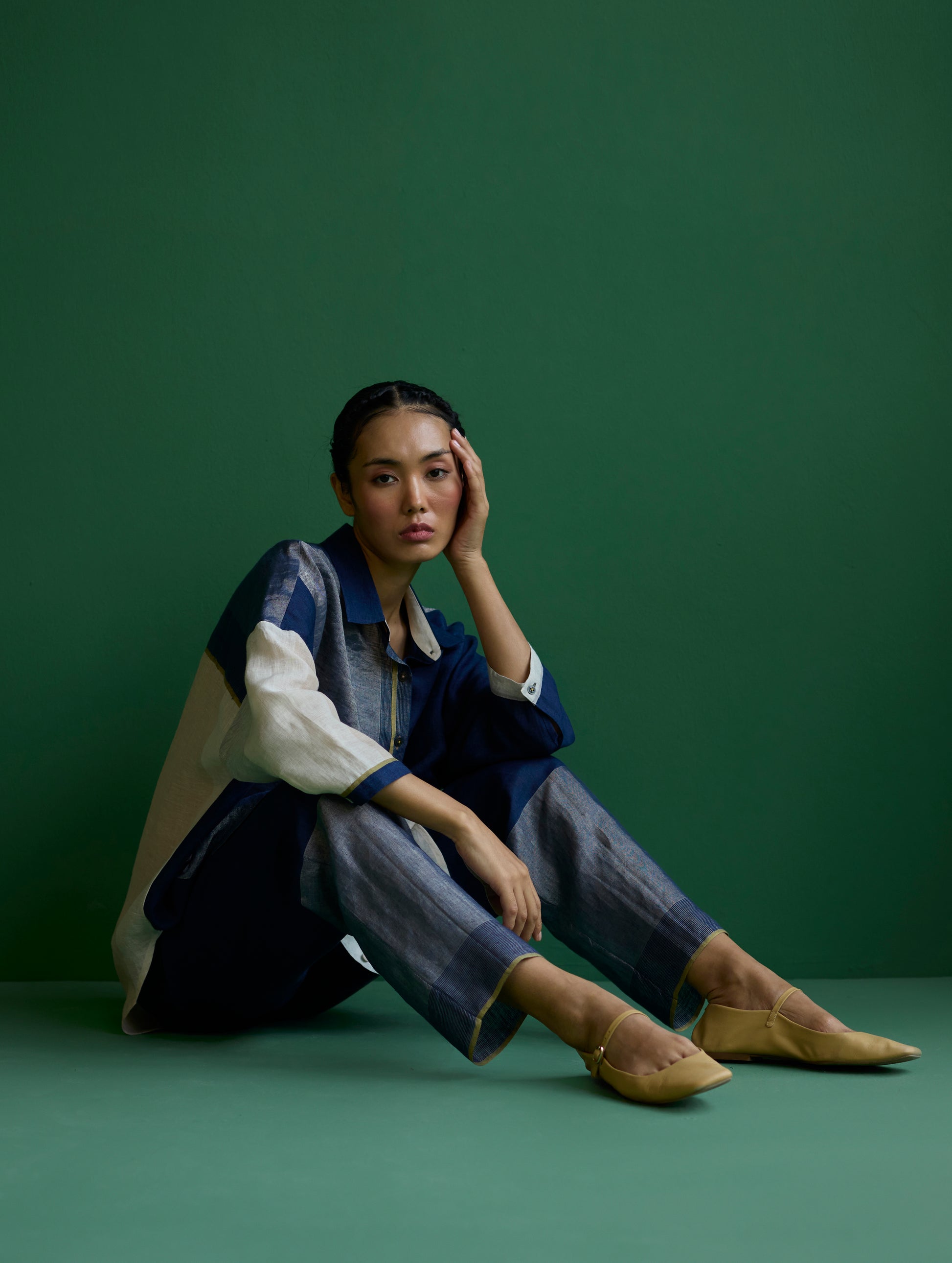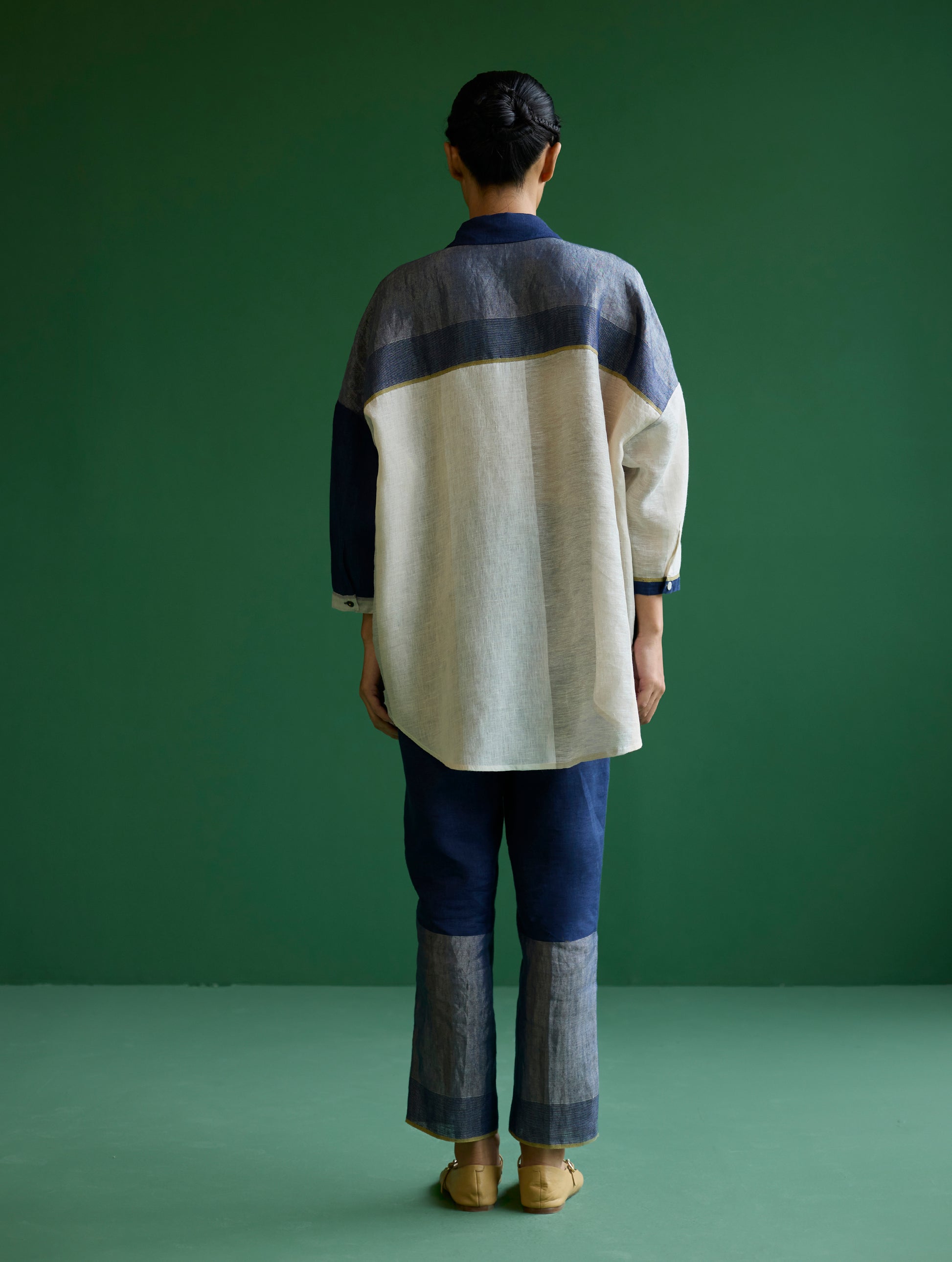 Shirt - A chic, flared, color-blocked shirt with dolman sleeves, crafted from our signature soft handloom metallic border linen in shades of ivory and navy. The design features a self-woven pop-colored selvedge and is detailed with metallic brass buttons and linen fabric-covered buttons accented with pop-colored threads.