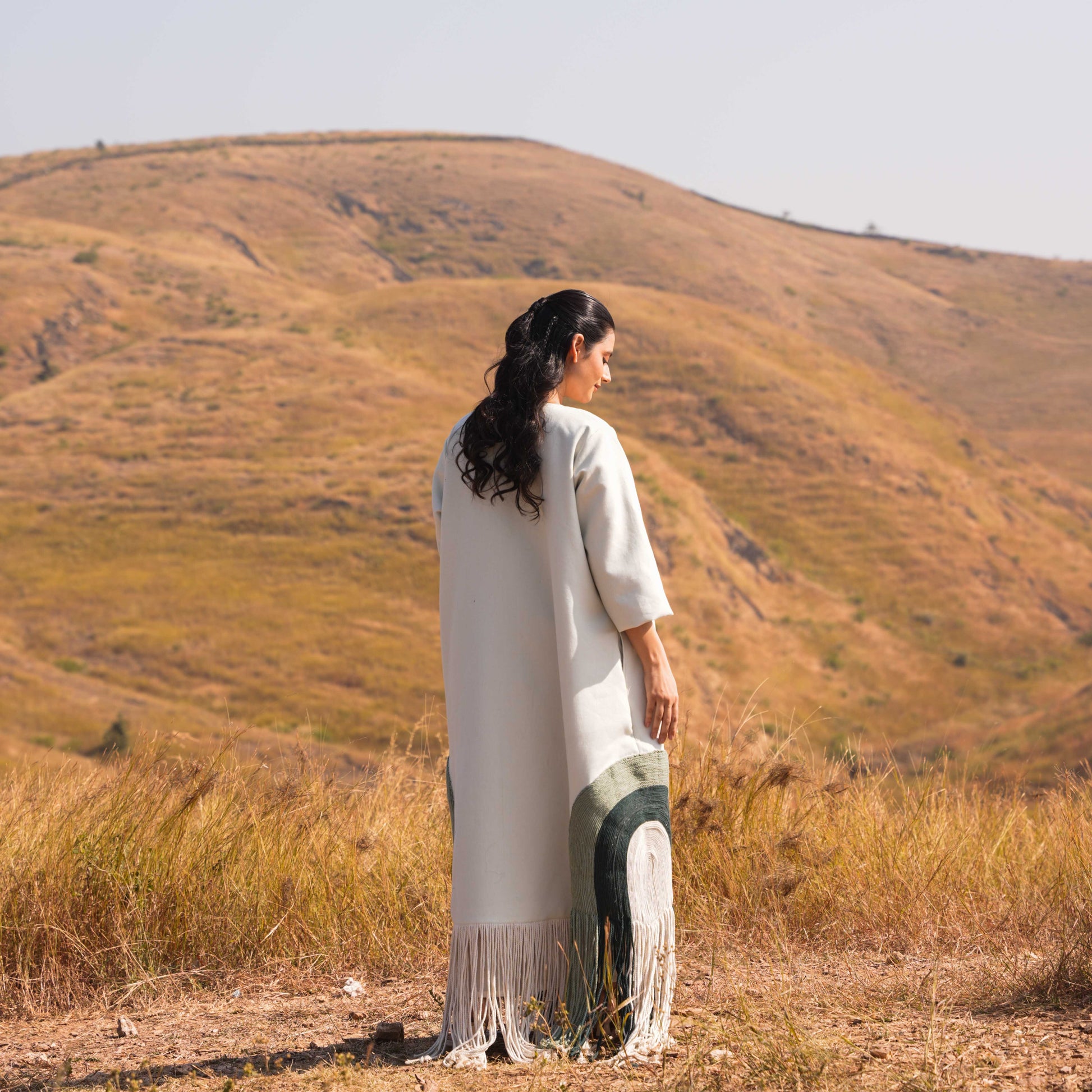 Intricate shoulder-to-sleeve lace detailing adds a touch of femininity and grace, while embroidered buttons along the neckline offer a polished finish. A standout feature of this dress is the tassel detailing on the back yoke line, adding whimsical charm and a unique focal point to the ensemble