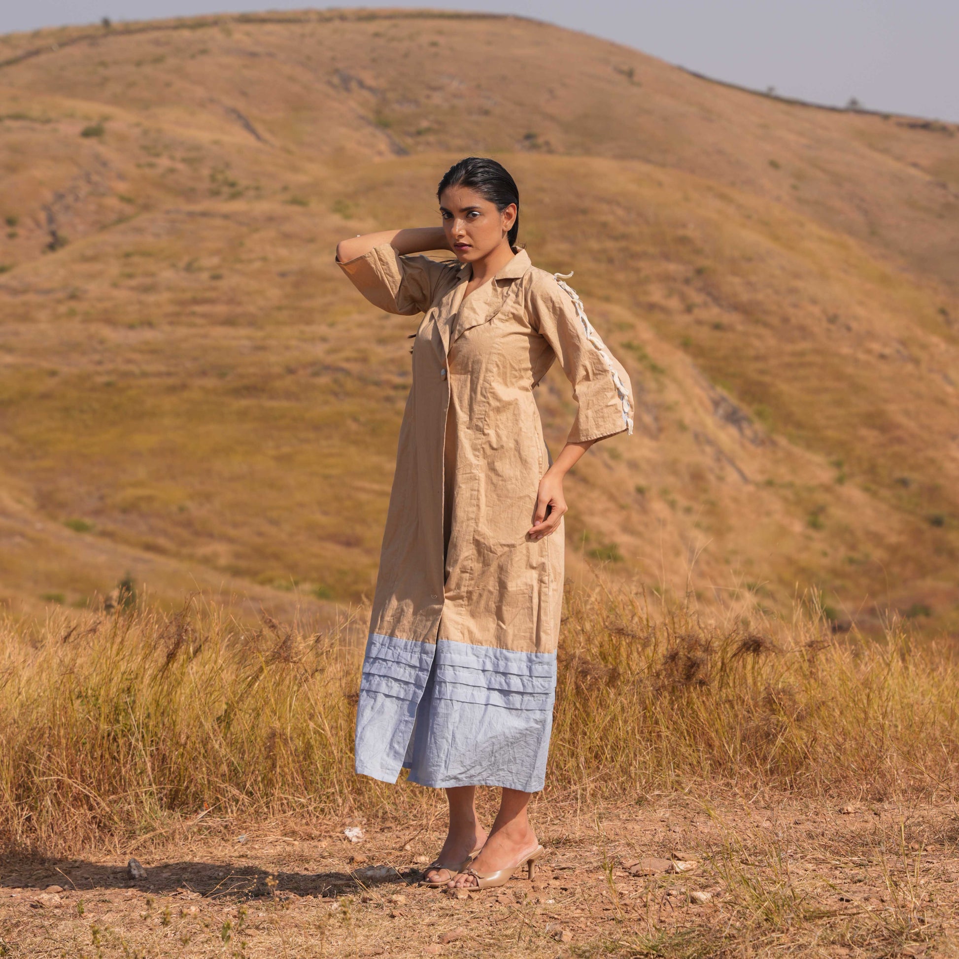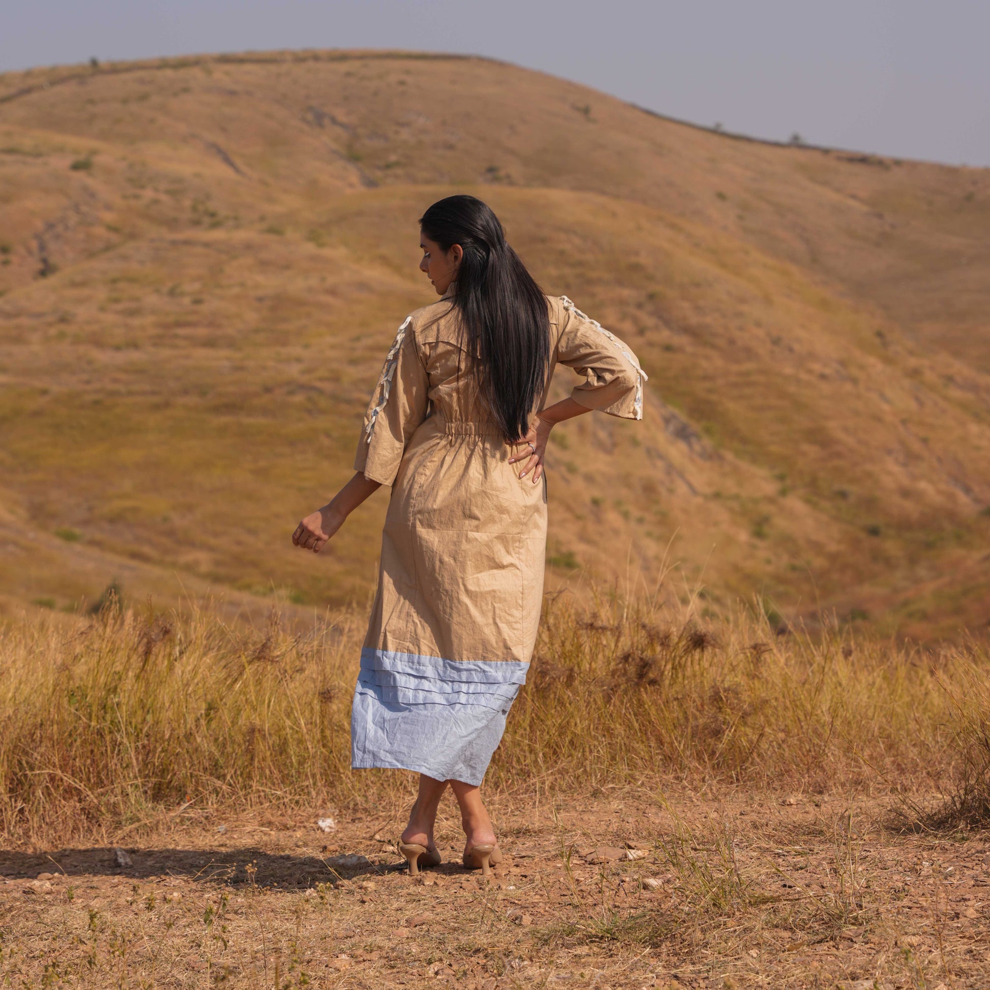 Intricate shoulder-to-sleeve lace detailing adds a touch of femininity and grace, while embroidered buttons along the neckline offer a polished finish. A standout feature of this dress is the tassel detailing on the back yoke line, adding whimsical charm and a unique focal point to the ensemble